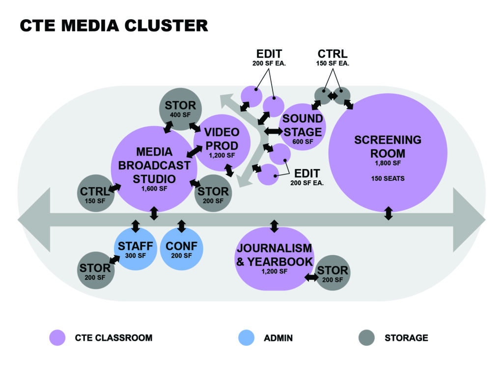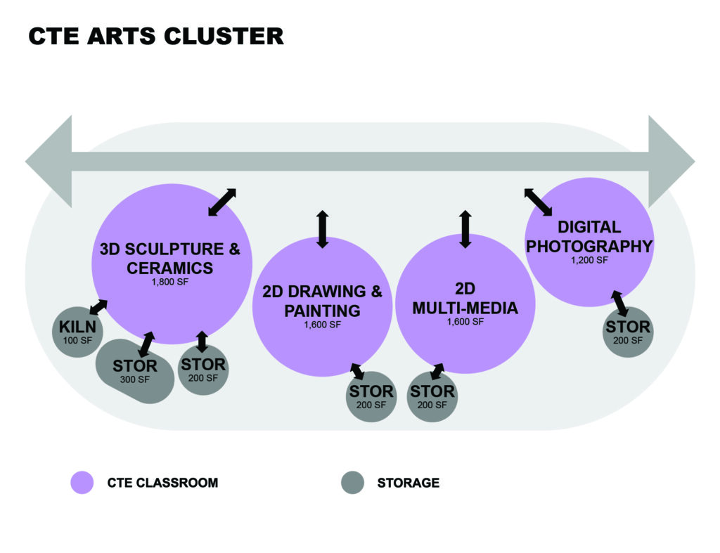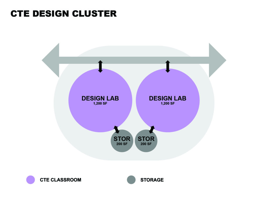 Design Objectives: Provide real-world environments mirroring industry practices; support individual and group project-based learning; enable storage and maintenance of specialized equipment safely and efficiently; ensure infrastructure is scalable and aligned to evolving industry-standard utilities and technologies. Support shared use models, dual enrollment, and pathway alignment with post-secondary and community partners. Ensure full inclusiveness in CTE access, with designs supporting learners with diverse physical, linguistic, and academic needs.