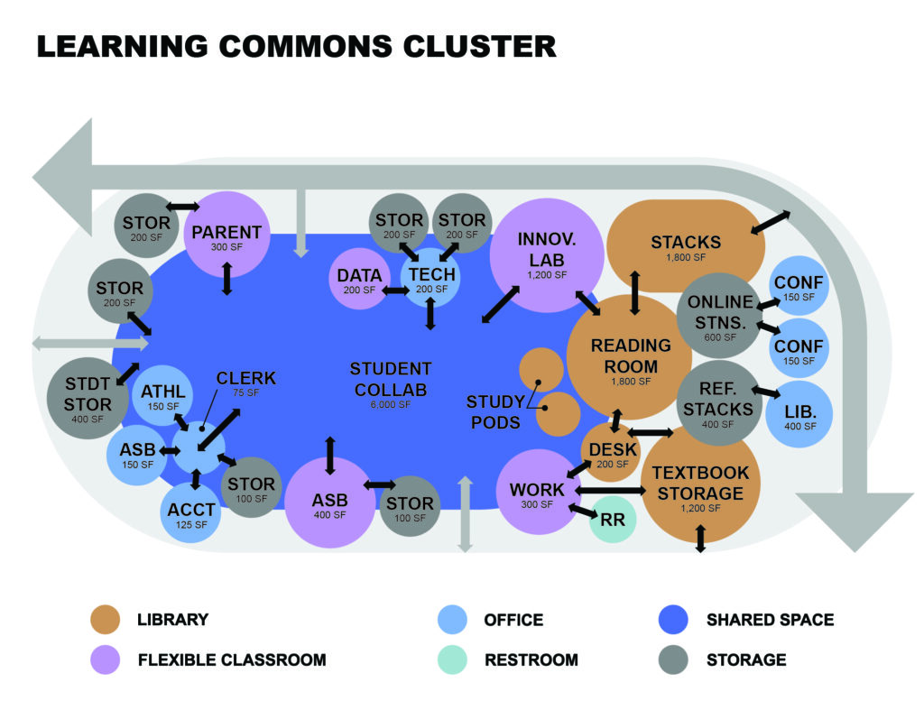 Design Objectives: Support independent research, peer collaboration, digital literacy, and multimedia production; create a hub of activity and academic support; integrate traditional literacy with future-ready learning; redefine libraries as flexible, collaborative learning environments. Address student needs for “third spaces” to decompress, transition between activities, and engage in informal learning through library lounge and breakout zones. Design shall support full accessibility and inclusion for all students.