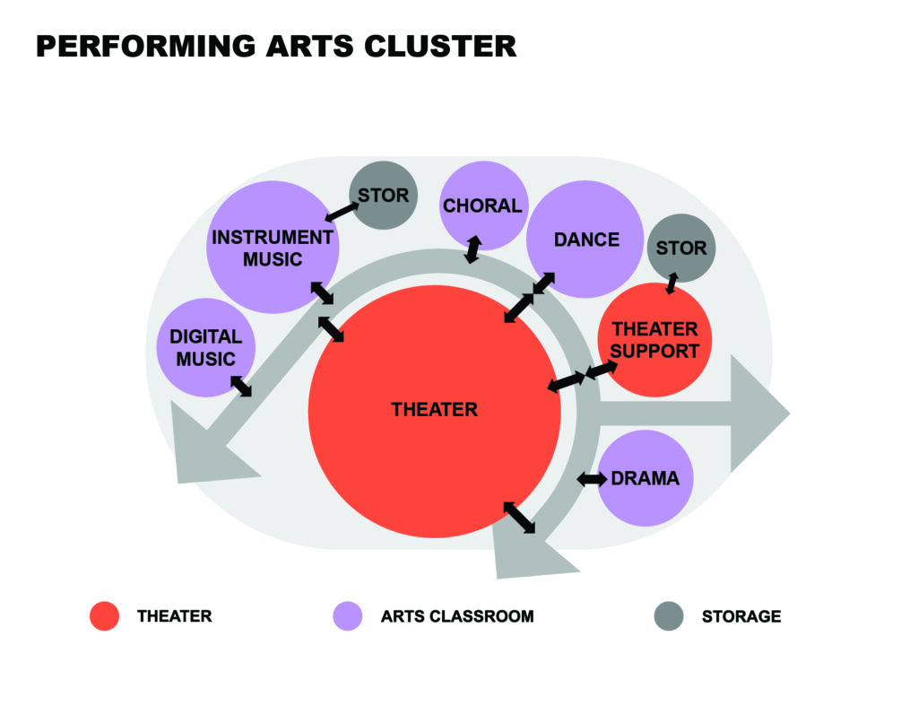 Design Objectives: Enable professional-level performances and curriculum-aligned activities; serve both school and community use; support collaboration among disciplines (music, drama, digital arts). Ensure equitable access to performance spaces and foster community-building through the arts. Provide inclusive design that accommodates all performers and audience members, including those with mobility and sensory needs.