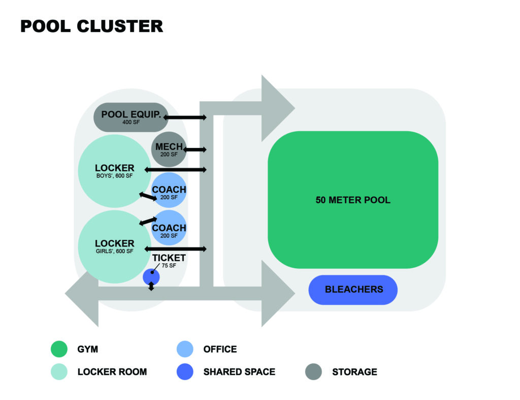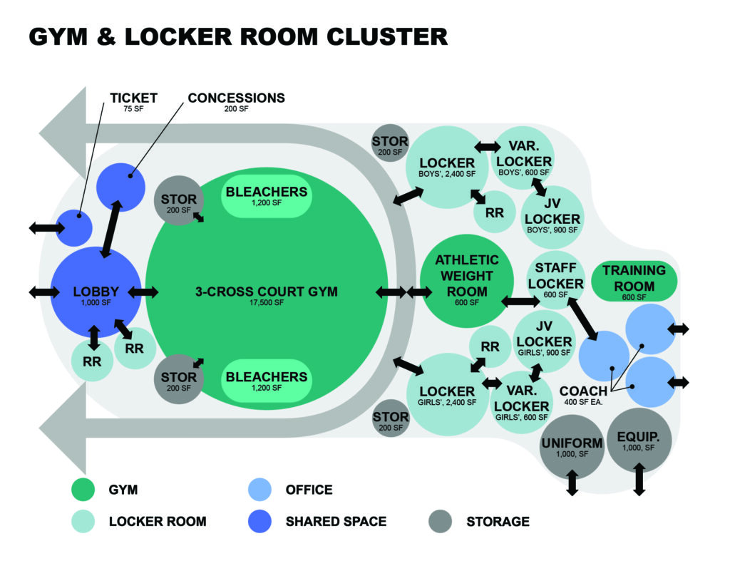 Organization: Clear wayfinding between indoor and outdoor athletic zones; storage for PE and team equipment; integration with locker rooms and trainer areas; separation of community-use access from school-only zones.