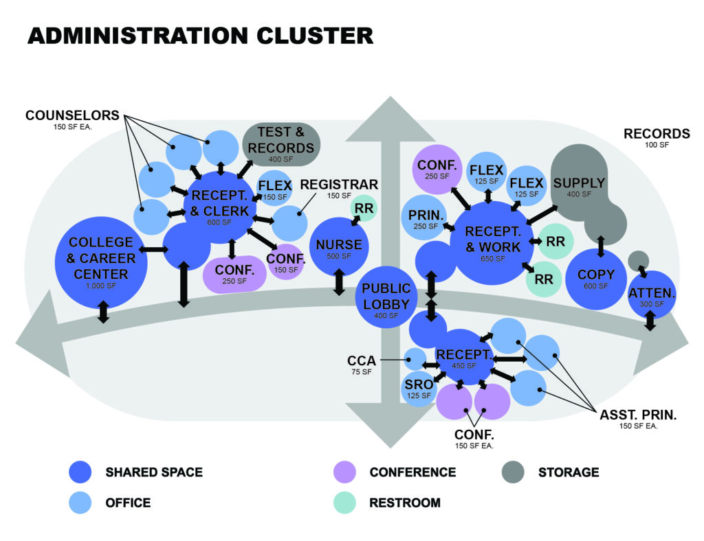 Organization: Clear public and private zones; direct access from site entry; visual control of main entry; adjacency to counseling and student services; access to staff lounge, copy room, and meeting areas.