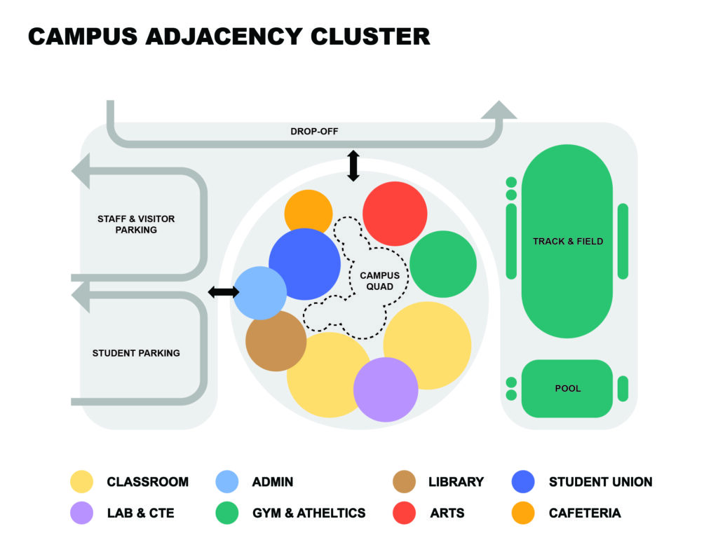 Organization: Entry plazas with secure access; defined bus, car, and bike circulation; visible and ADA-compliant routes to major indoor and outdoor zones; integration of natural shade, social areas, and outdoor learning with academic areas.