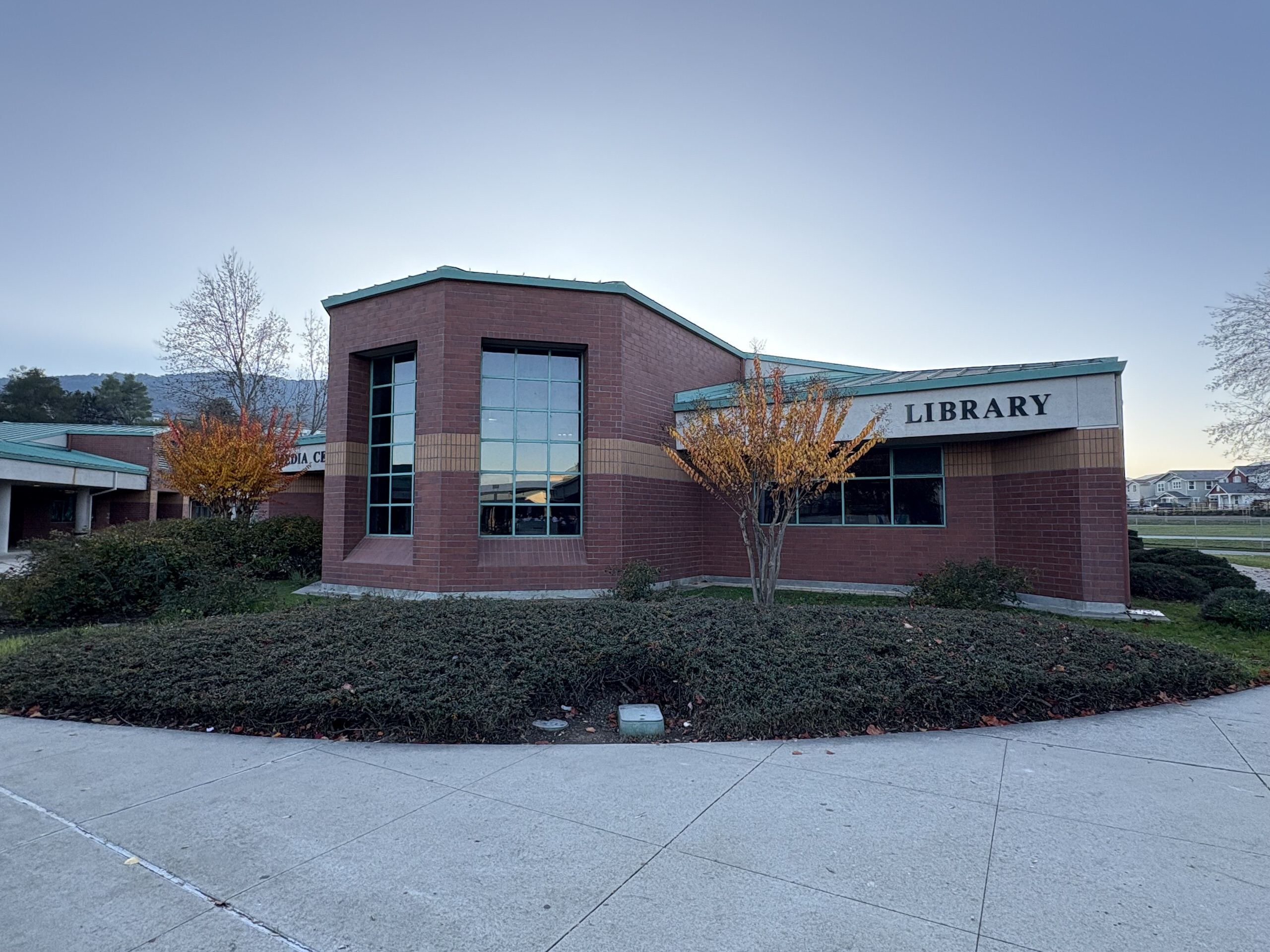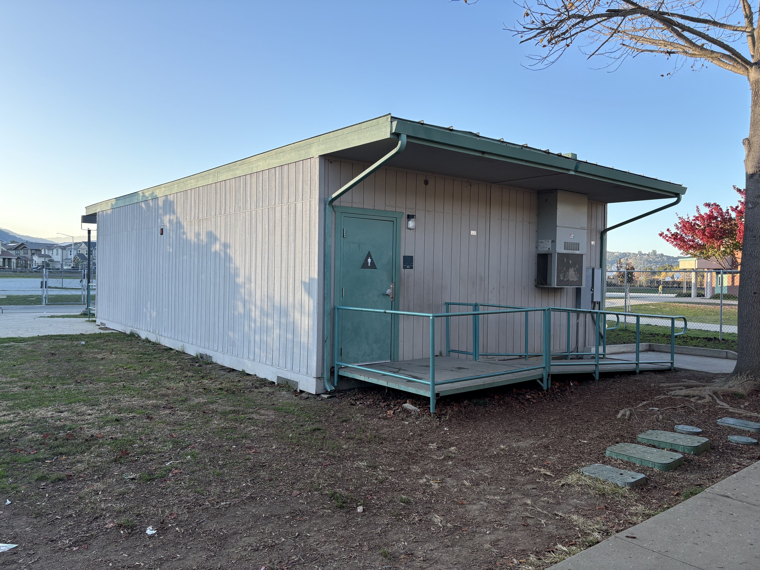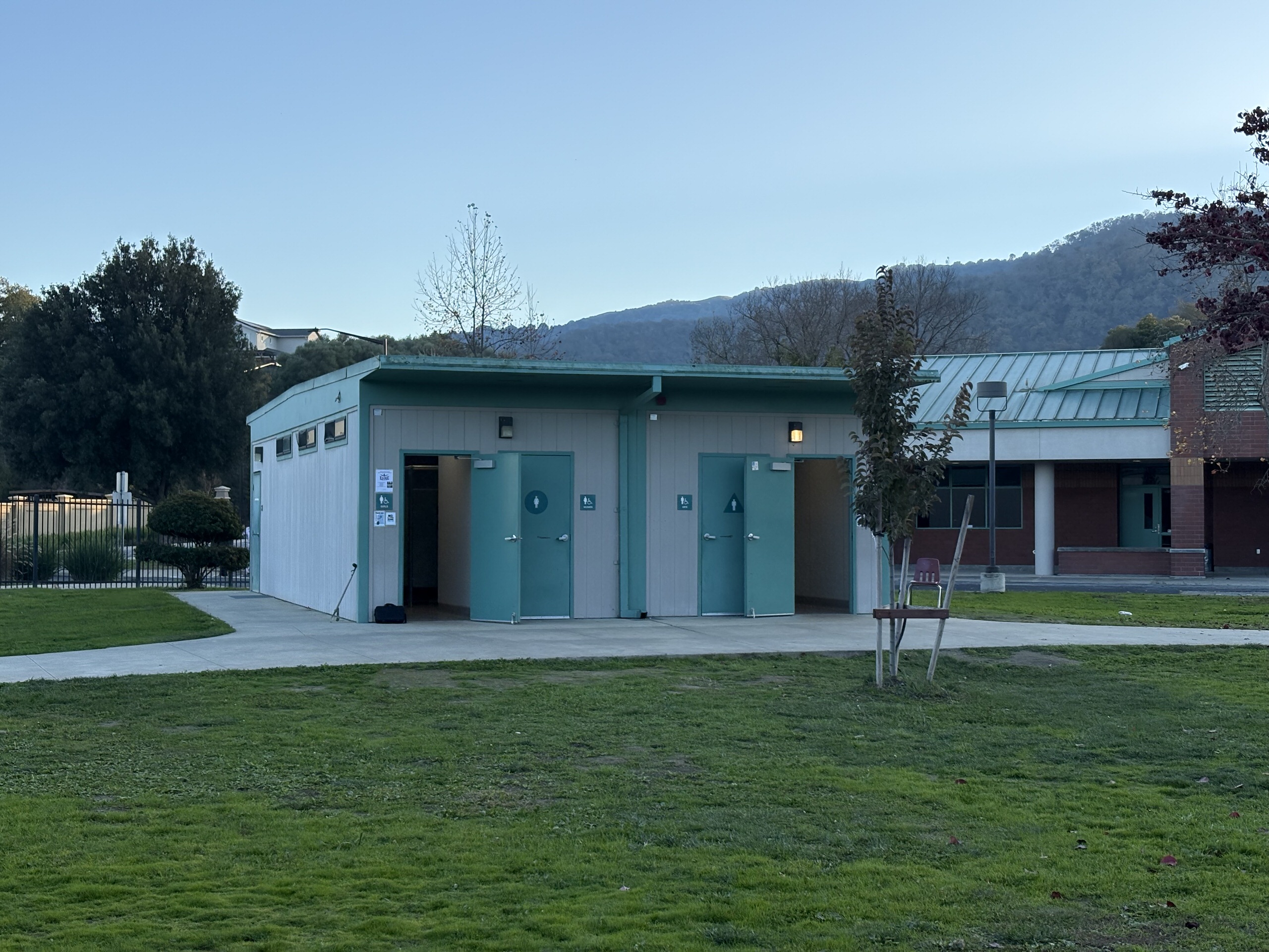 Located on the north side of the campus, the multi-purpose building is accessed through a large outdoor gathering and eating area. The interior features high ceilings, clerestory windows with window covering, acoustic and tackable wall panels, and a stage with theater capabilities. A kitchen occupies the east side of the building, supported by a service driveway from Grenache Way. Locker rooms are located on the west side of the structure and within an adjacent portable; however, these spaces lack restrooms, sinks, and adequate storage, limiting full functionality.