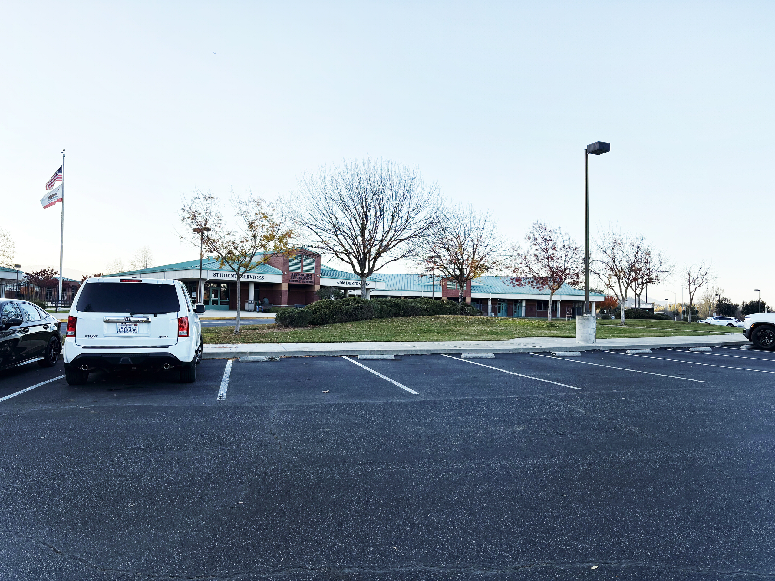 Ascencion Solorsano Middle School is organized around a central outdoor quad, with permanent classroom buildings arranged in a radial configuration connected by concrete walkways. Planter areas with mature trees and outdoor seating are distributed throughout the site. The administration building is located east of the quad, with the main entrance oriented toward the parking and drop-off zone at Grenache Way and Syrah Drive. The library sits opposite the administration building, fronting the track and field at the rear of the campus. The multipurpose building, gym, basketball courts, and solar shade structures frame the upper campus, while classroom portables are located along the lower campus perimeter. Additional parking is provided along Grenache Way and Syrah Drive. Overall, the campus is in good condition and offers opportunities for enhanced outdoor learning and gathering spaces.