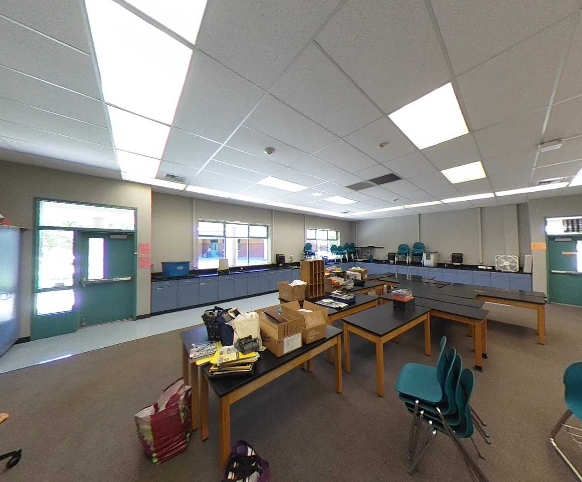 Five main classroom buildings are located near the center of campus, with portables, a music classroom, and a multimedia lab positioned along the southern edge. Buildings feature deep roof overhangs and perimeter windows. Classrooms are brightly decorated with individualized color schemes. In the science classrooms, prep/ storage rooms are shared between two classrooms.