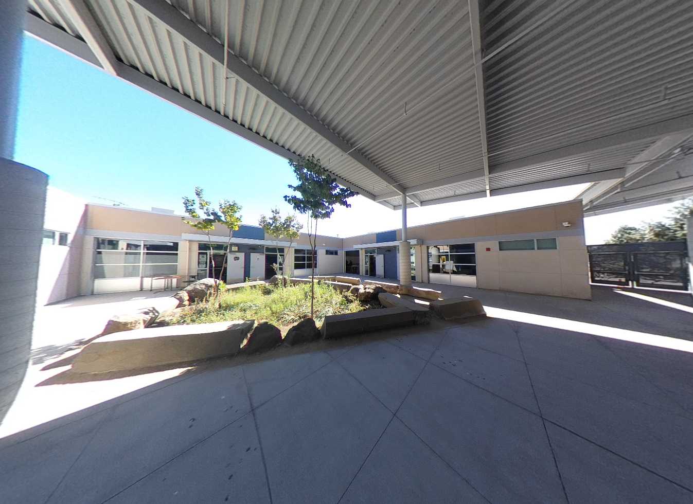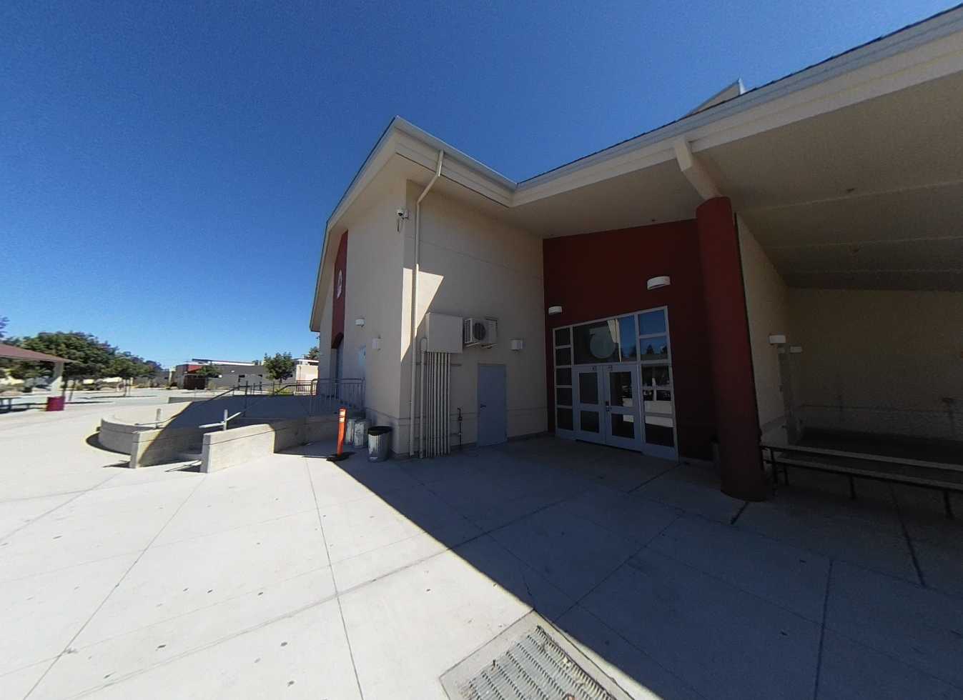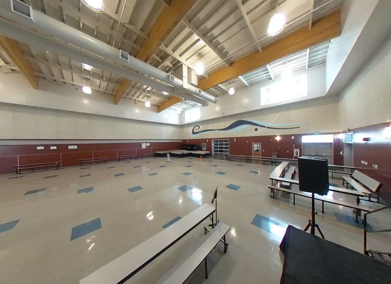 Located on the south end of campus, the multi-purpose building includes a shaded lunch area, two half-court basketball areas, kitchen, restrooms, and a stage with theater capabilities. Interiors feature high ceilings, clerestory windows, acoustic and tackable wall panels. The kitchen and restrooms are in good condition. The multi-purpose room is in fair condition but suffers from poor acoustics and an underperforming sound system.