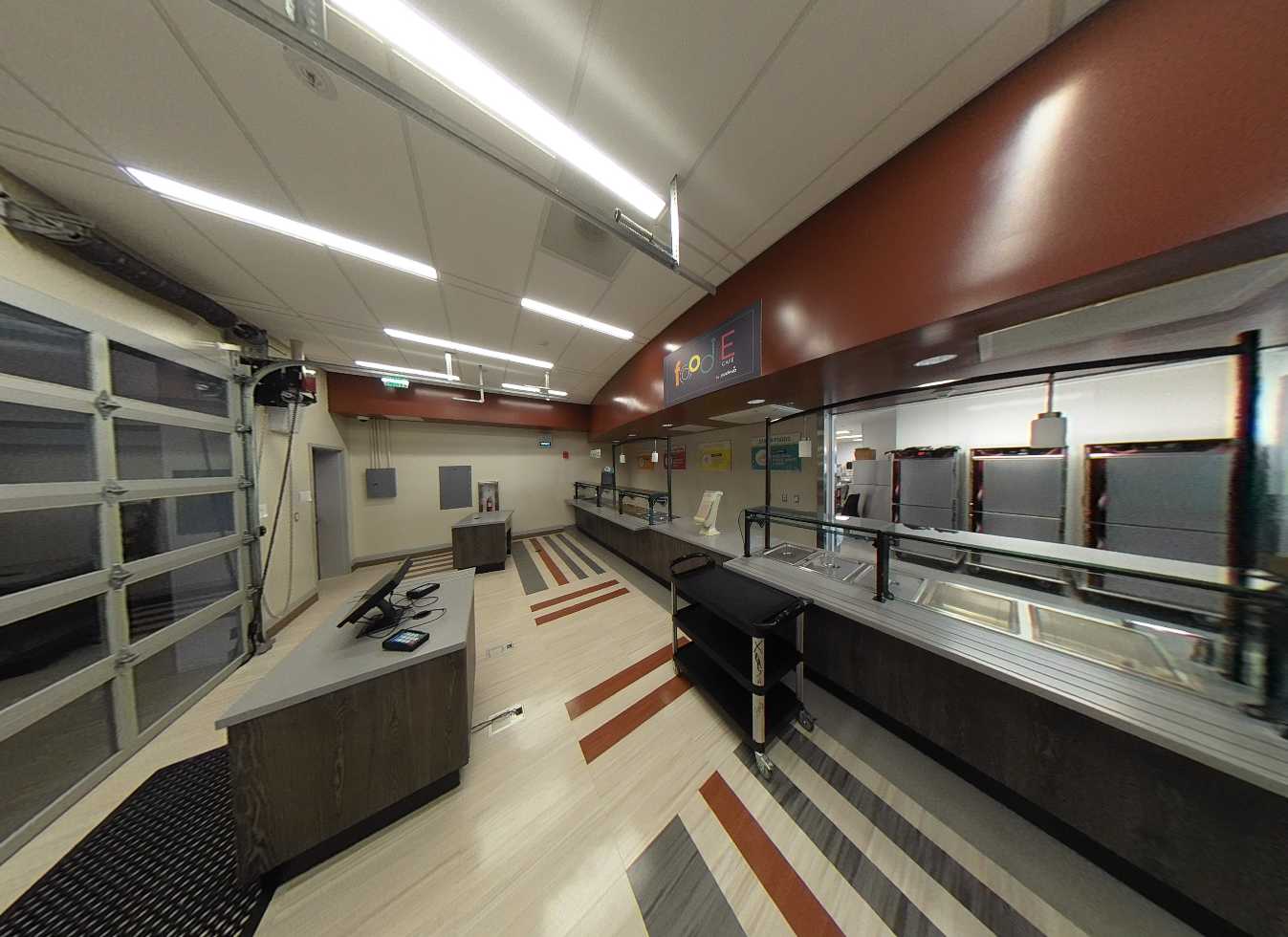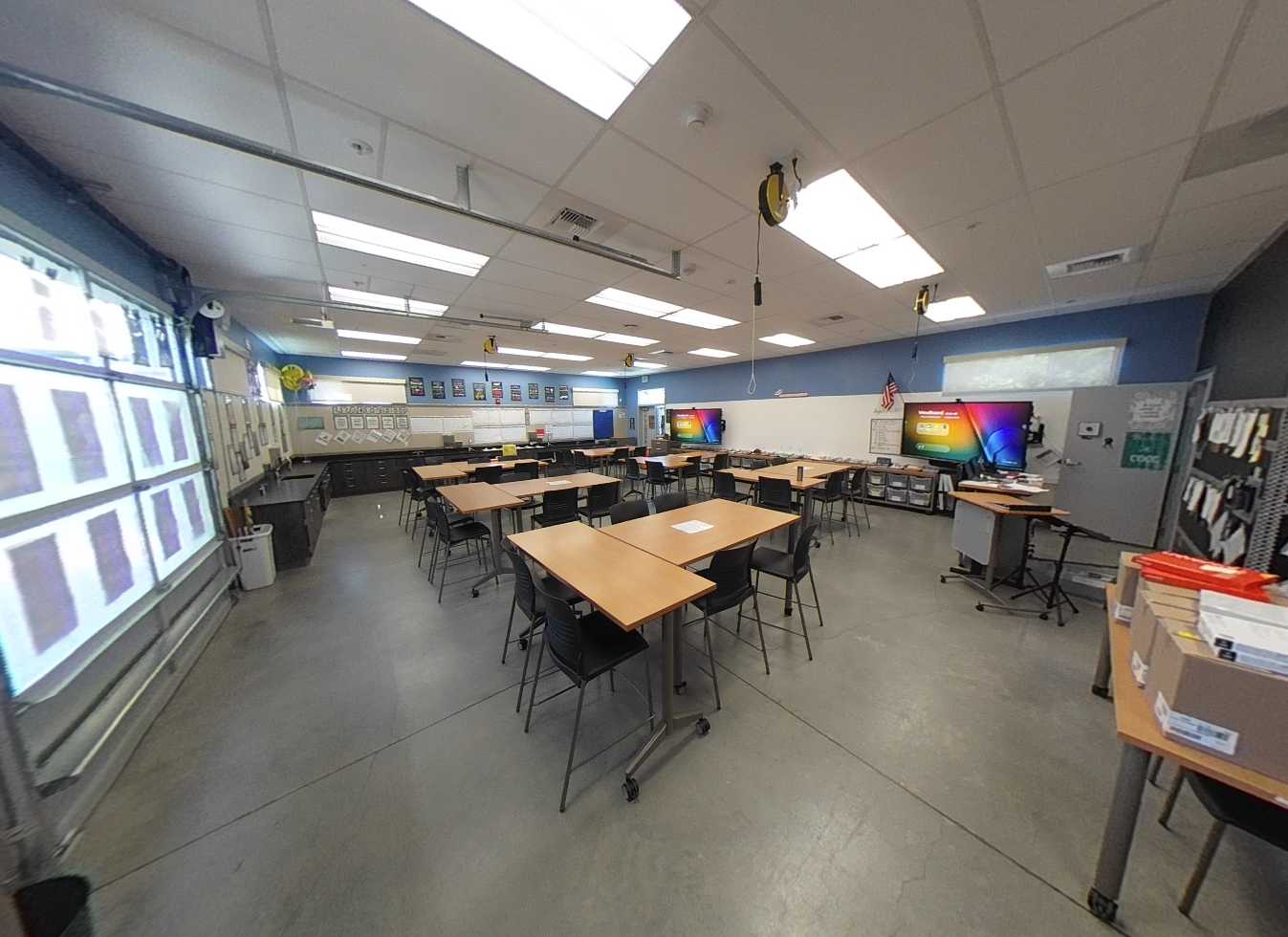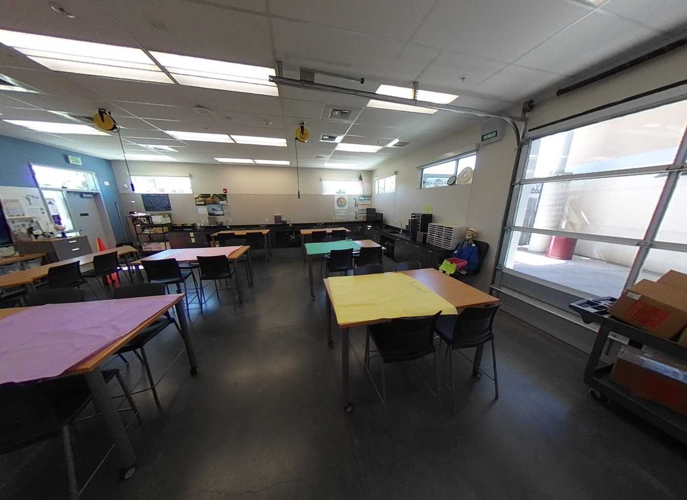 Each of the five classroom pods consist of four buildings surrounding a central courtyard with solar panel structures. Standard classrooms feature carpeted floors, tackable walls surfaces, flexible furniture, and garage-style roll-up doors for indoor-outdoor learning. Each pod includes science or maker spaces with concrete floors, roll-up doors, prep areas, storage casework, and ceiling-mounted cord reel outlets. Minor deterioration of plastic laminate finishes is noted. Restrooms in each pod are accessible and in good condition.