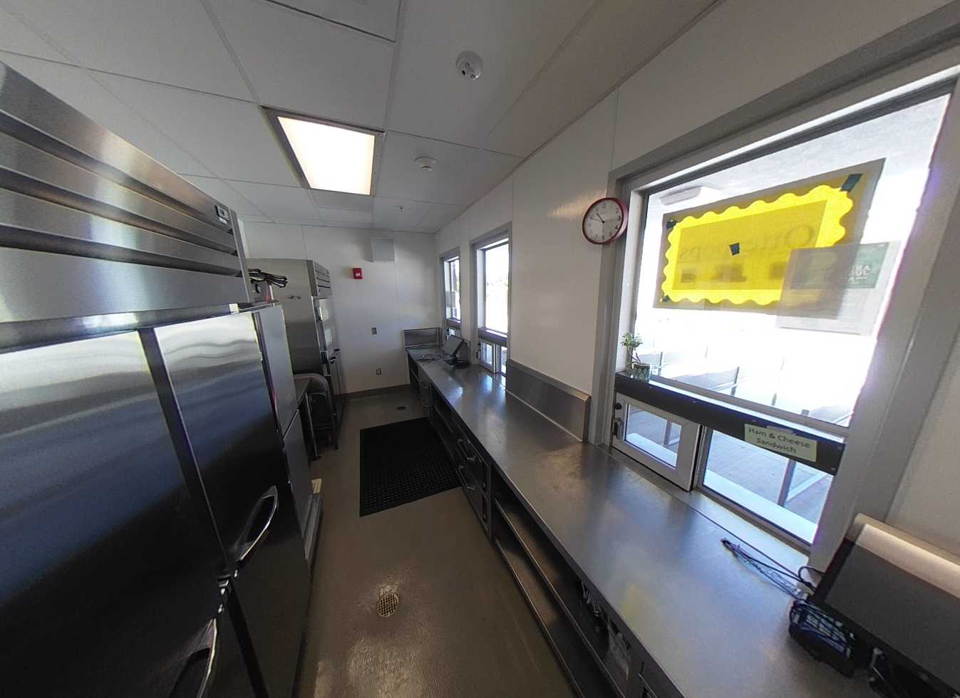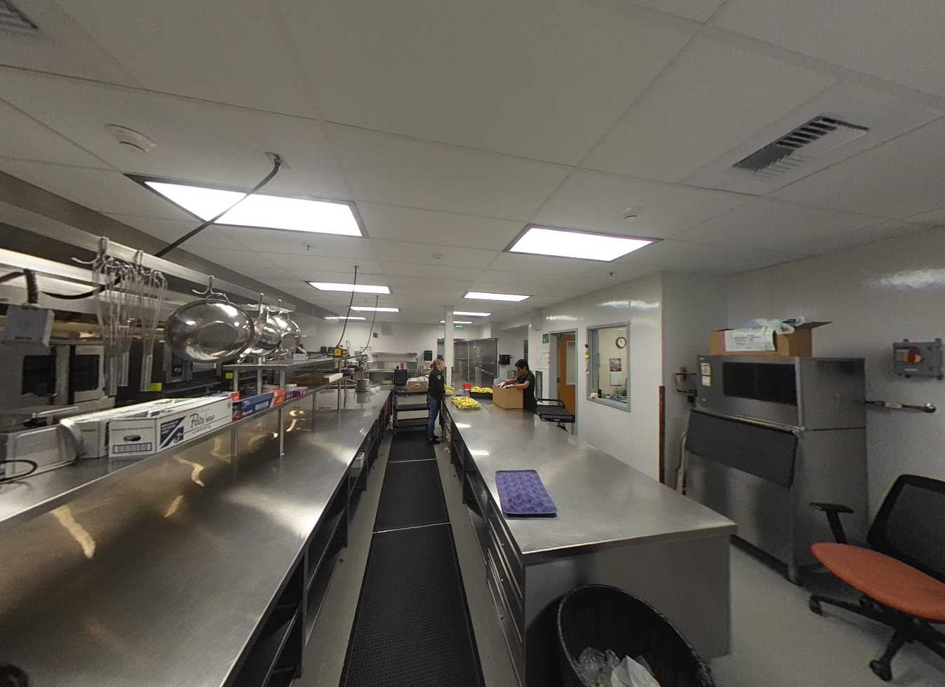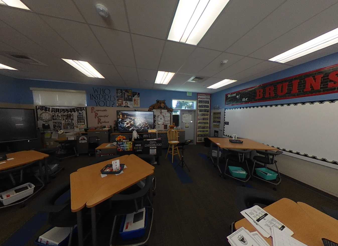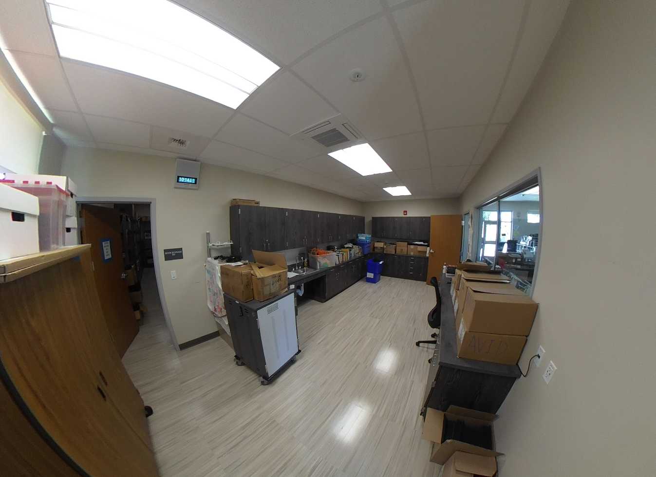 Each of the five classroom pods consist of four buildings surrounding a central courtyard with solar panel structures. Standard classrooms feature carpeted floors, tackable walls surfaces, flexible furniture, and garage-style roll-up doors for indoor-outdoor learning. Each pod includes science or maker spaces with concrete floors, roll-up doors, prep areas, storage casework, and ceiling-mounted cord reel outlets. Minor deterioration of plastic laminate finishes is noted. Restrooms in each pod are accessible and in good condition.