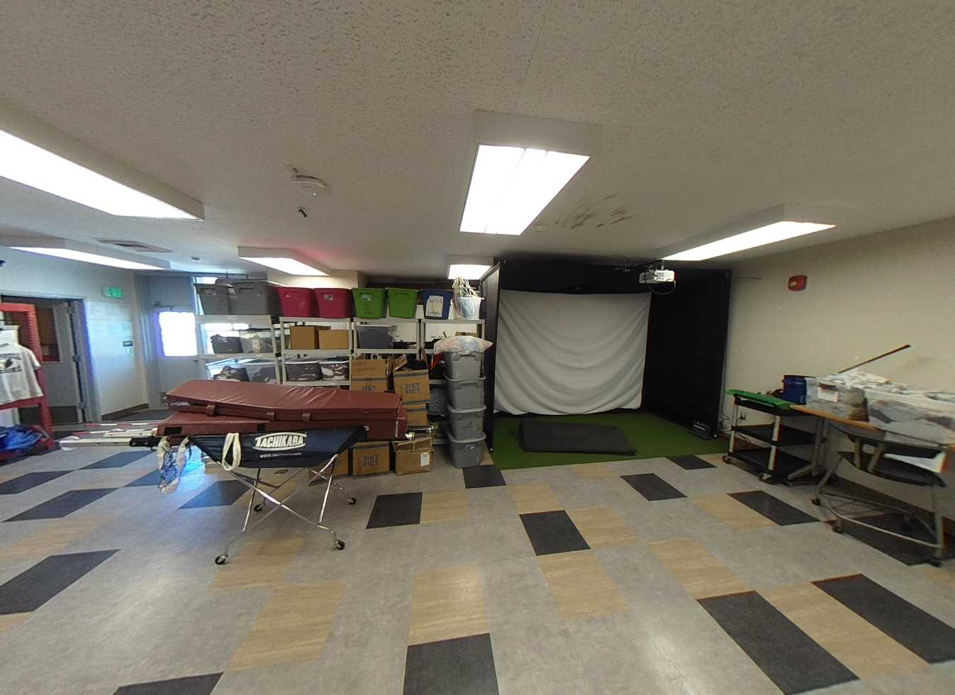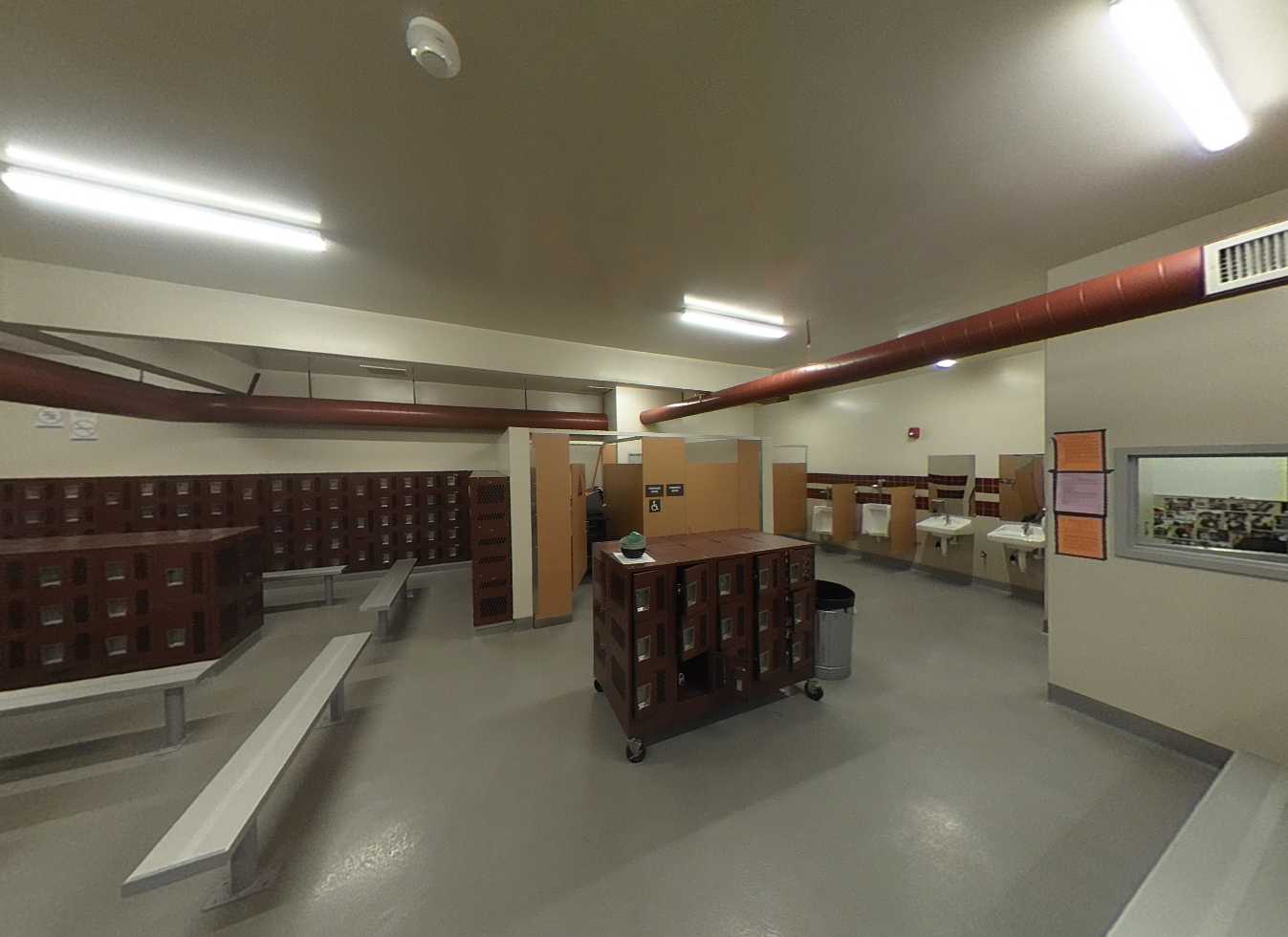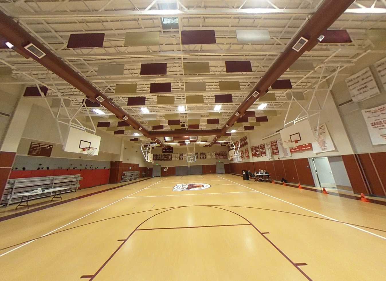 The gym building includes a full gymnasium, music room, offices, storage, and locker rooms. The gym features high ceilings, acoustic wall and ceiling panels, mechanical systems, portable bleachers, and drinking fountains. While generally in good condition, air conditioning is nonfunctional due to a broken rooftop unit, and existing fans are noisy and insufficient. The music room is well-acoustically treated, and restrooms have been recently updated.
