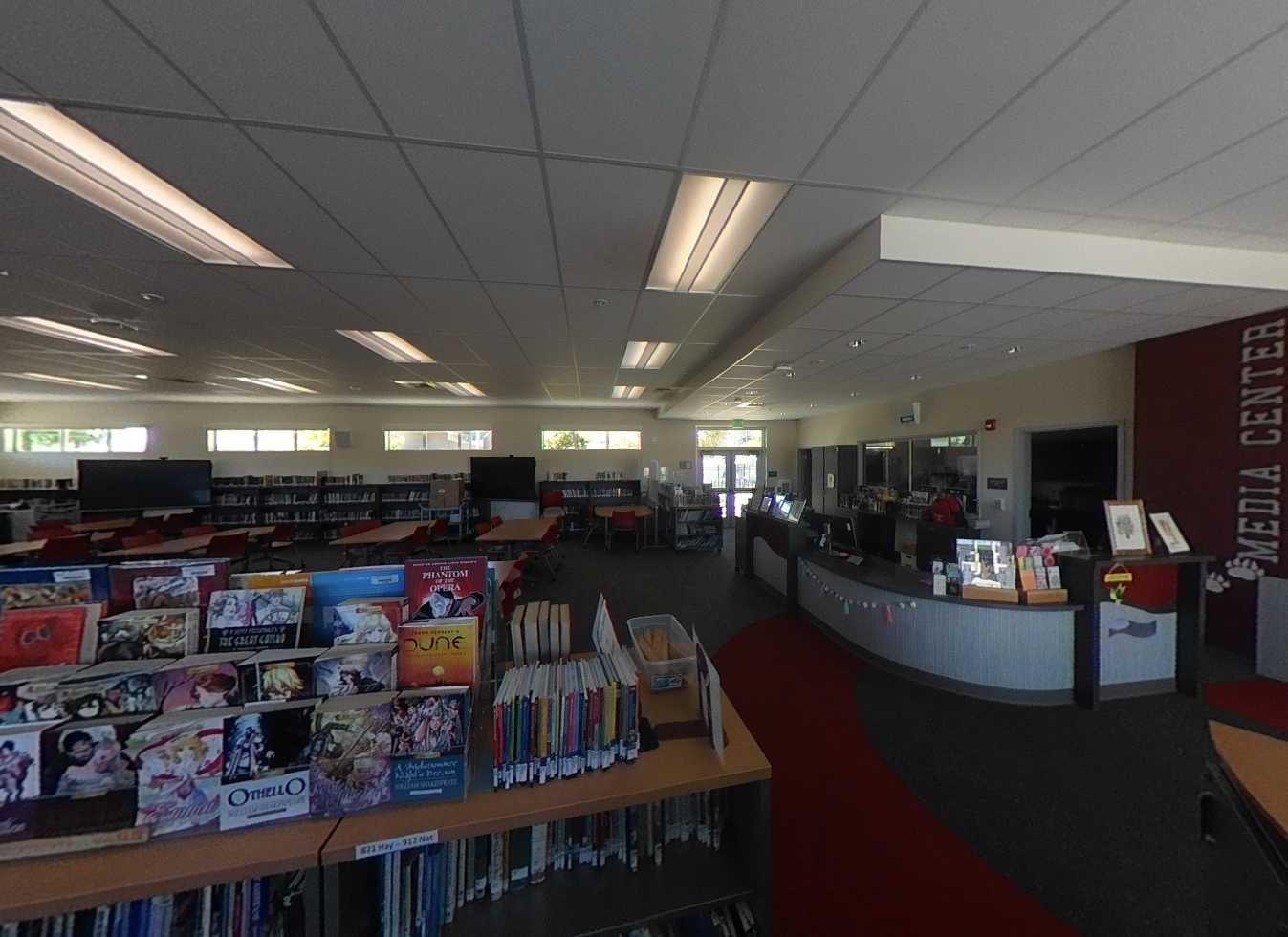 Located adjacent to administration, the library features a central circulation desk, clerestory windows with roller shades, accented carpet flooring, and flexible furnishings. A workroom, single-use restrooms, storage, conference room, and offices are incorporated. The library is in good condition and supports the school program.
