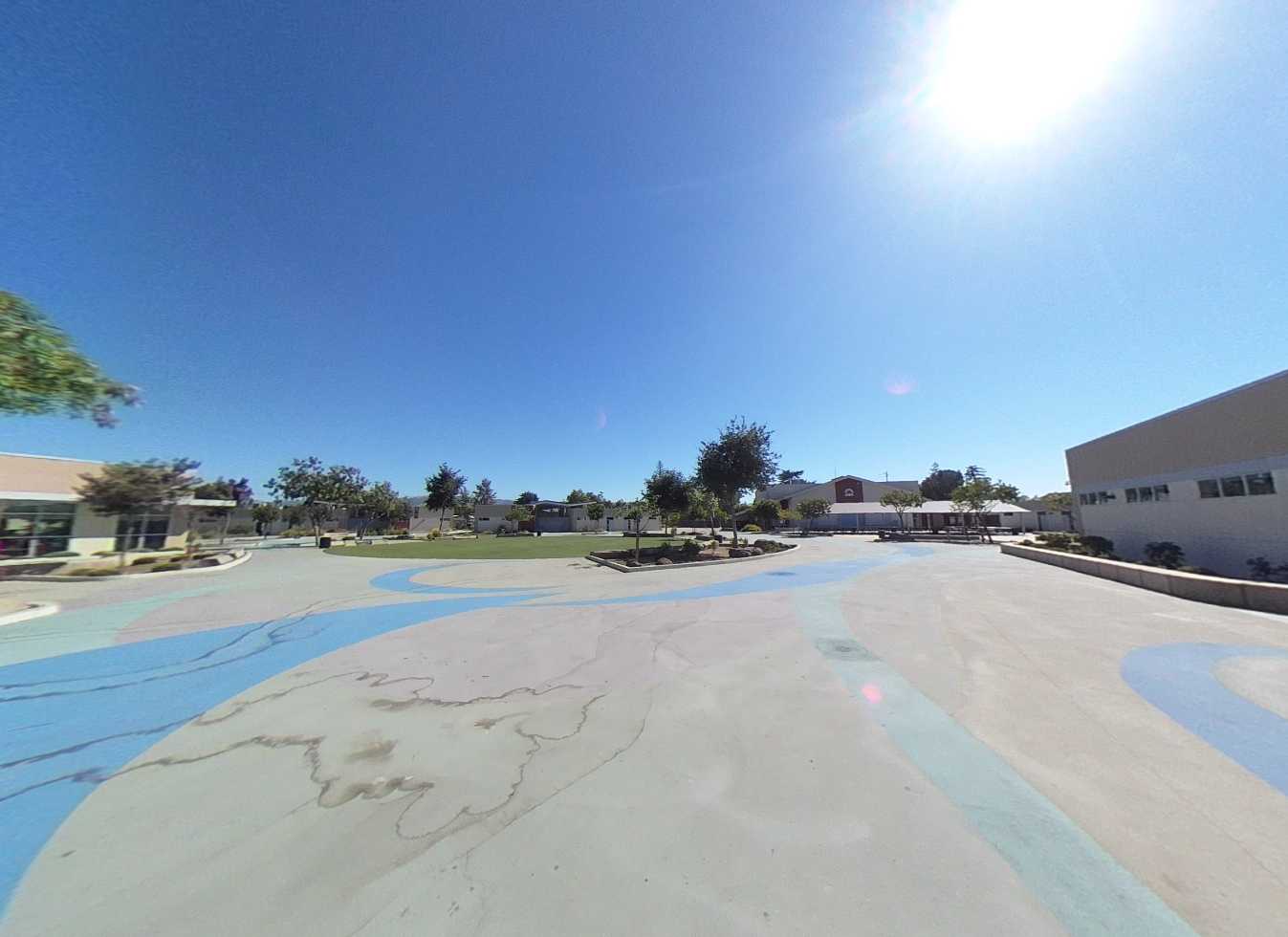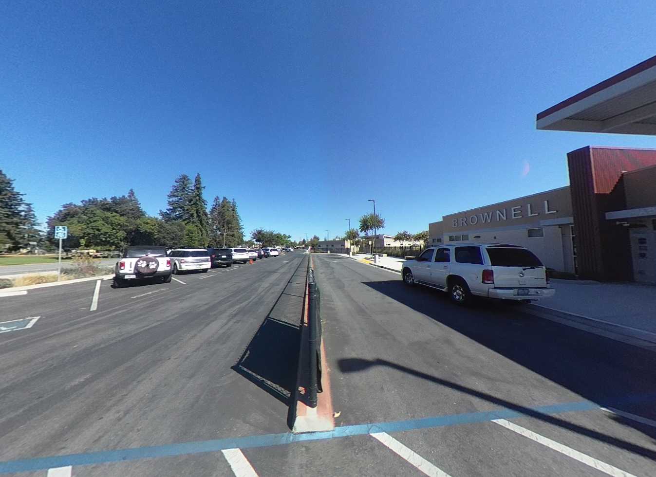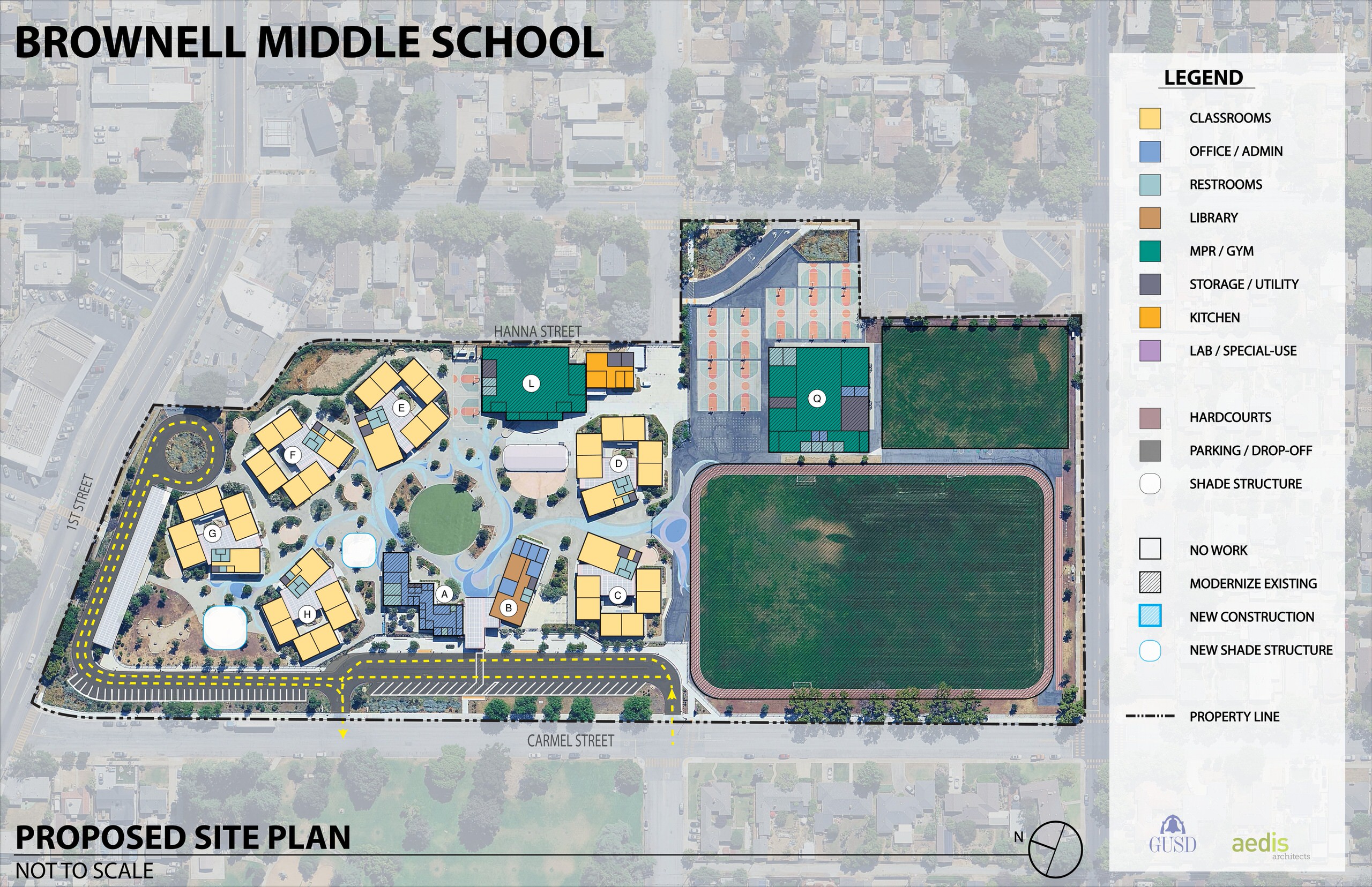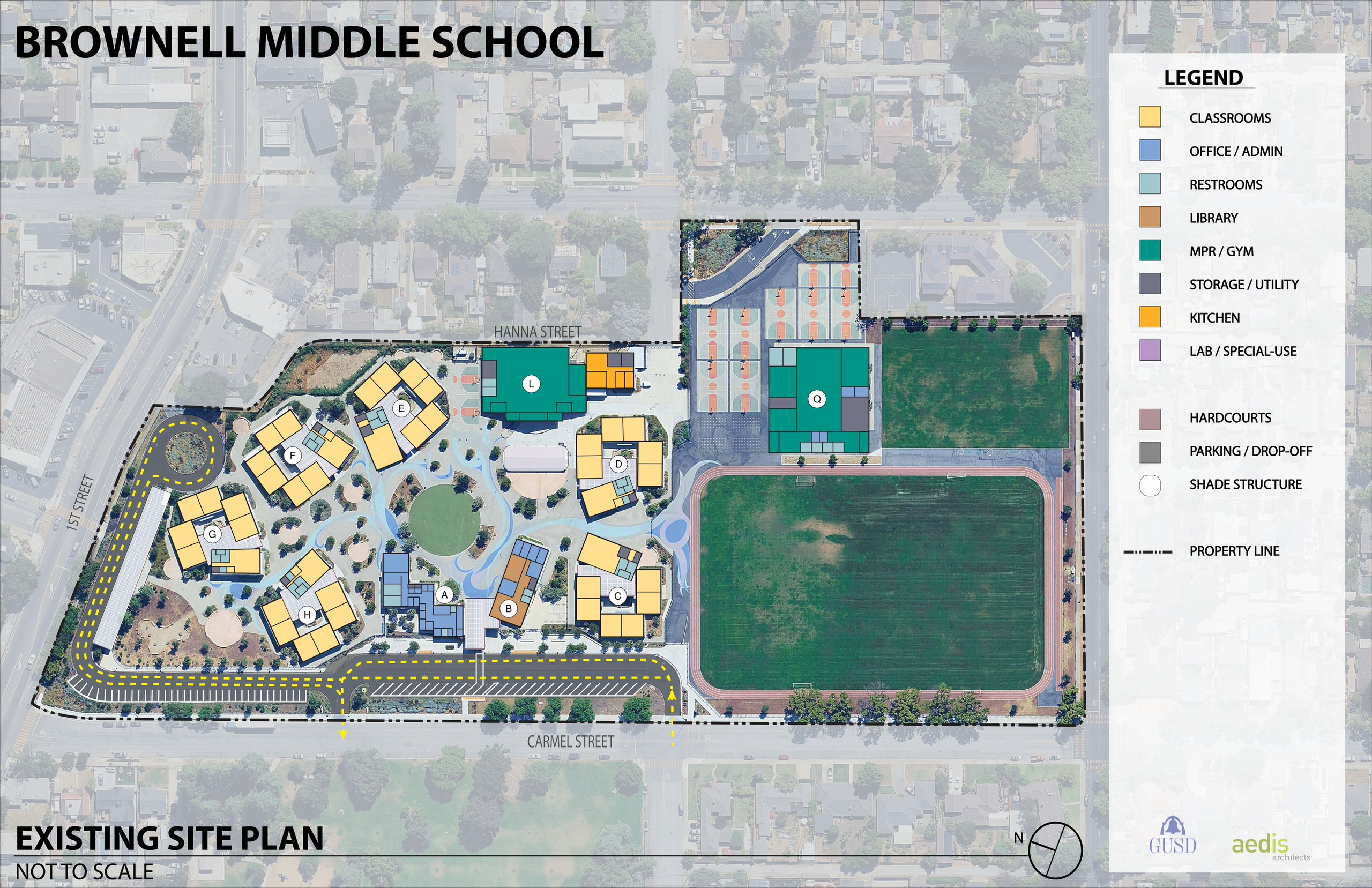 Brownell Middle School underwent almost a full campus replacement in 2019. With the exception of the gymnasium and multi-purpose buildings; new permanent structures included an administration building, 6 classroom pods, library, and all new site amenities. Classroom pods are distributed across campus and connected via brightly painted pathways, with planted gathering areas and a central green space with seat walls. Parking and drop-off areas are located along Carmel Street and 1st. The campus is well-maintained with modern finishes, furniture, and technology integration.