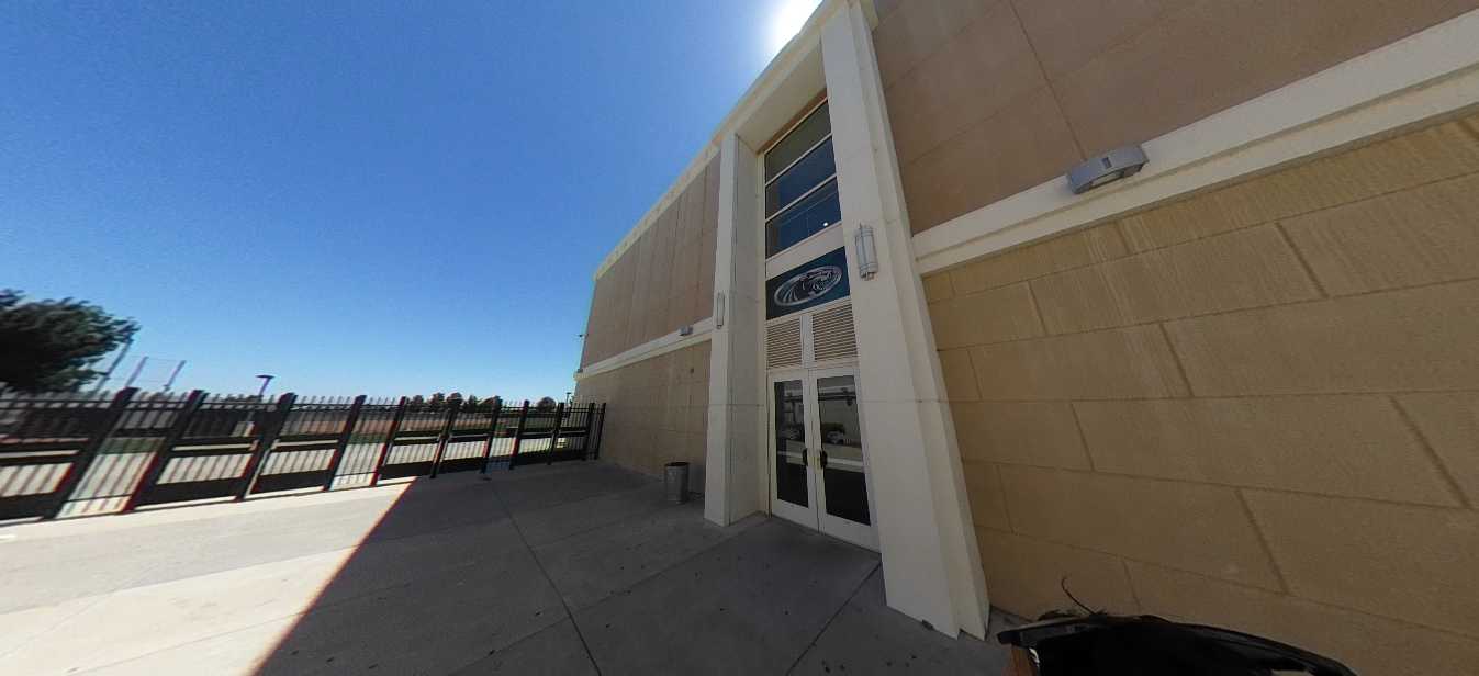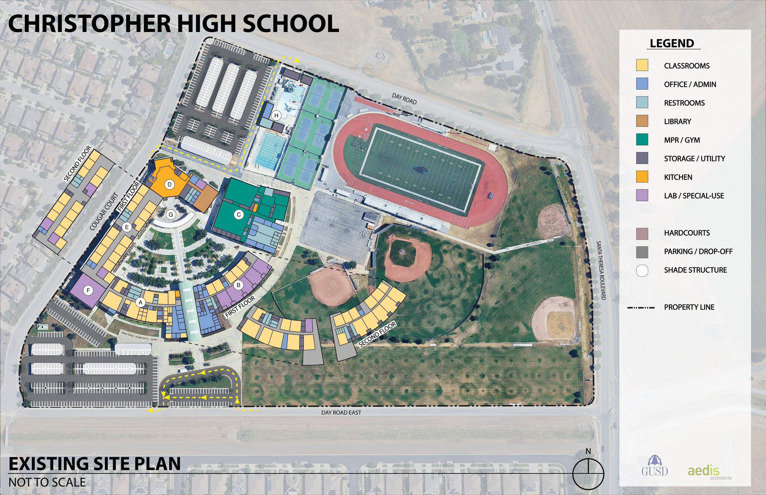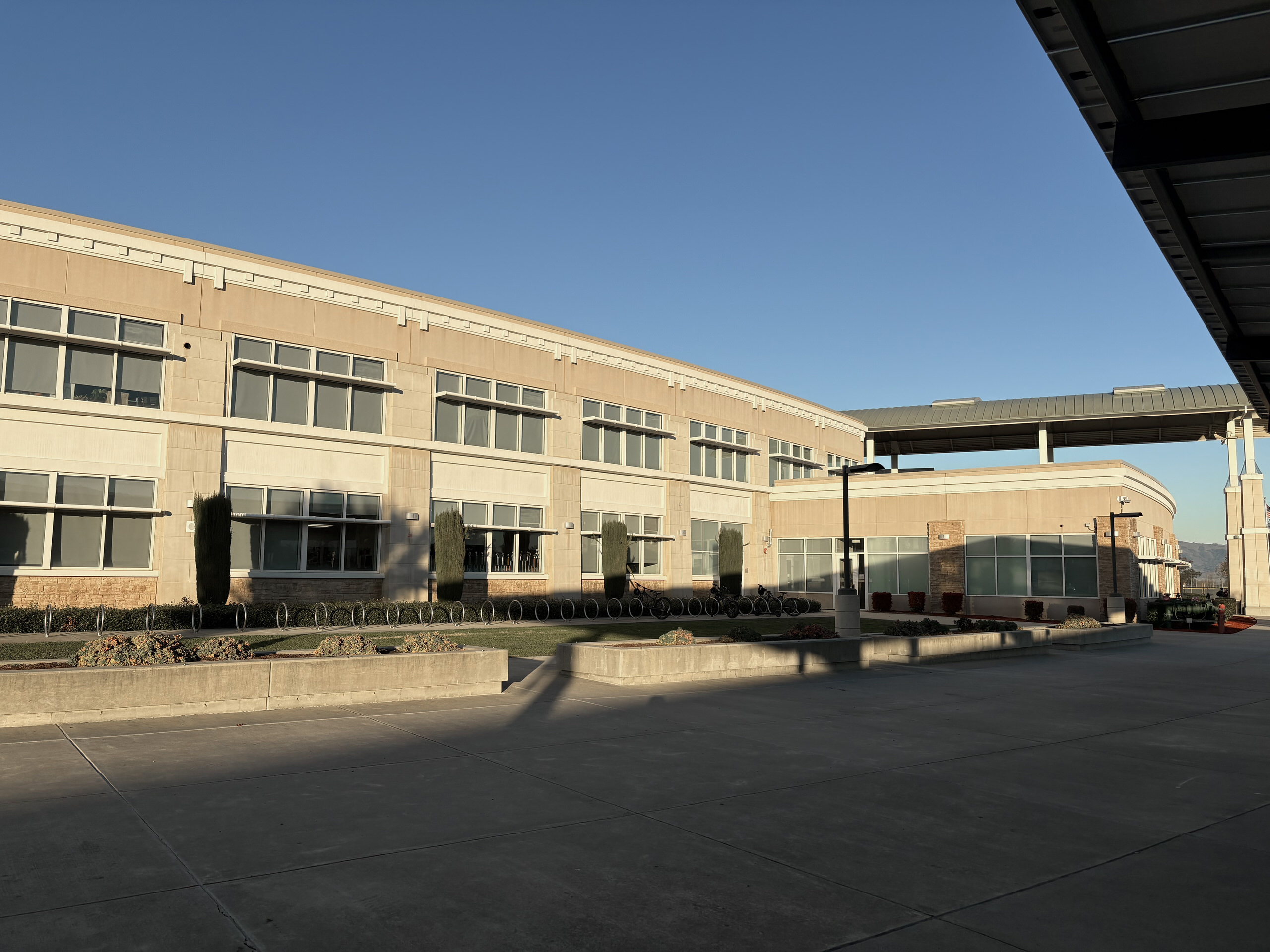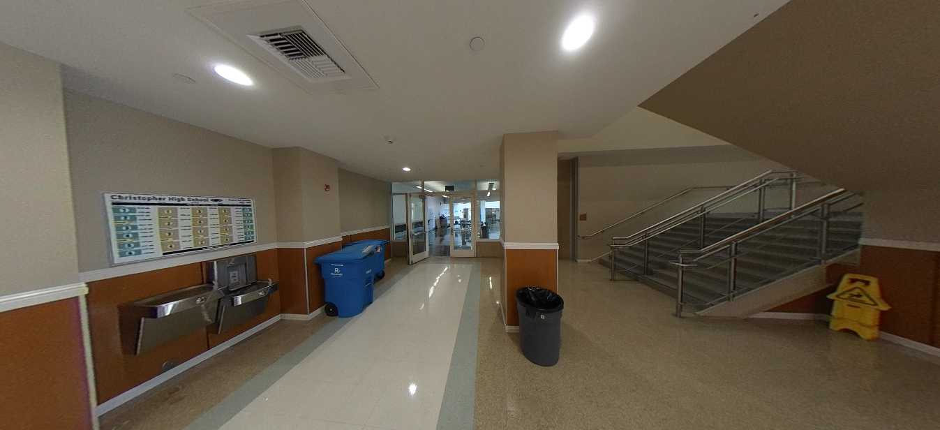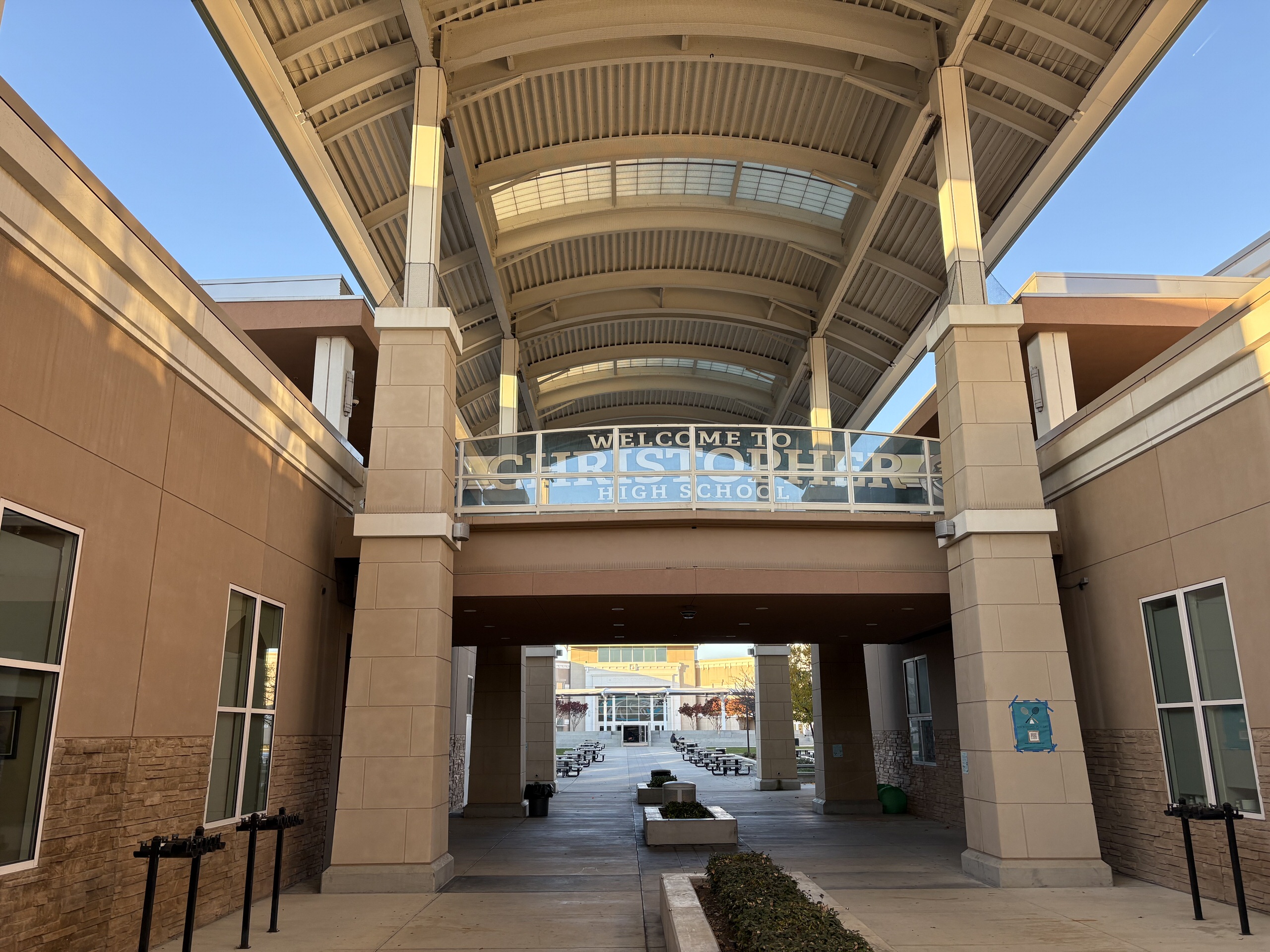 Christopher High School is the district’s most recently built high school campus, completed in 2015. It is organized around a central courtyard that serves as the primary circulation path and student gathering area. Large-scale canopy systems rise above the building heights, providing shade and emphasizing horizontal lines. These structures contribute to the campus’s contemporary character while supporting outdoor circulation and gathering. Many interior spaces, such as the cafeteria and library, have clerestory windows and large openings to maximize natural light. The campus has large parking areas at both the main and rear entries. Overall, buildings are well-maintained and cohesive in design; however, site paving, striping, and landscaping exhibit wear, and accessibility between parking lots and building entries is inconsistent. The campus remains attractive and functional but would benefit from targeted improvements to paving, wayfinding, accessibility, finishes, and more outdoor shading.