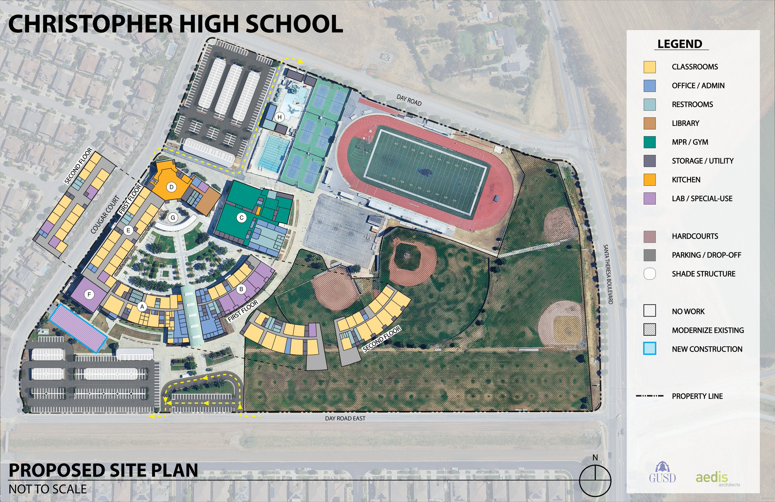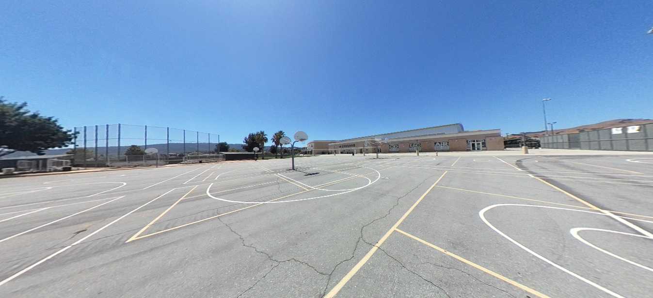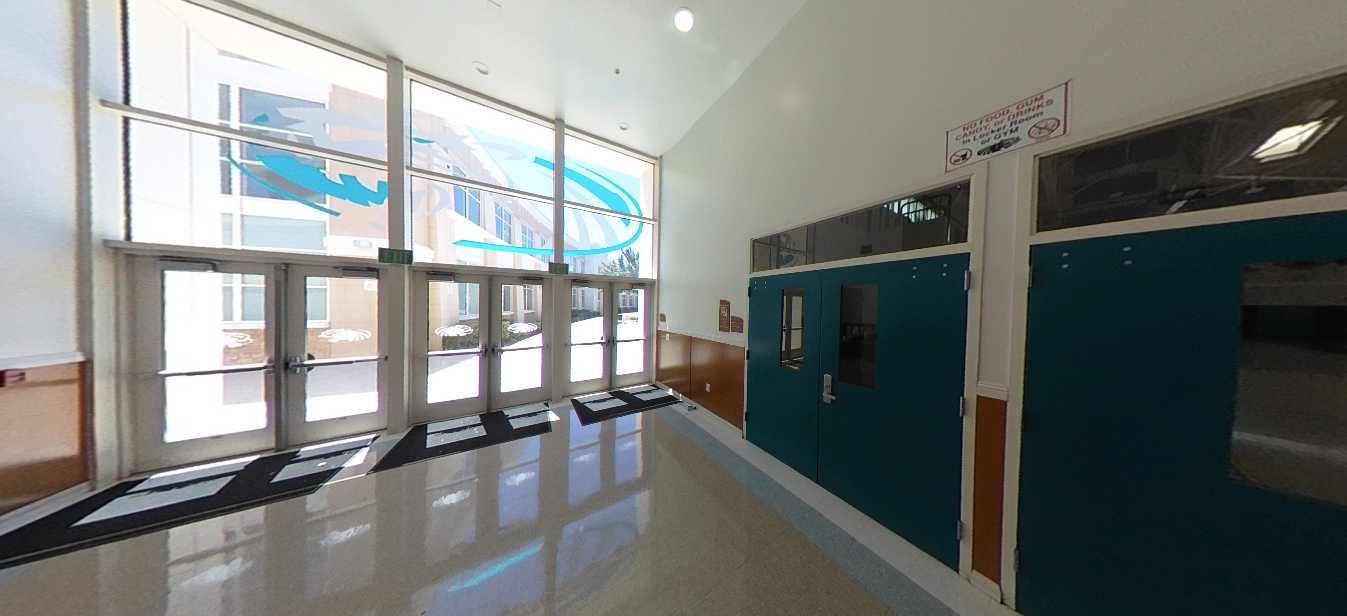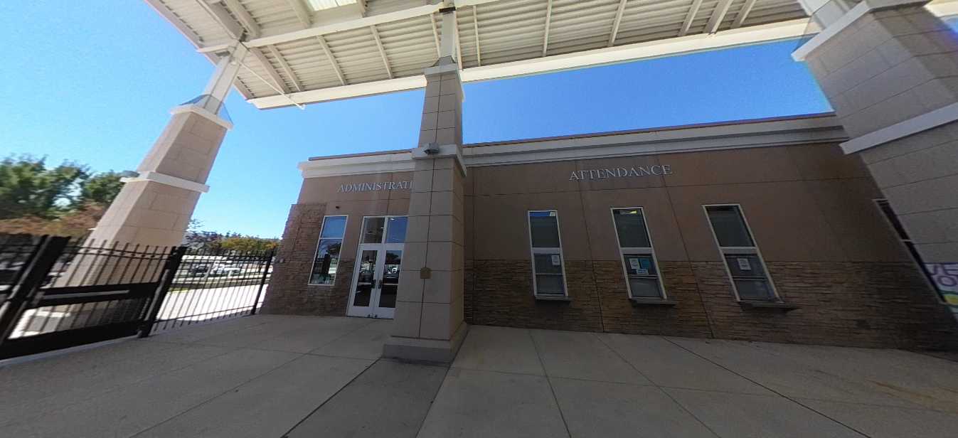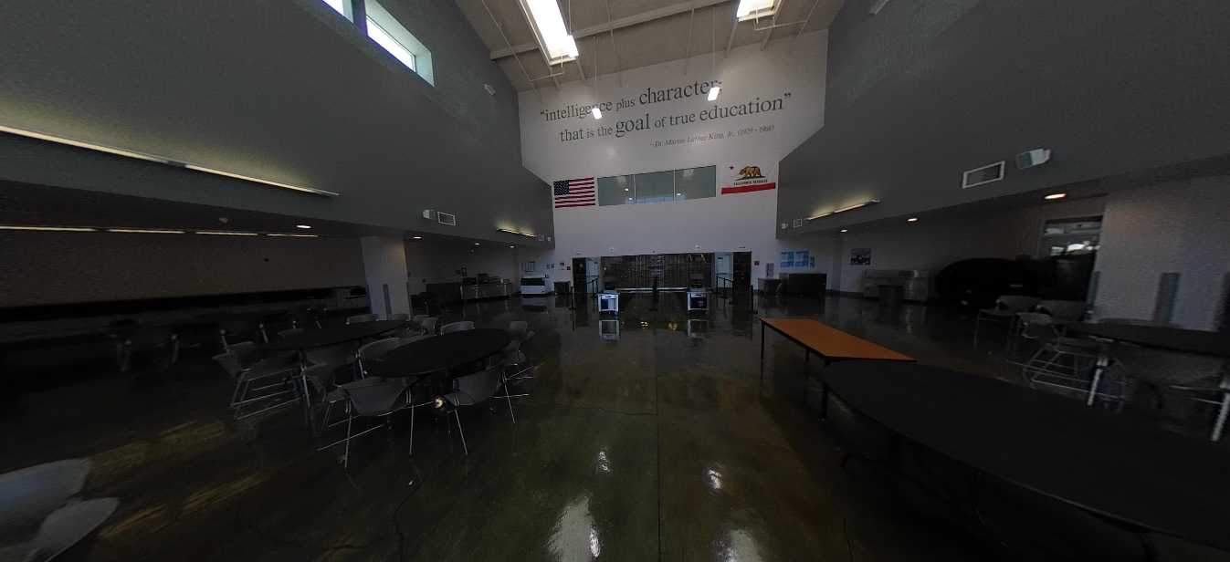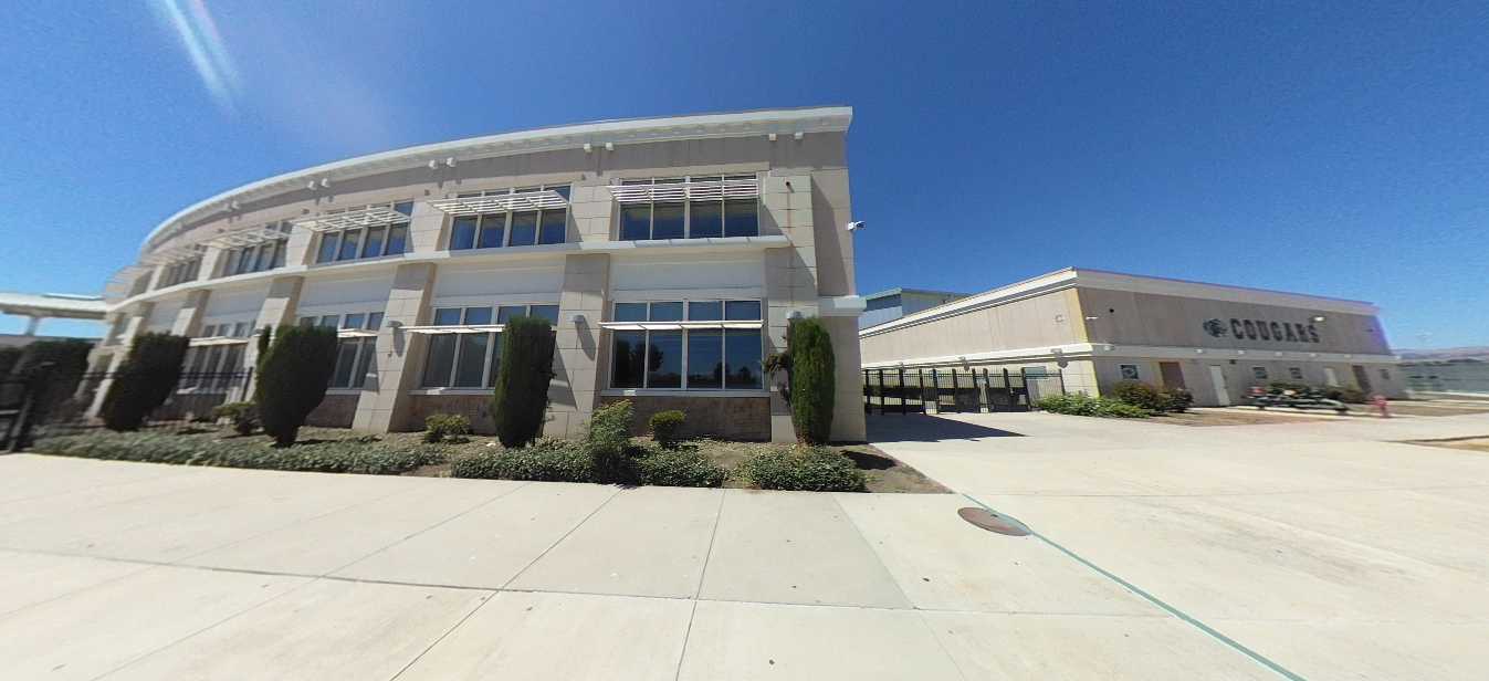Christopher High School is the district’s most recently built high school campus, completed in 2015. It is organized around a central courtyard that serves as the primary circulation path and student gathering area. Large-scale canopy systems rise above the building heights, providing shade and emphasizing horizontal lines. These structures contribute to the campus’s contemporary character while supporting outdoor circulation and gathering. Many interior spaces, such as the cafeteria and library, have clerestory windows and large openings to maximize natural light. The campus has large parking areas at both the main and rear entries. Overall, buildings are well-maintained and cohesive in design; however, site paving, striping, and landscaping exhibit wear, and accessibility between parking lots and building entries is inconsistent. The campus remains attractive and functional but would benefit from targeted improvements to paving, wayfinding, accessibility, finishes, and more outdoor shading.
