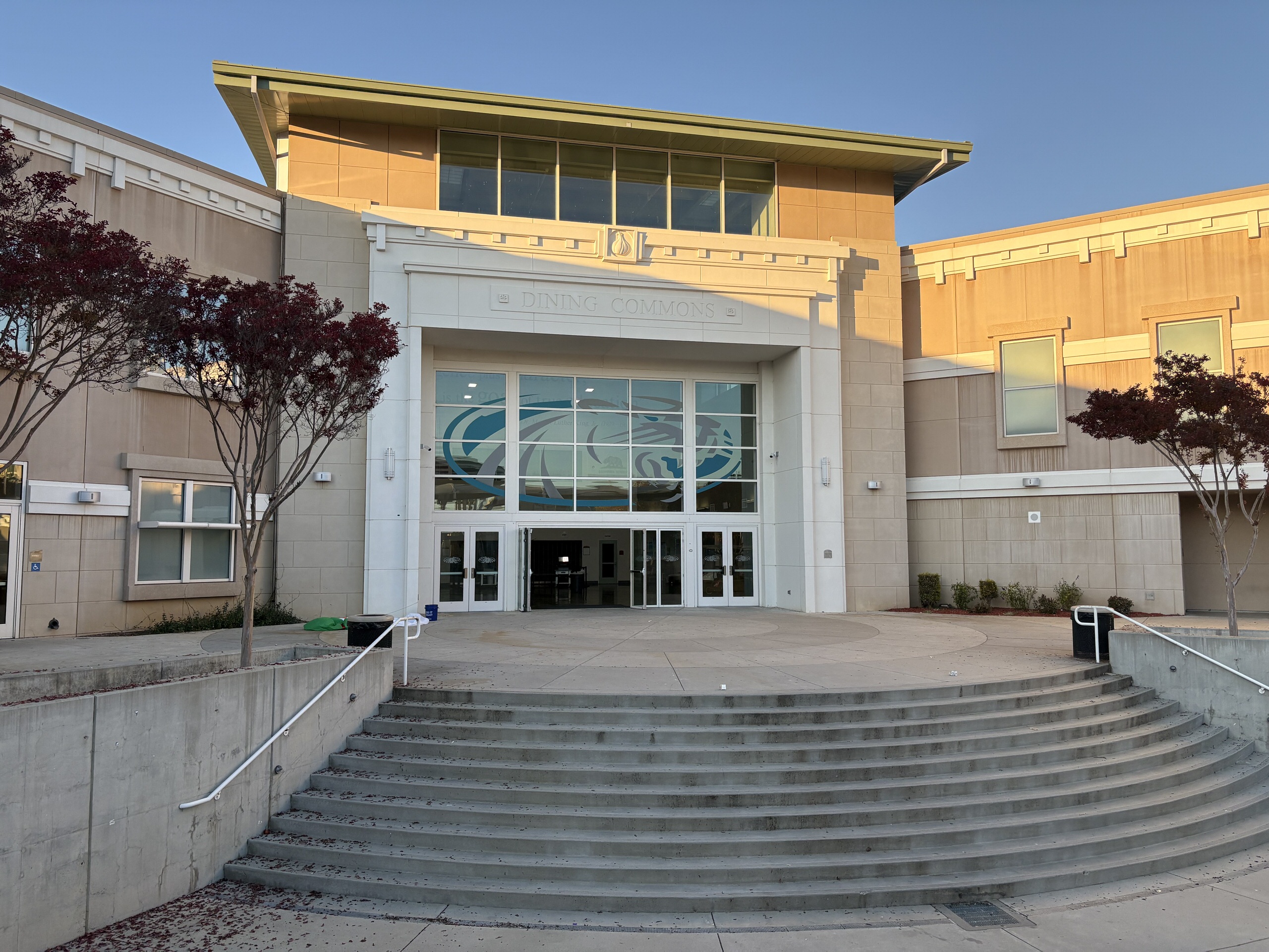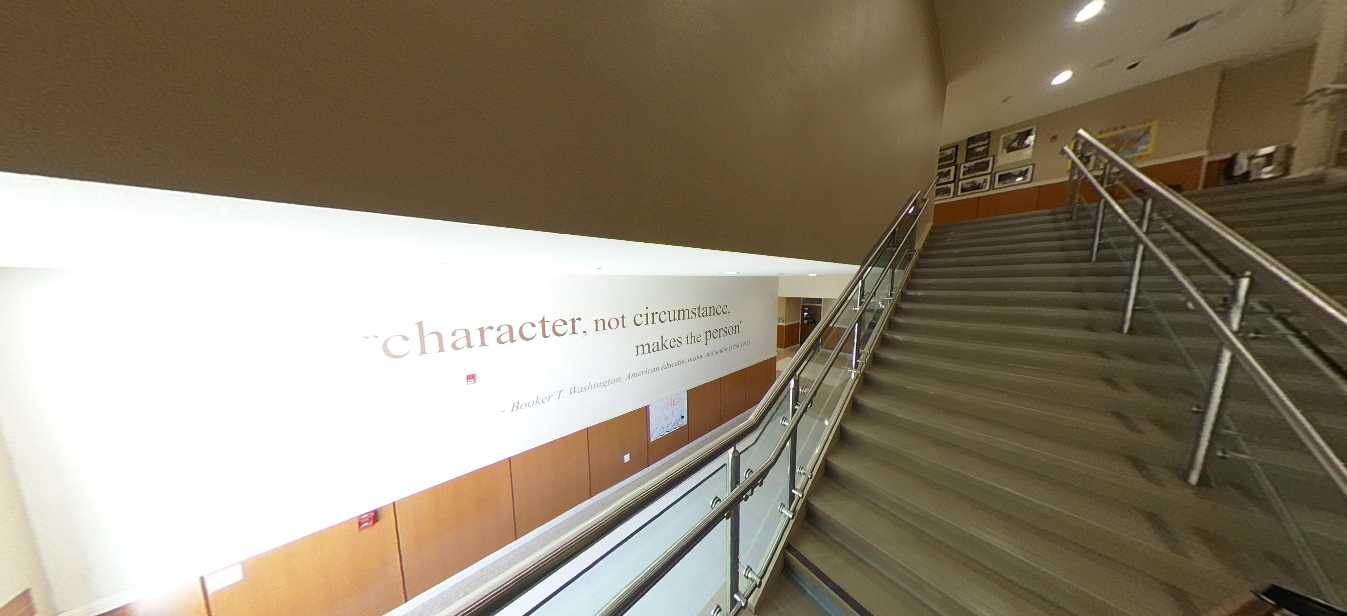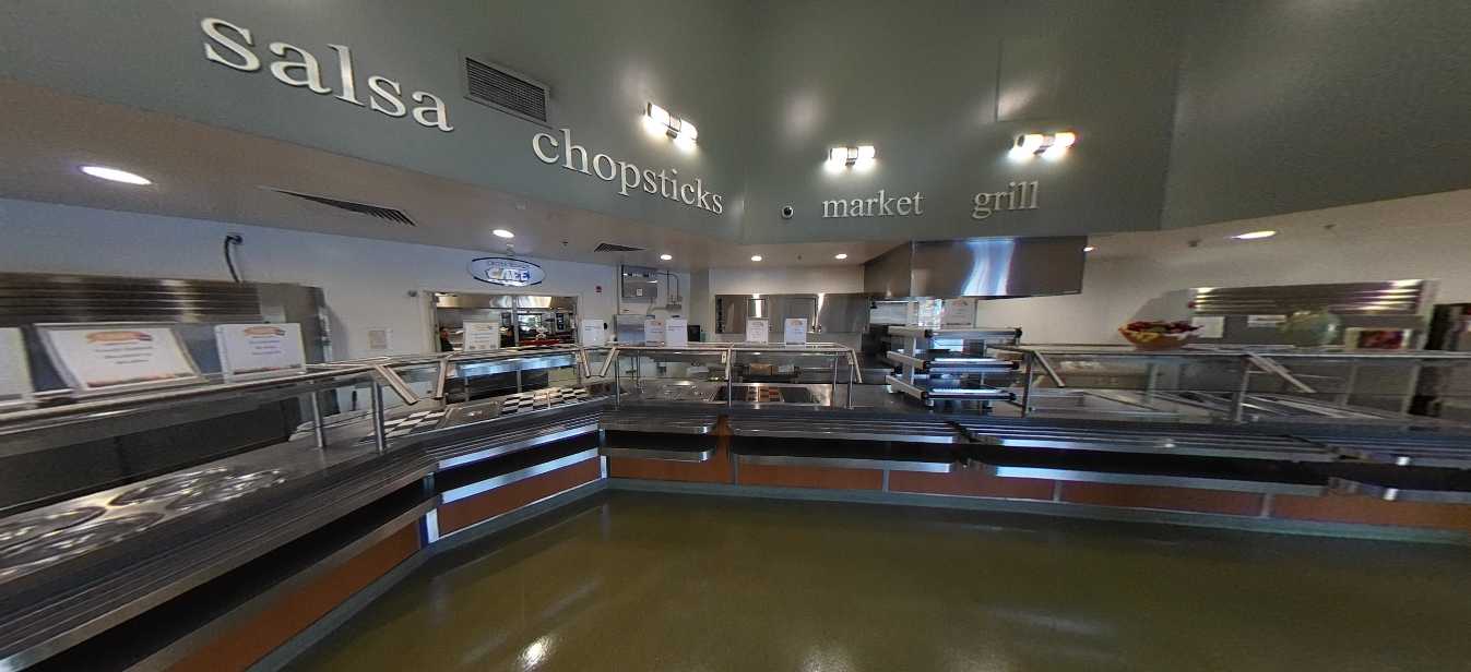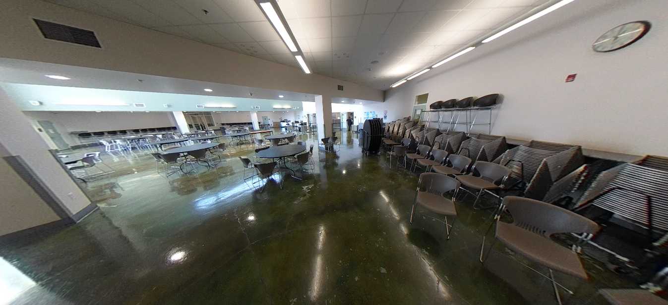 The cafeteria faces the top of the quad, located near the drop-off area by Cougar Court and connected to the liberal arts classroom wing. The kitchen and service area is located towards the rear of the building, with additional support spaces programmed along the building perimeter. The cafeteria features high ceilings, clerestory windows, and vinyl quotes along featured walls. The interior opens to an outdoor terraced seating through foldable door panels.