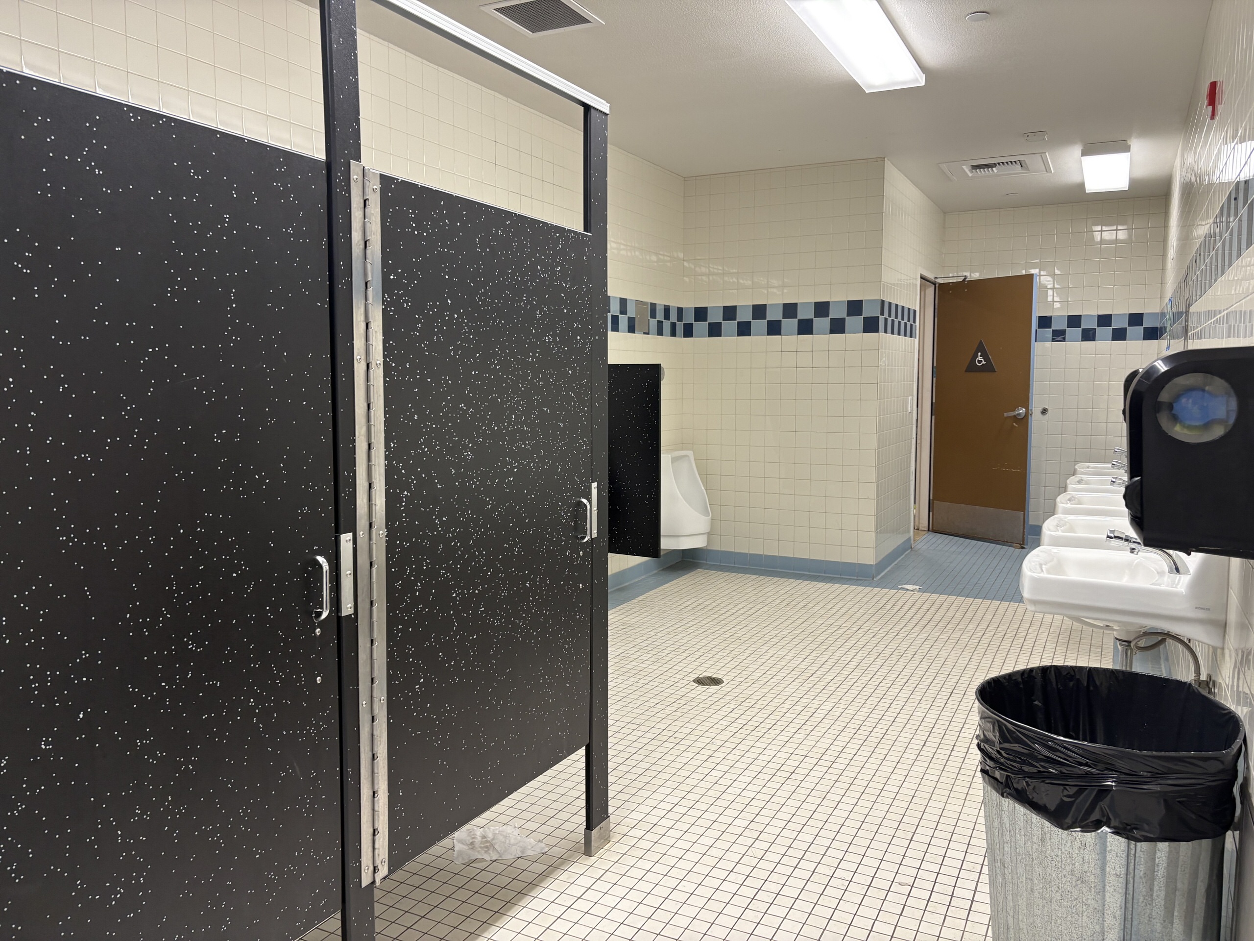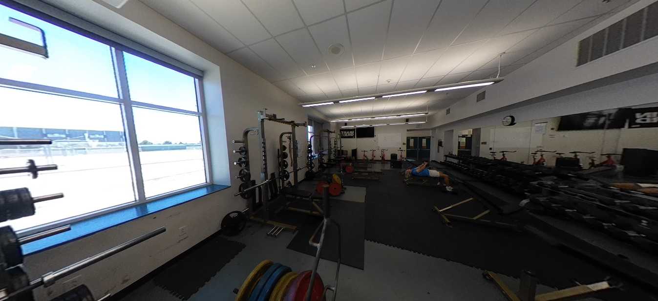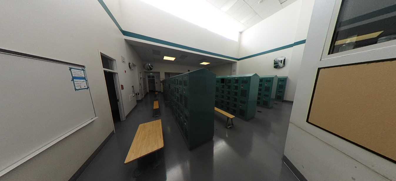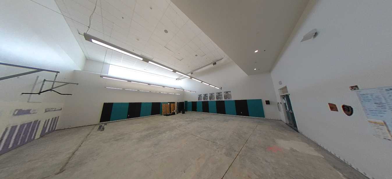 The gymnasium complex fronts the parking lot between Cougar Court and Day Road and houses a main gym, practice gym, wrestling gym, weight room, locker rooms, athletic classrooms, storage, and support spaces. The main gym includes full-size courts, protective wall padding, and acoustic fins at the high ceiling. However, interior finishes are outdated, equipment is nearing end-of-life, and locker rooms show significant wear, including damaged walls, dented lockers, and aging fixtures. While heavily used and central to campus life, the athletic and gym facilities require modernization and long-term maintenance investment.