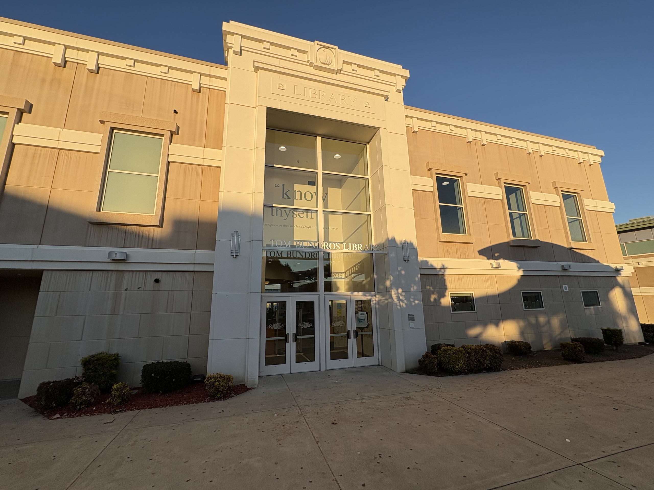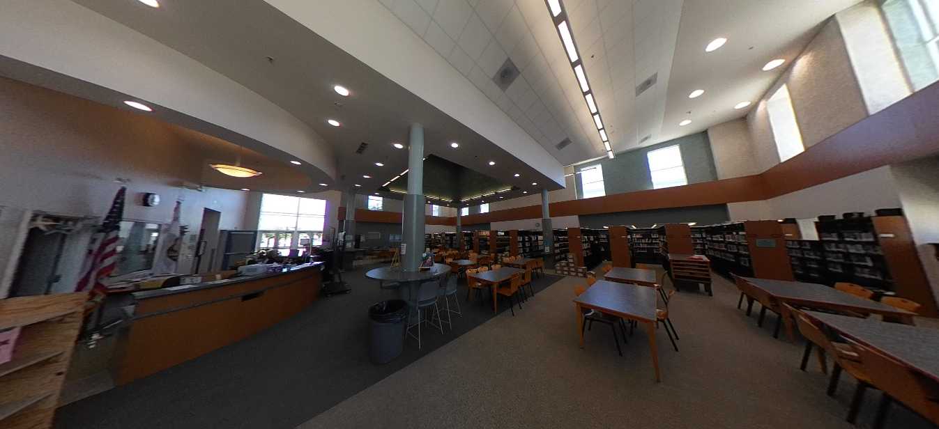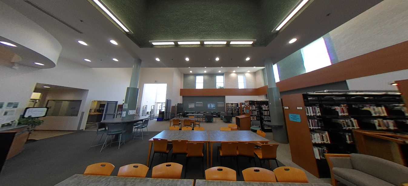 The library connects to the cafeteria via an interior corridor and contains a conference room, computer lab, textbook storage, restrooms, and an open study area. Two primary entrances face both the quad and the drop-off area and include ceiling-height glazing that brings natural light into the reception zone. The space features high ceilings with clerestory windows, a large circulation desk, fixed furnishings, book stacks, and rolling digital displays. Carpet flooring shows wear, particularly at transitions between different color fields, where seams are unraveling.
