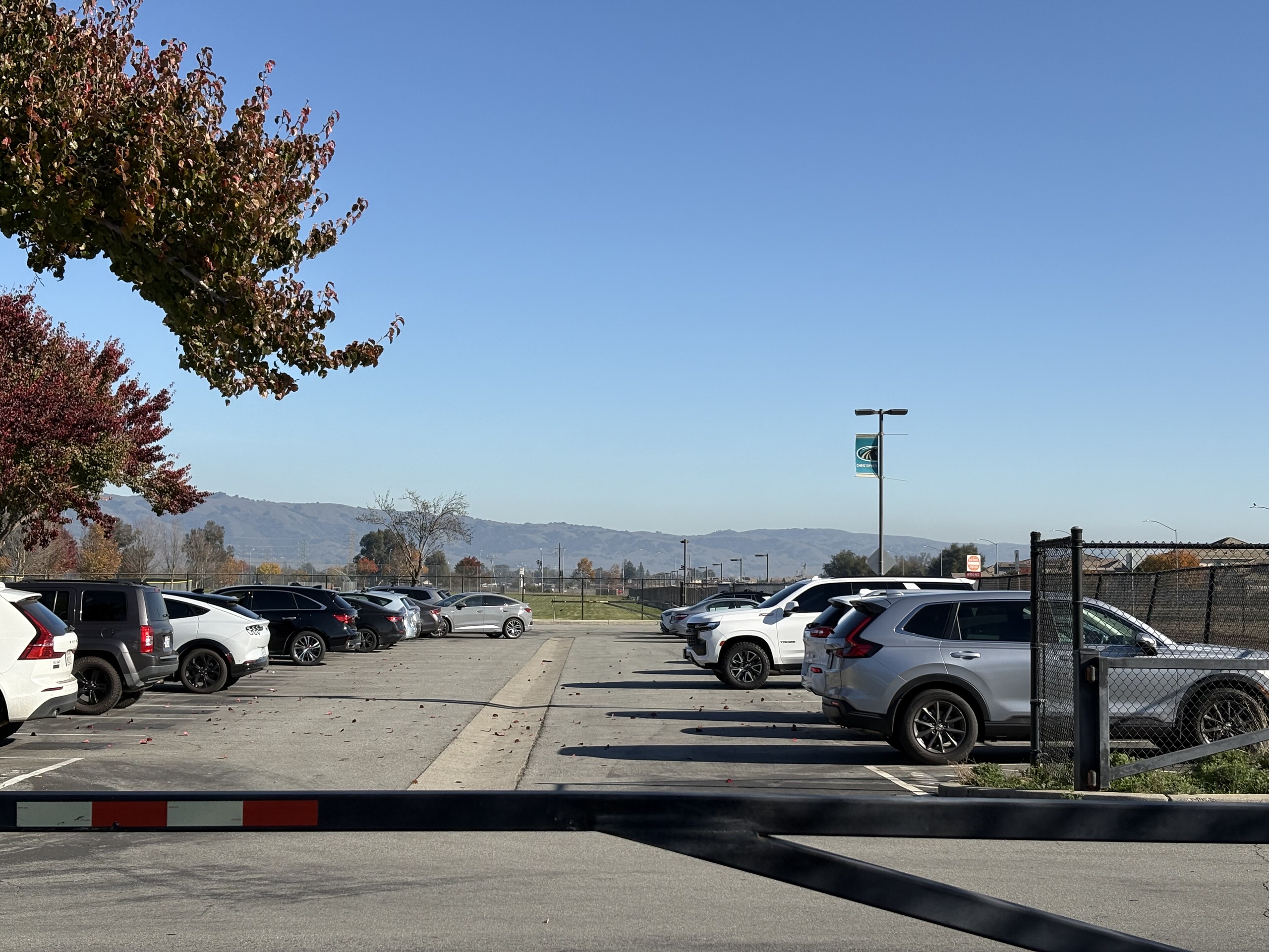 Two main campus entrances are located between the gymnasium and library, adjacent to parking lots and student drop-off zones. These lots include large solar panel structures and designated waiting areas. Asphalt surfaces are deteriorated, striping is faded, pedestrian pathways are lacking, wayfinding is unclear, and circulation patterns contribute to severe congestion along Cougar Court and Day Road East. Perimeter landscape areas surrounding classroom buildings also show significant decline.