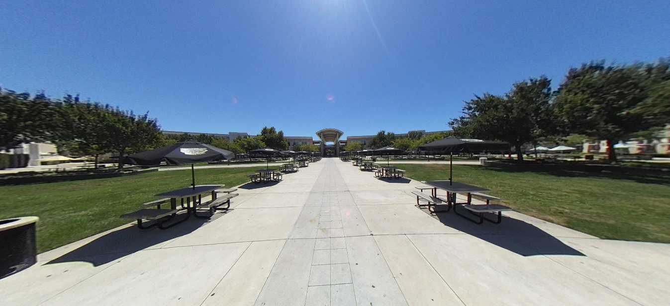 The campus features a centralized quad with lawn areas, planters, trees, shade umbrellas and structures, and ample seating. The upper edge of the quad transitions to an amphitheater seating area oriented toward the multi-purpose building. Covered exterior corridors connect classroom buildings and are protected by large canopy structures.