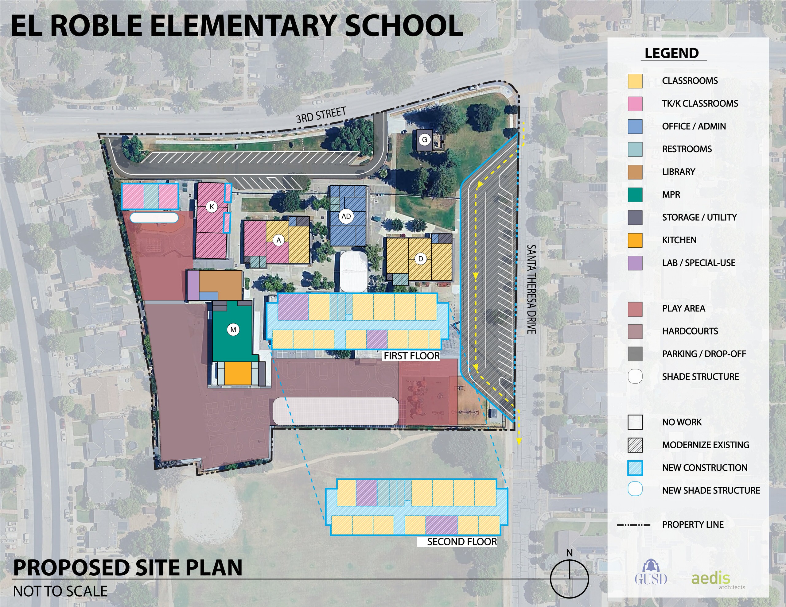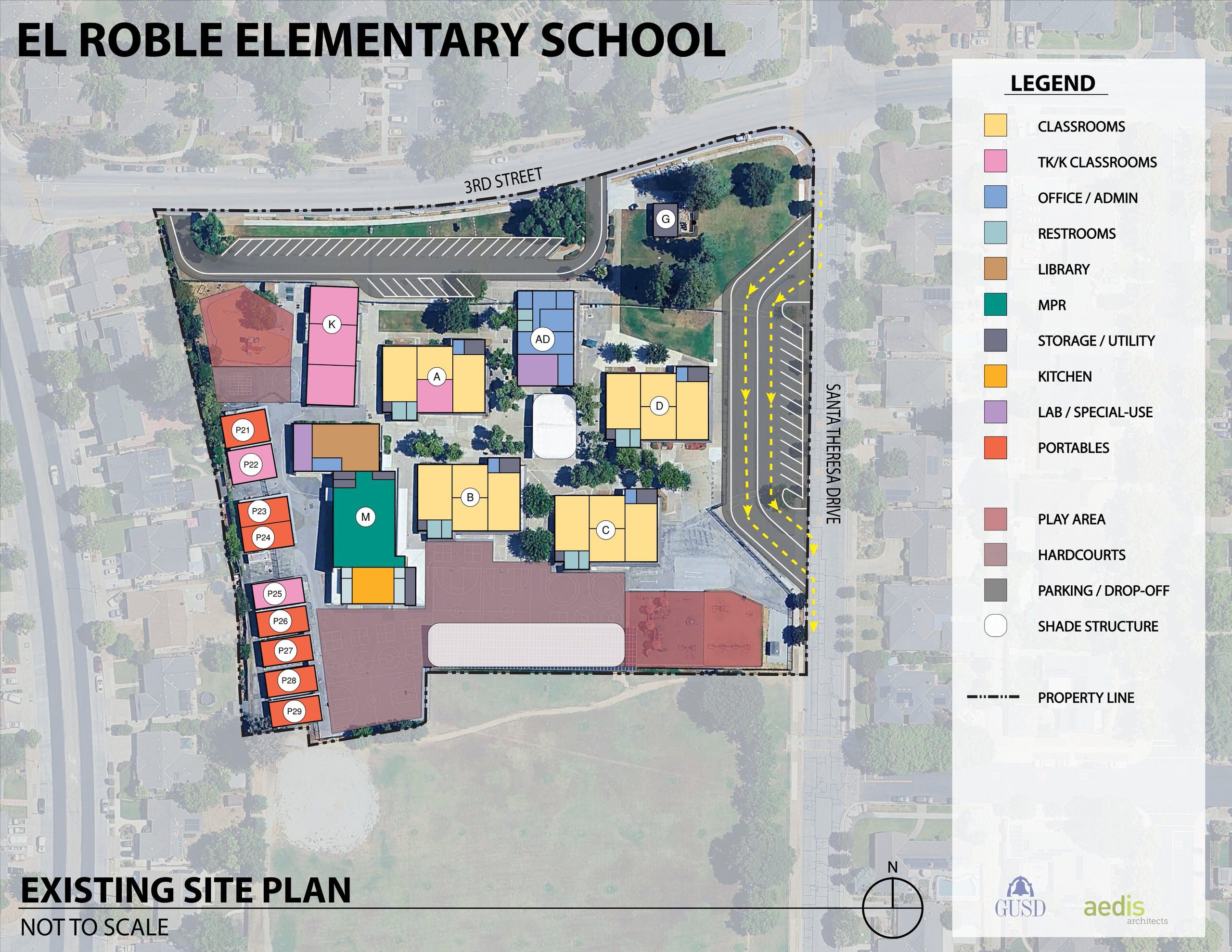 The El Roble Elementary School campus is comprised of permanent and portable structures with a complete modernization completed in 2005. Key facilities include an administration building, classroom pods, library, multi-purpose room, cafeteria, and elective labs. Considering their growing enrollment, current campus conditions are unsatisfactory due to outdated and insufficient classroom, administration, and storage facilities. A major modernization of this site is needed to meet the programmatic needs of this campus.