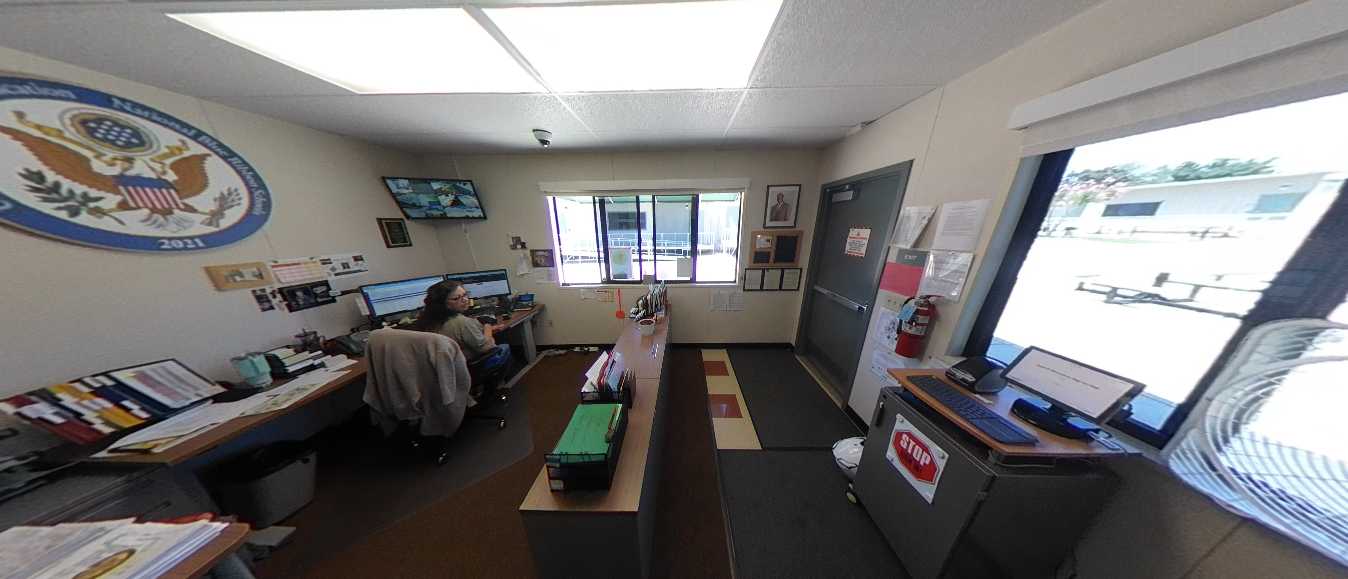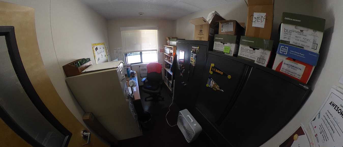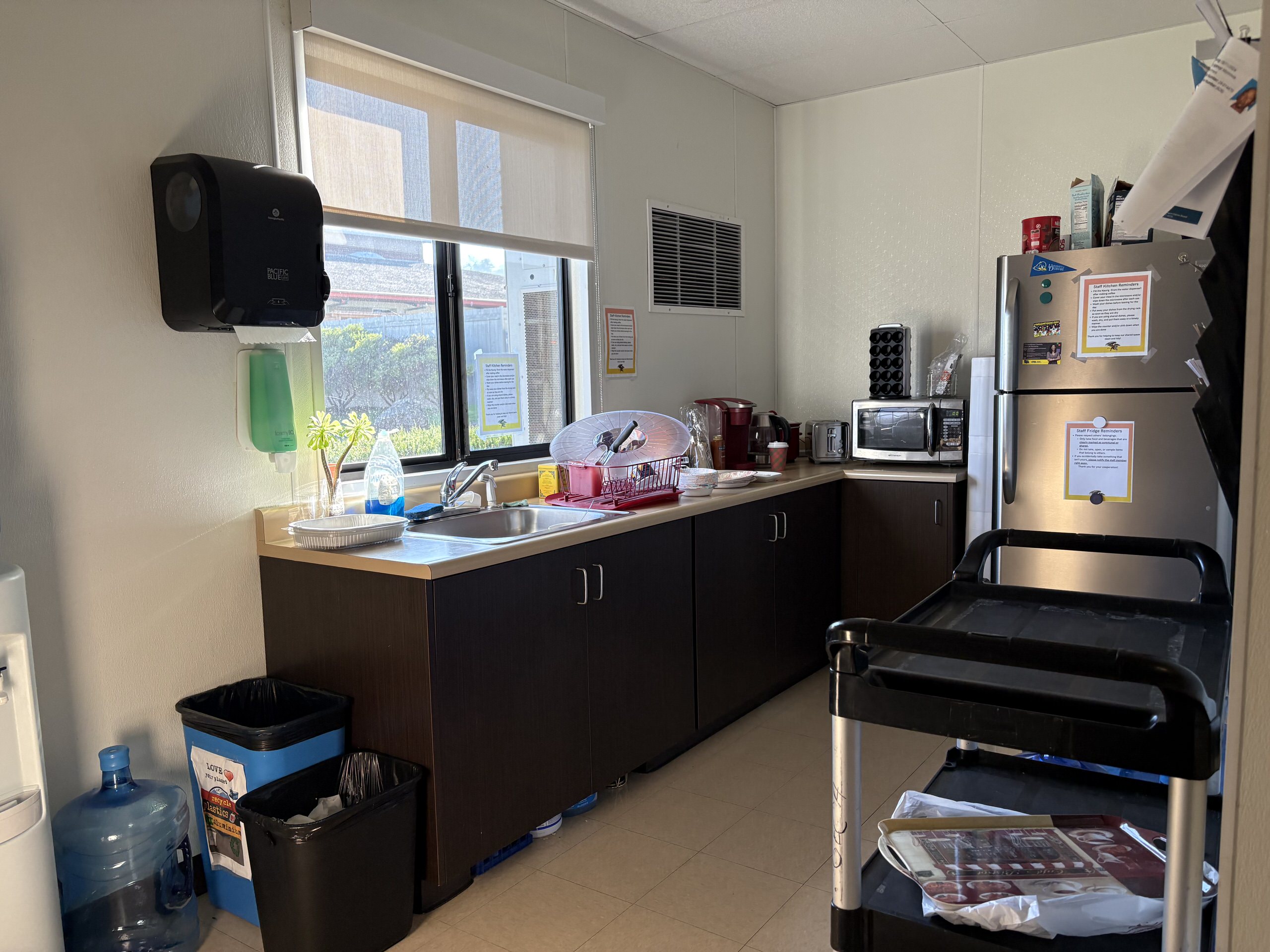 The administration portable contains a small reception area, main office, conference room, and private offices. There is no dedicated staff lounge, copy room, or private meeting space.