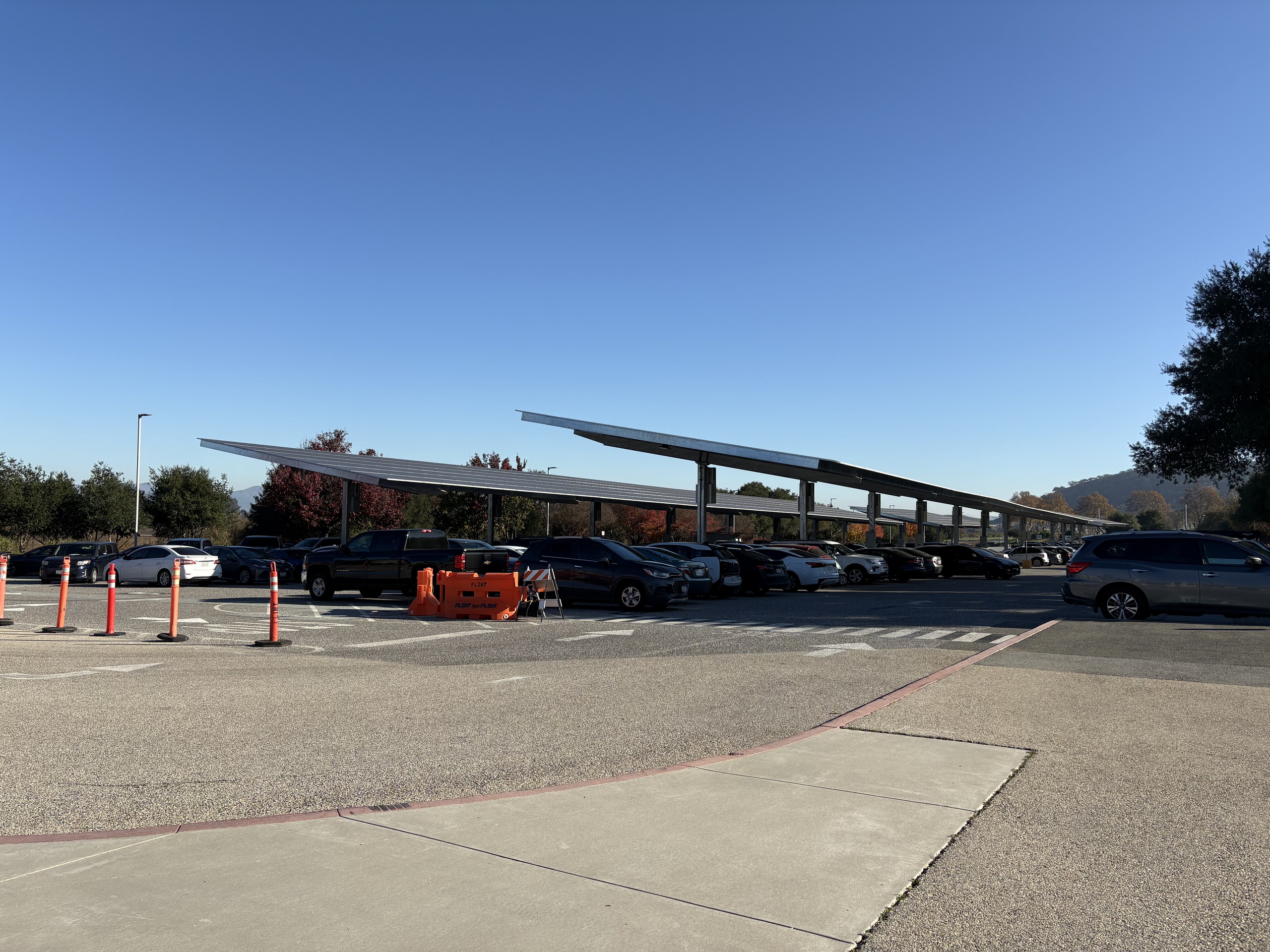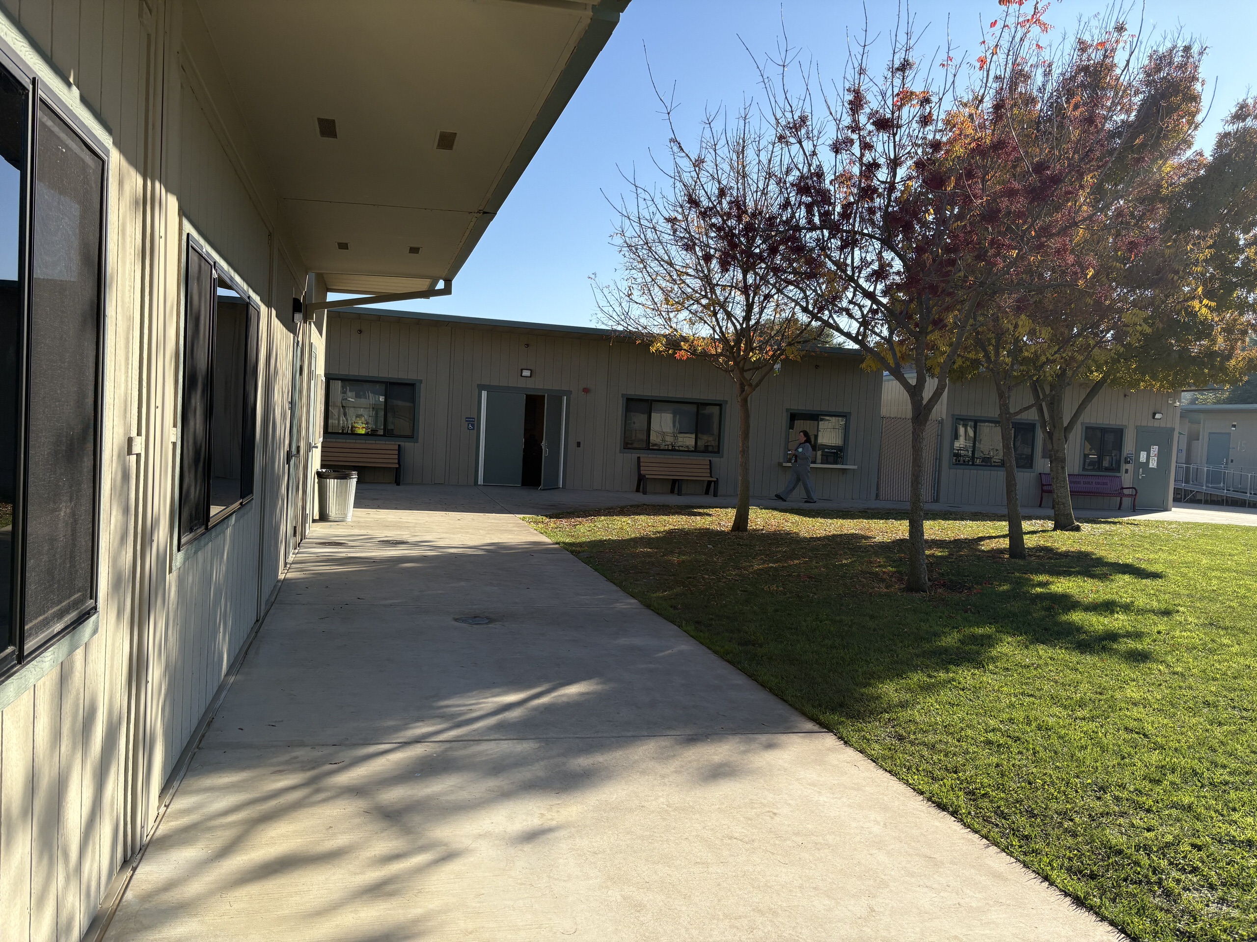 The adjacent parking lot, shaded by a solar canopy, provides accessible parking and compliant paths of travel. However, vehicular circulation is inefficient, and wayfinding and directional signage are limited. The campus entry lacks visual prominence and clear identification. Pest activity has been observed beneath some portable buildings, indicating a need for improved site maintenance and mitigation measures.