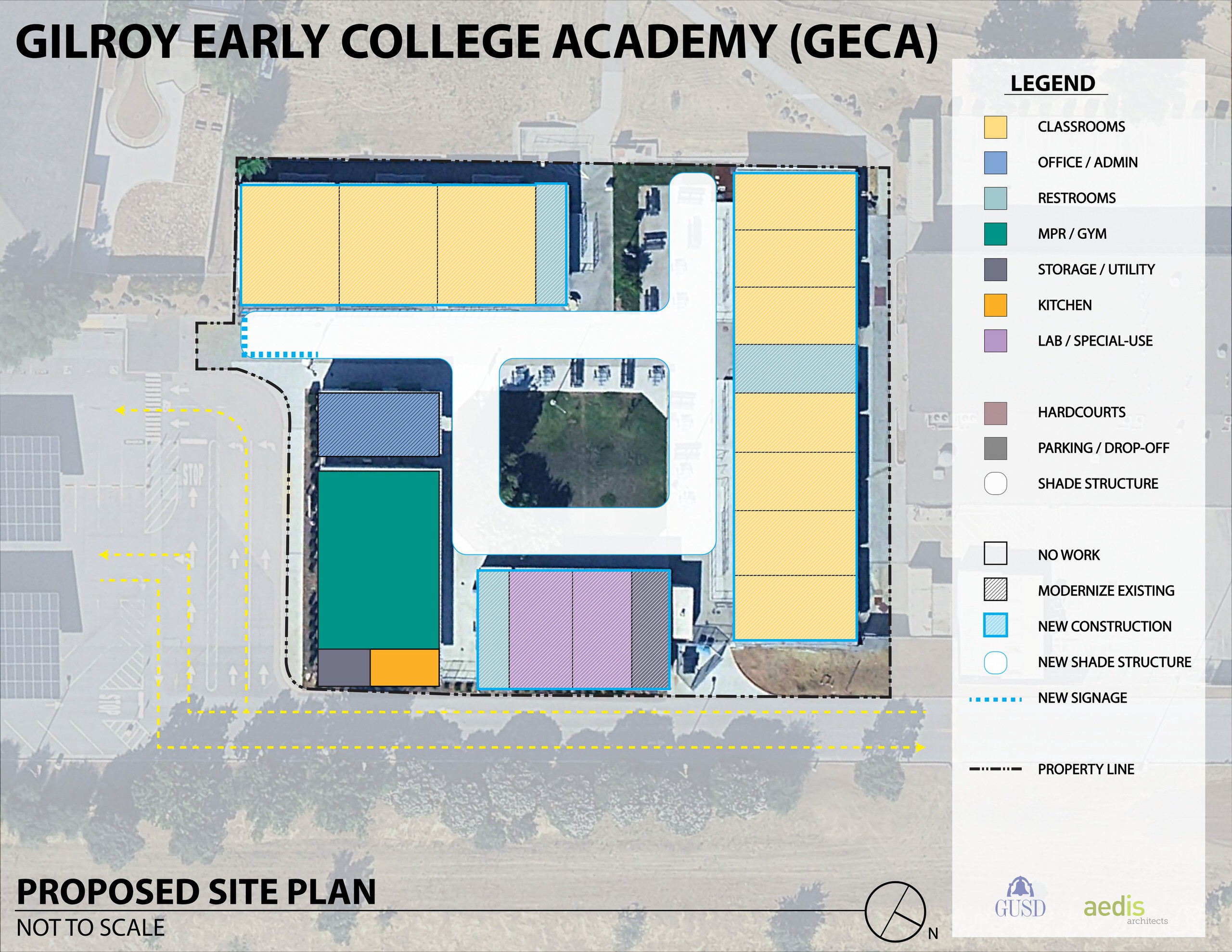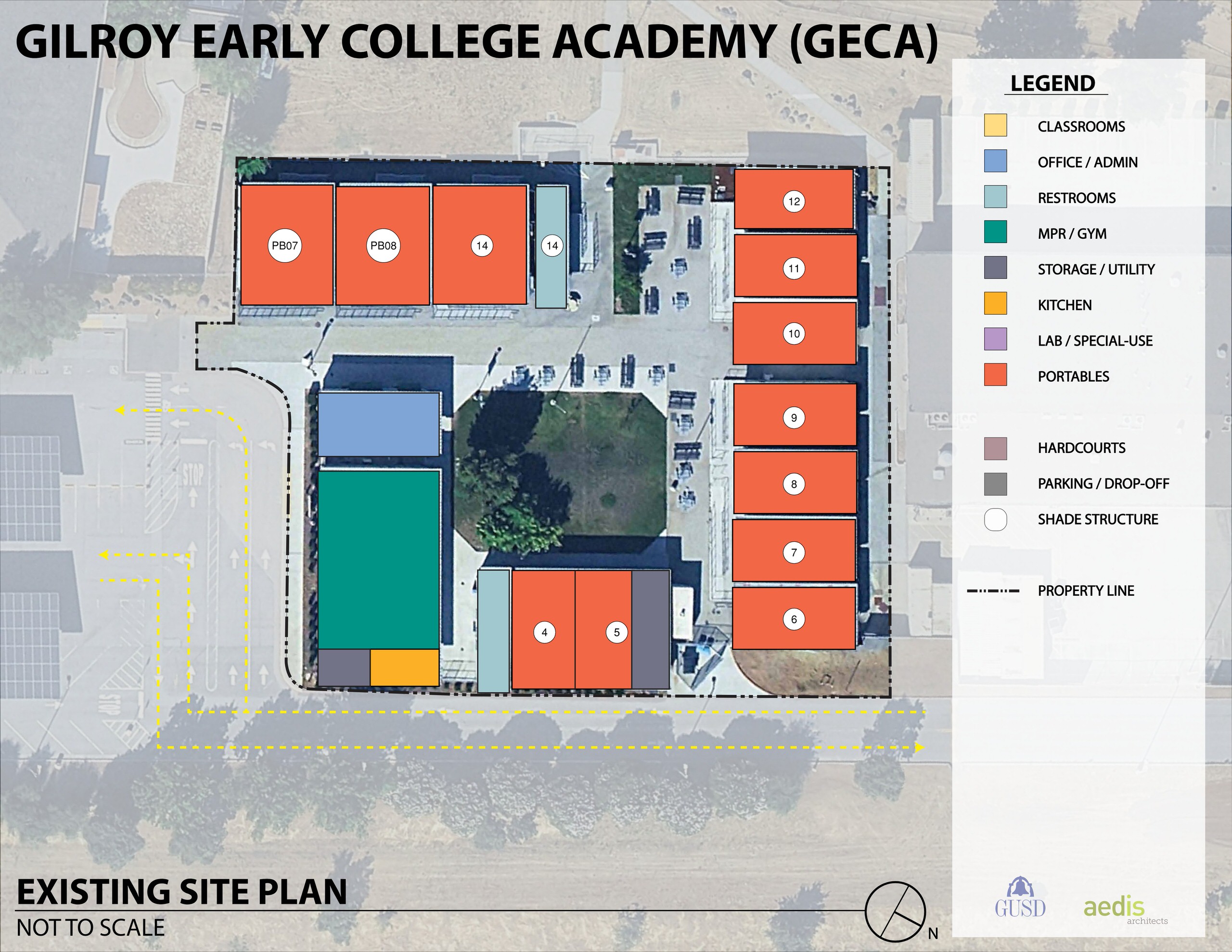 Gilroy Early College Academy (GECA) operates on the site of Gavilan College Campus in portables buildings. The portables are organized around a small central quad that includes grass areas and lunch tables, creating a pleasant but limited outdoor gathering space. Campus facilities include general education classrooms, administrative offices, a multi-purpose room with an adjoining kitchen, restrooms, and storage spaces.