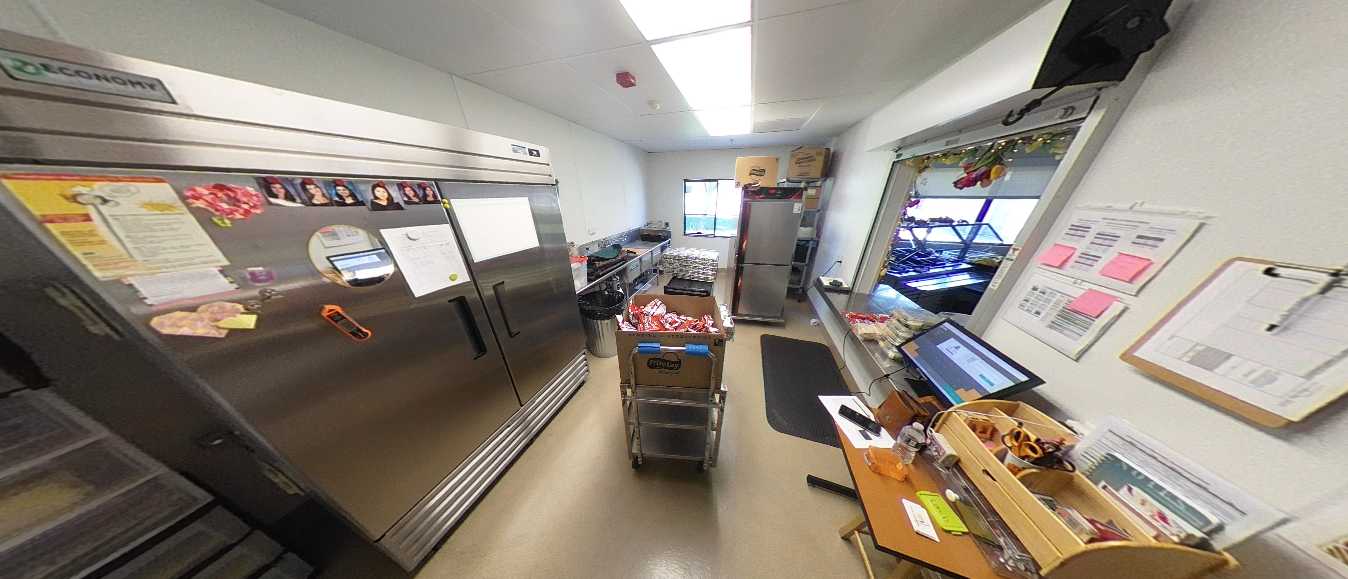 The space benefits from natural light on multiple sides and provides views of both the quad and parking area. While lunch tables throughout the quad support outdoor dining, the lack of shade or protection from the element’s limits usability.
