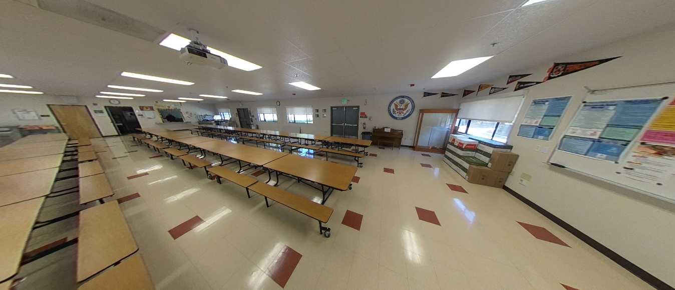 The multi-purpose portable functions as a cafeteria and student gathering space and is supported by an adjacent warming kitchen that is well maintained. Interior finishes include VCT flooring, tackable wall surfaces, multiple whiteboards, and ceiling-mounted projection equipment. Suspended ceiling tiles and recessed LED lighting are in good condition.