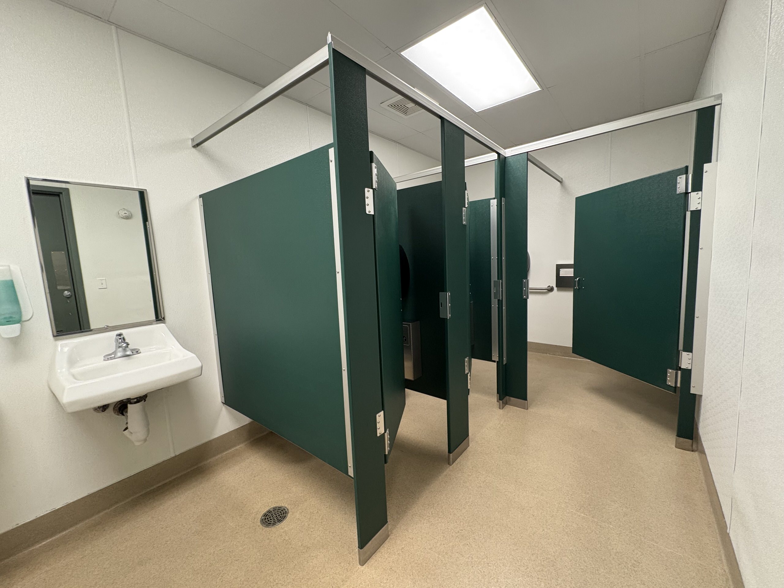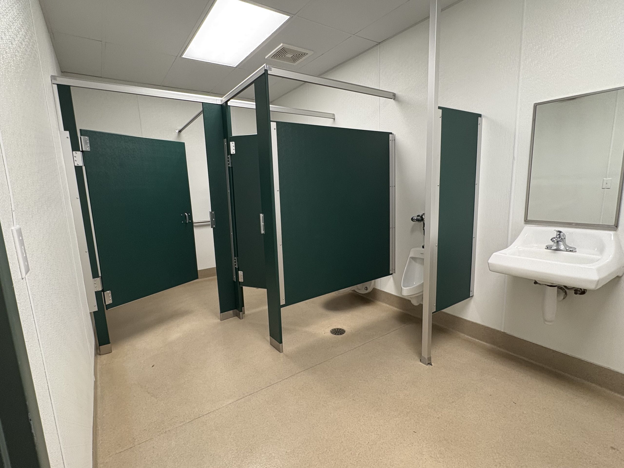 The restroom portables are in fair condition and generally accessible. Finishes include epoxy flooring, FRP wall panels, and suspended ceilings. Lighting is provided by LED fixtures, and plumbing fixtures remain serviceable. However, the placement of accessories such as dispensers and grab bars is inconsistent and does not always meet current accessibility standards.