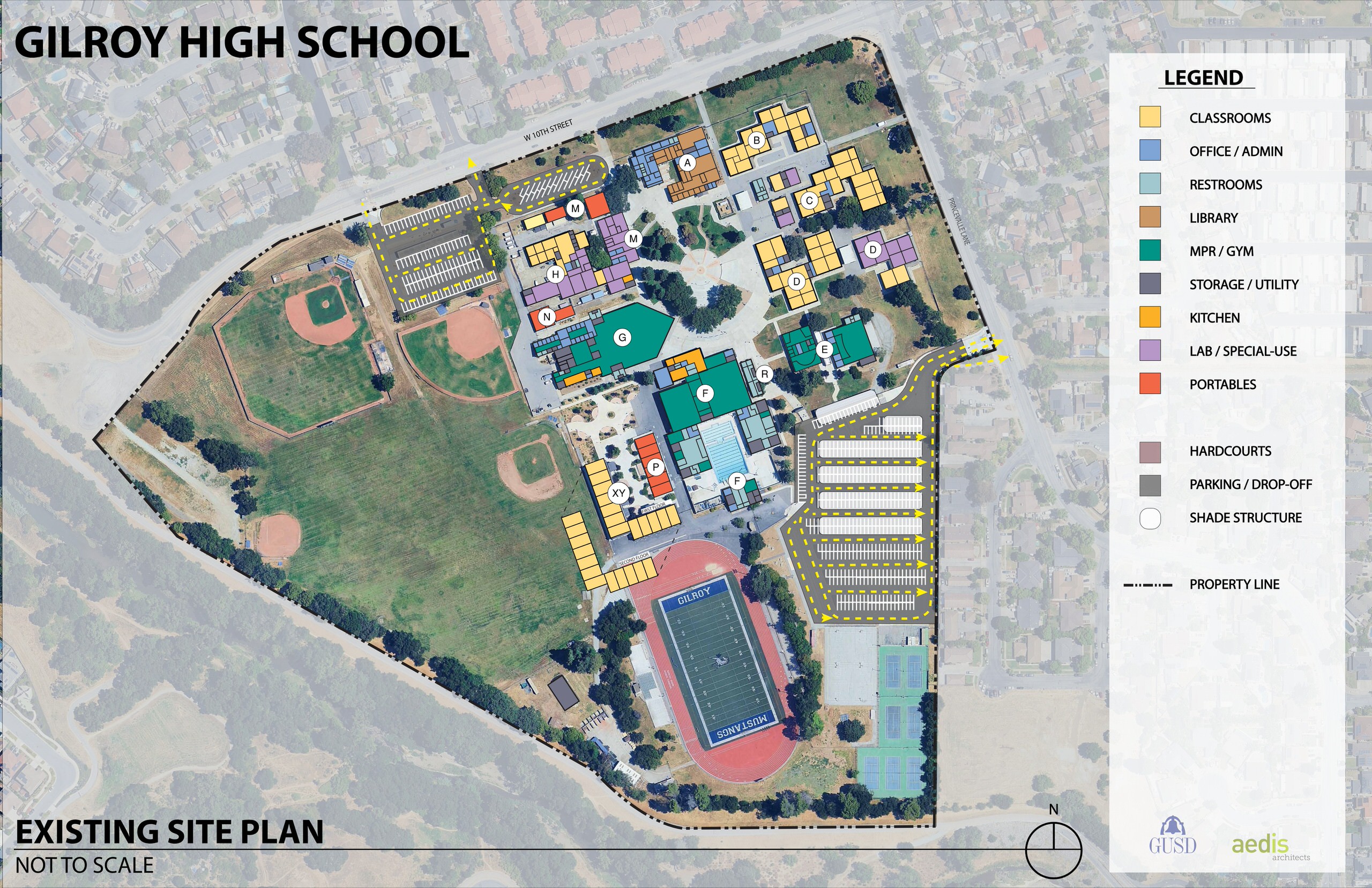 Gilroy High School is an aging campus with core facilities constructed in the late 1970s. While the campus remains operational, most buildings and site elements show significant deterioration and no longer meet contemporary standards for educational delivery, safety, accessibility, or programmatic flexibility. While the campus is a comprehensive high school and consists of permanent and portable classroom buildings, outdoor athletic facilities, Career Technical Education (CTE) spaces, and support facilities. Many of these areas lack the functionality and capacity required to support current programs and educational needs.