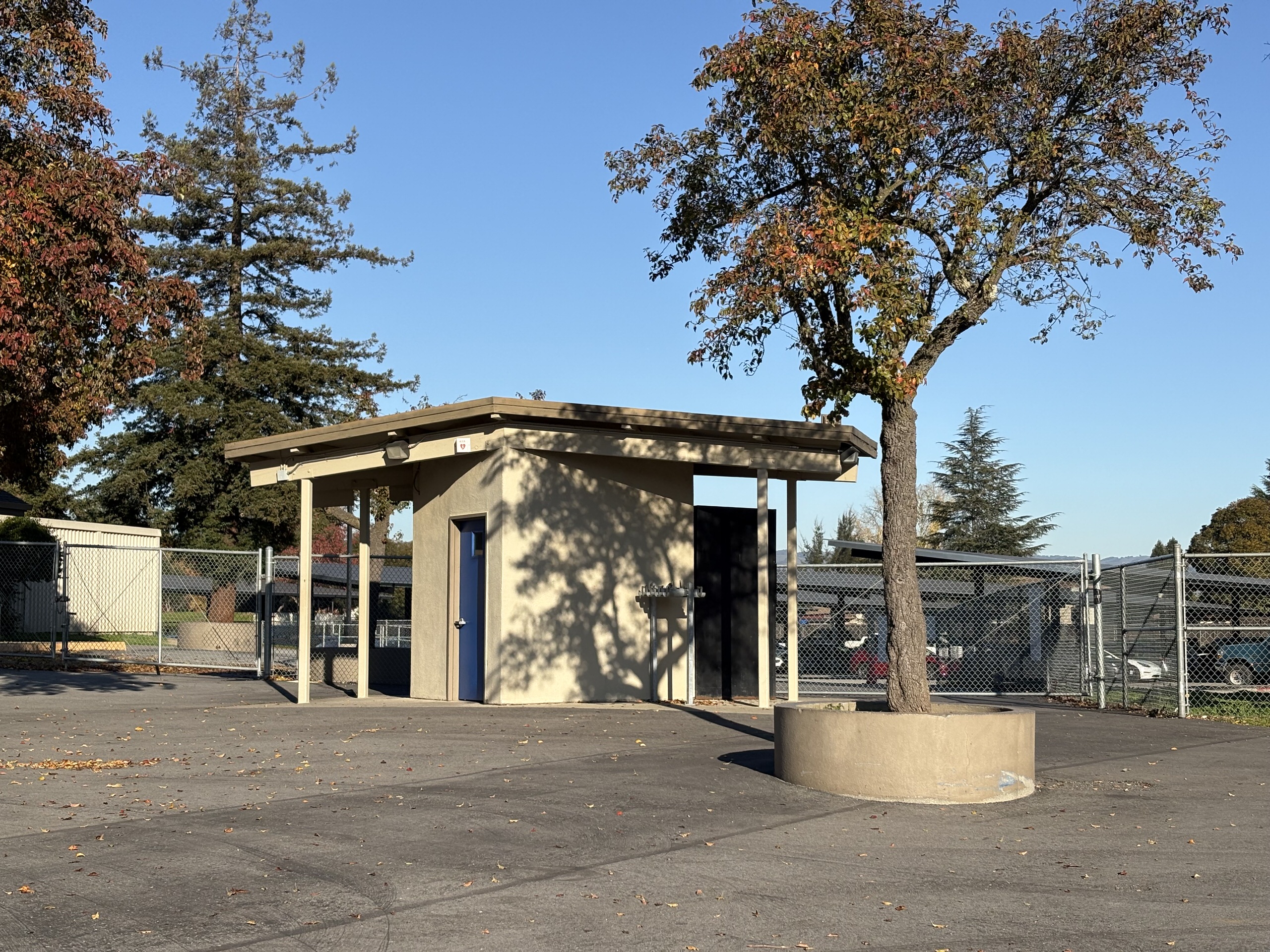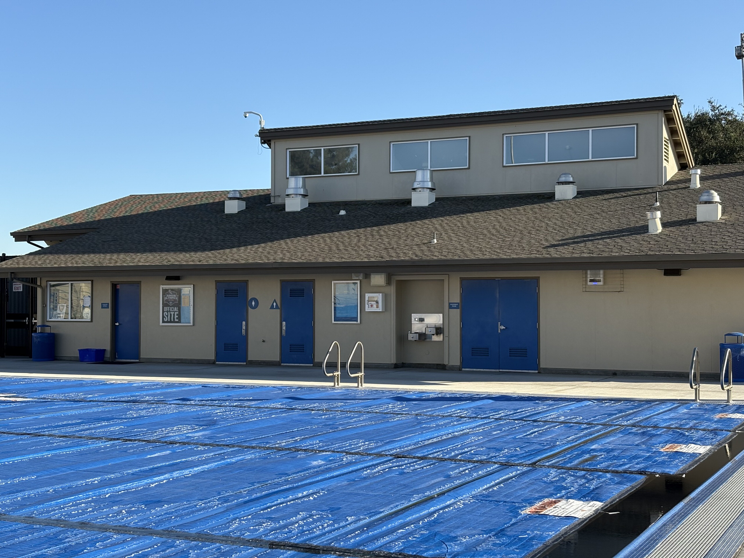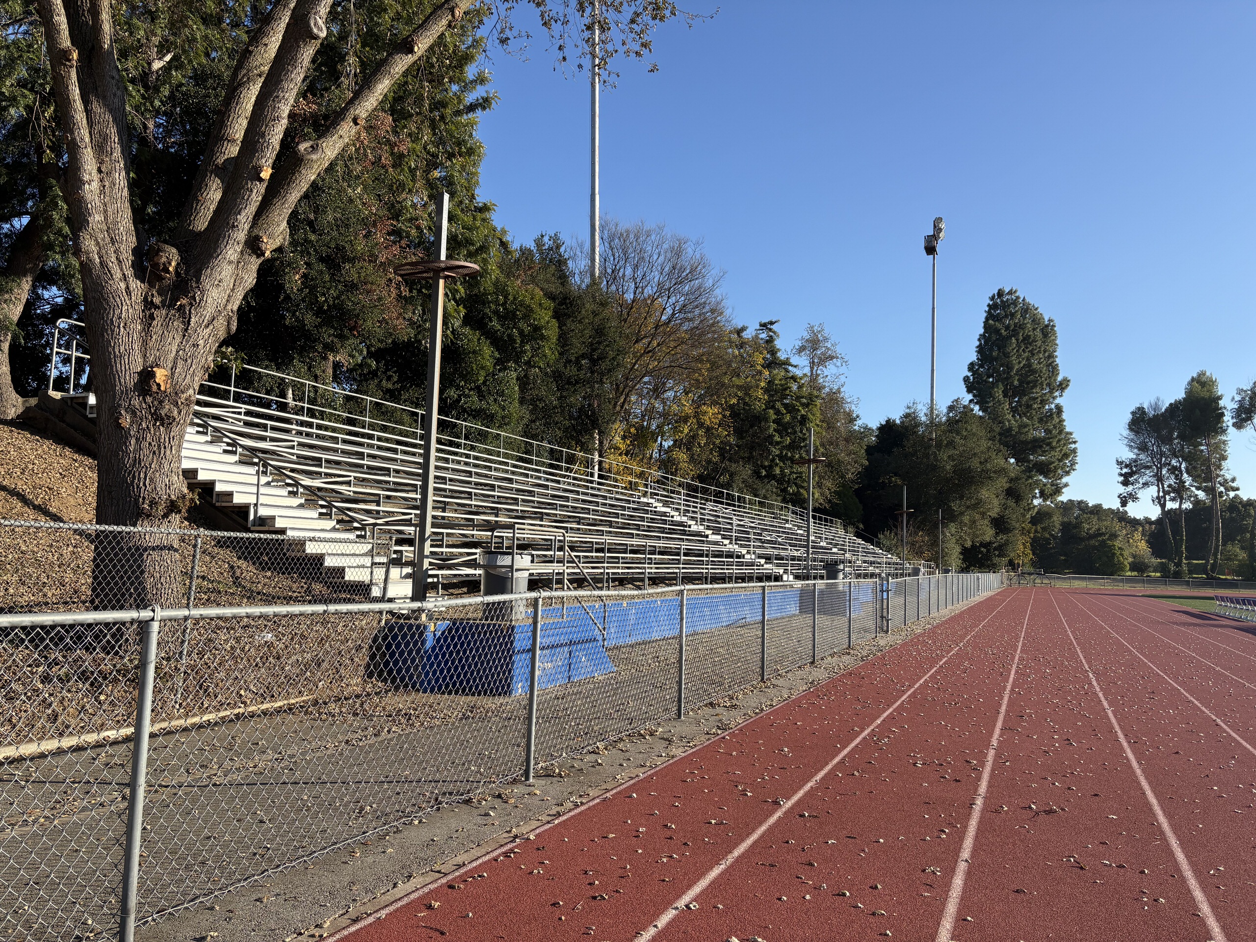 The gymnasium lacks air conditioning, and locker rooms are dated and inadequate. The baseball and softball fields exhibit uneven turf, irrigation deficiencies, and absence of permanent restrooms and spectator seating. The football stadium features outdated and non-accessible bleachers, a damaged track surface, and failing scoreboard and lighting systems. The weight room occupies a deteriorated portable building with compromised finishes. The recently renovated pool is supported by metal bleachers but lacks sufficient shade structures. The tennis courts are located at the campus perimeter and have limited access to water and restroom facilities.