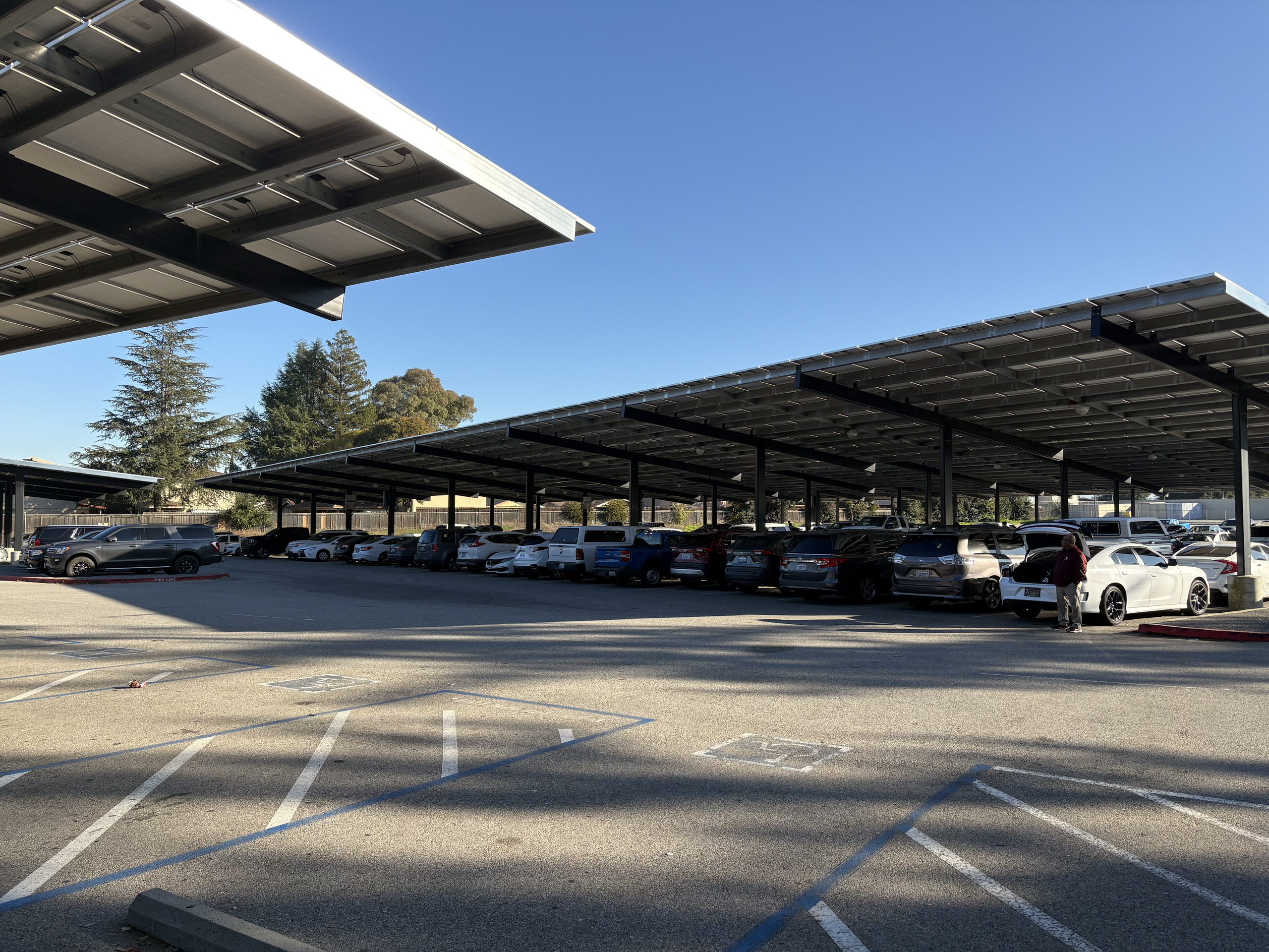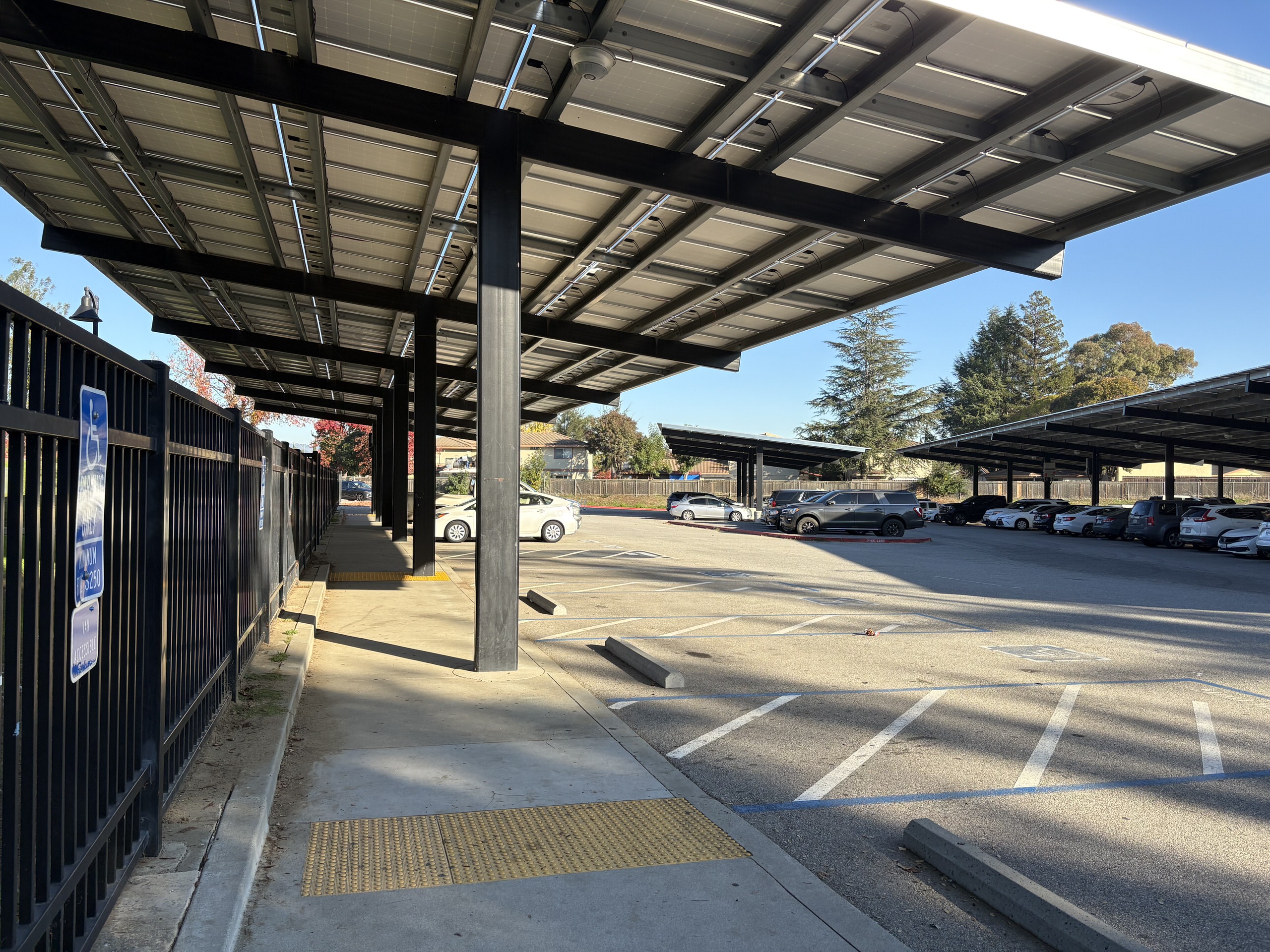 Landscape areas exhibit poor irrigation performance, and hydration stations are limited campus-wide. The main student parking lot along Princevalle Street contains large solar panel structures, while a smaller staff and visitor parking area provides access to administration from West 10th Street. Vehicular circulation, site access, and drop-off functions are insufficiently defined and require reconfiguration to improve safety and visibility of the main entrance.