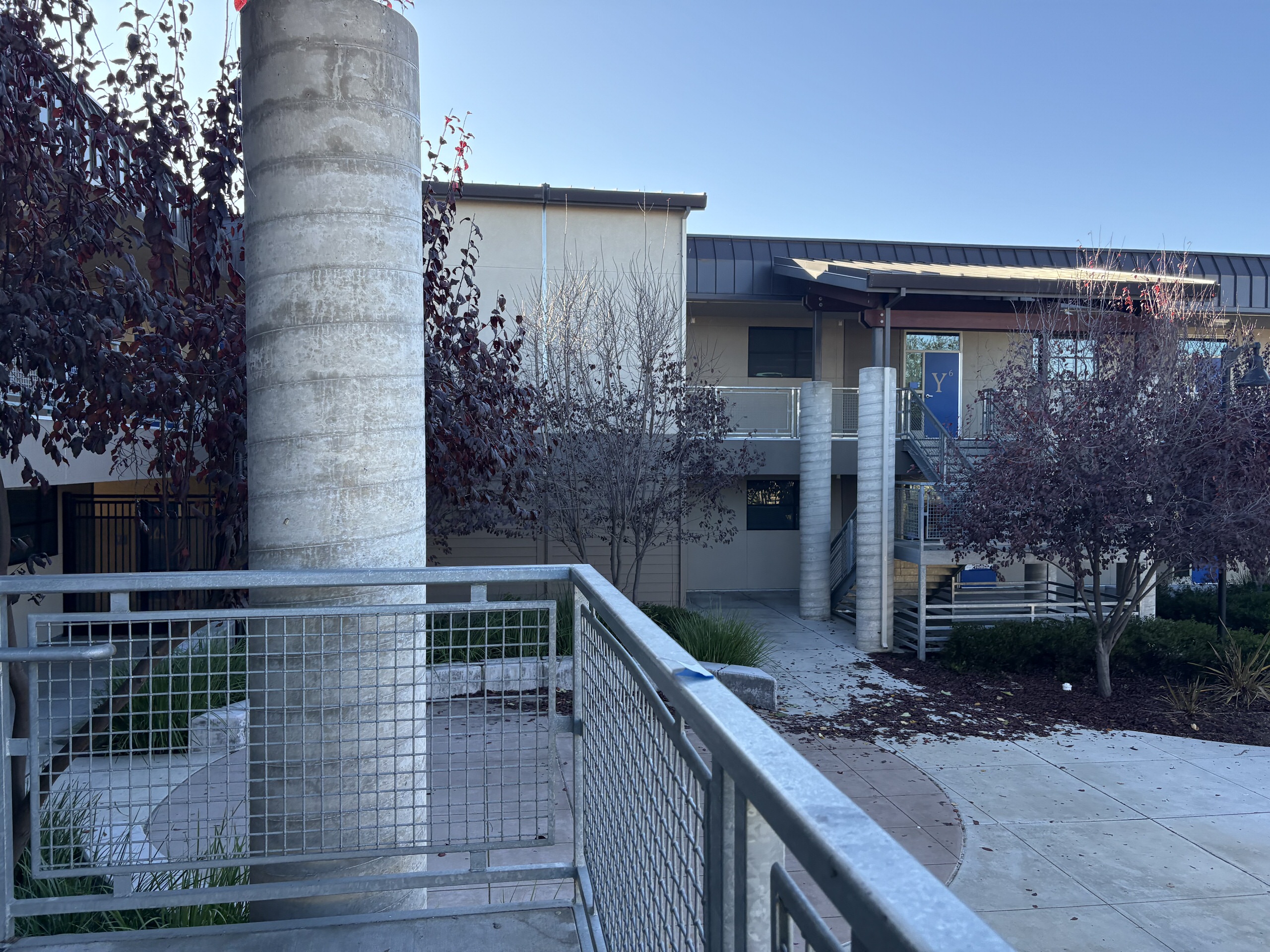 The administration and library complex is located on the north side of campus, with administration facing the visitor parking lot and the library oriented toward the quad. Wayfinding is unclear, and the main entrance is not easily identifiable from the primary campus approach. The two program elements intersect at a courtyard, where the administrative entry is positioned but not prominently visible.