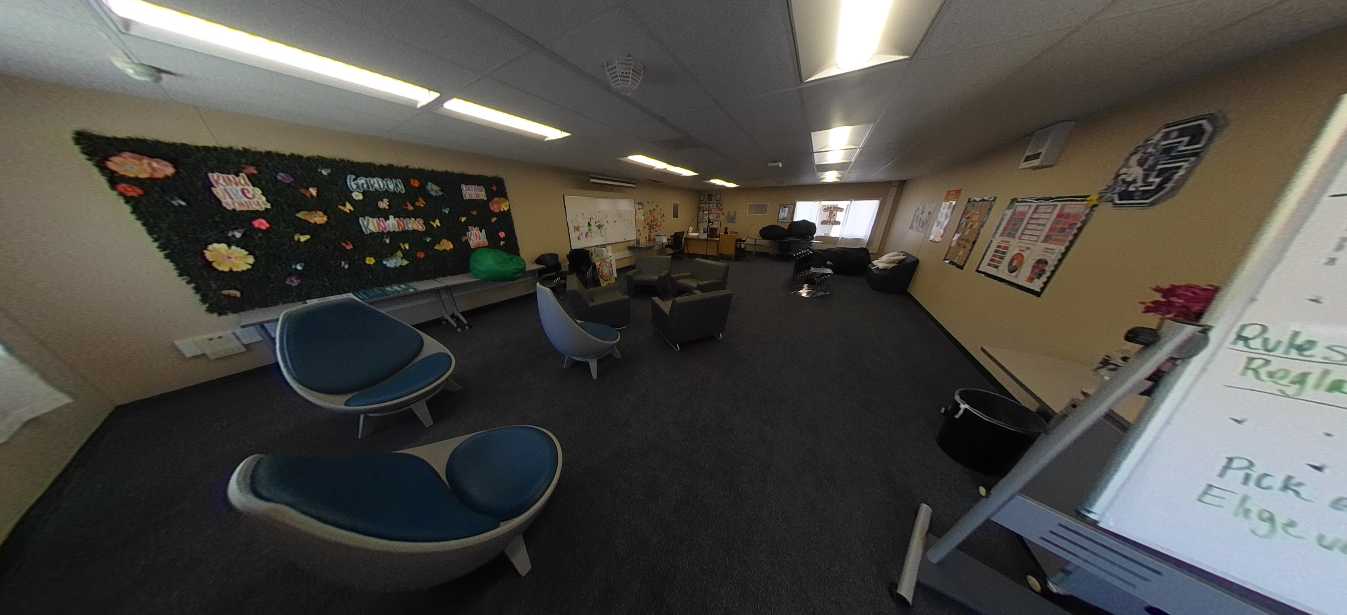 Standard classroom facilities are arranged around the central quad and include both single-story and two-story buildings. Single-story buildings are in the poorest condition, exhibiting failing ceiling and flooring finishes, outdated furnishings, limited glazing, and reliance on mobile technology carts. The two-story buildings are generally in better condition and include flexible furniture and improved finishes.