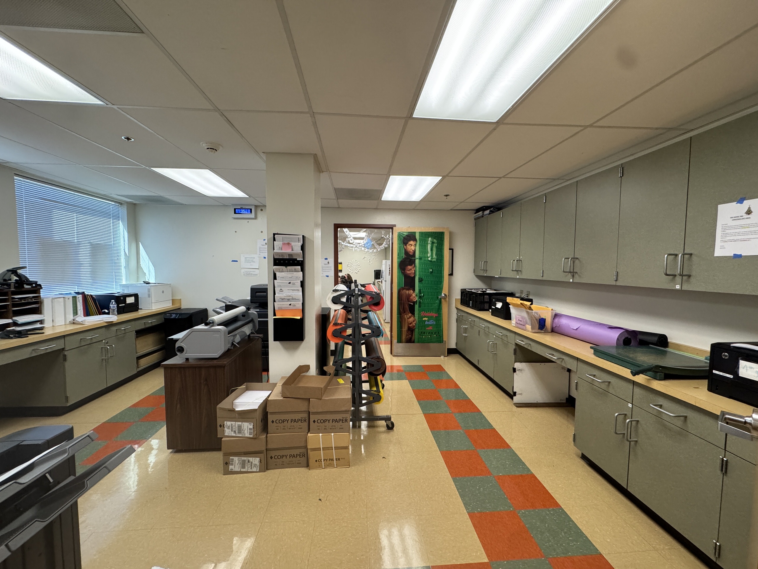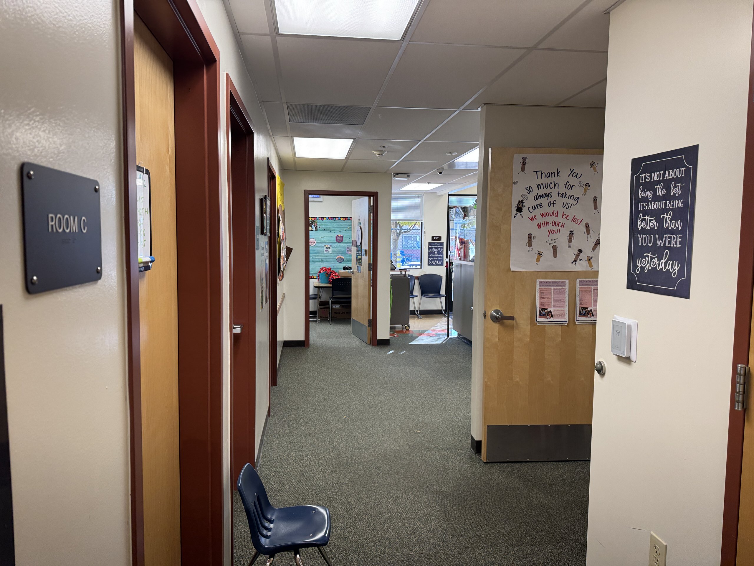 The administration building (Wing A) and primary campus entrance are located along the Princevalle Street drop-off area. In addition to administrative functions, Wing A includes three classrooms extending along the length of the adjacent parking lot. Administrative spaces consist of a small reception area, nurse’s office, principal’s office, and a combined staff lounge/workroom. Restroom fixtures present accessibility challenges, and the overall office layout is inefficient with limited visibility to the campus entrance. Additionally, the primary campus entry does not align with the school’s official address, resulting in wayfinding difficulties for visitors and families.