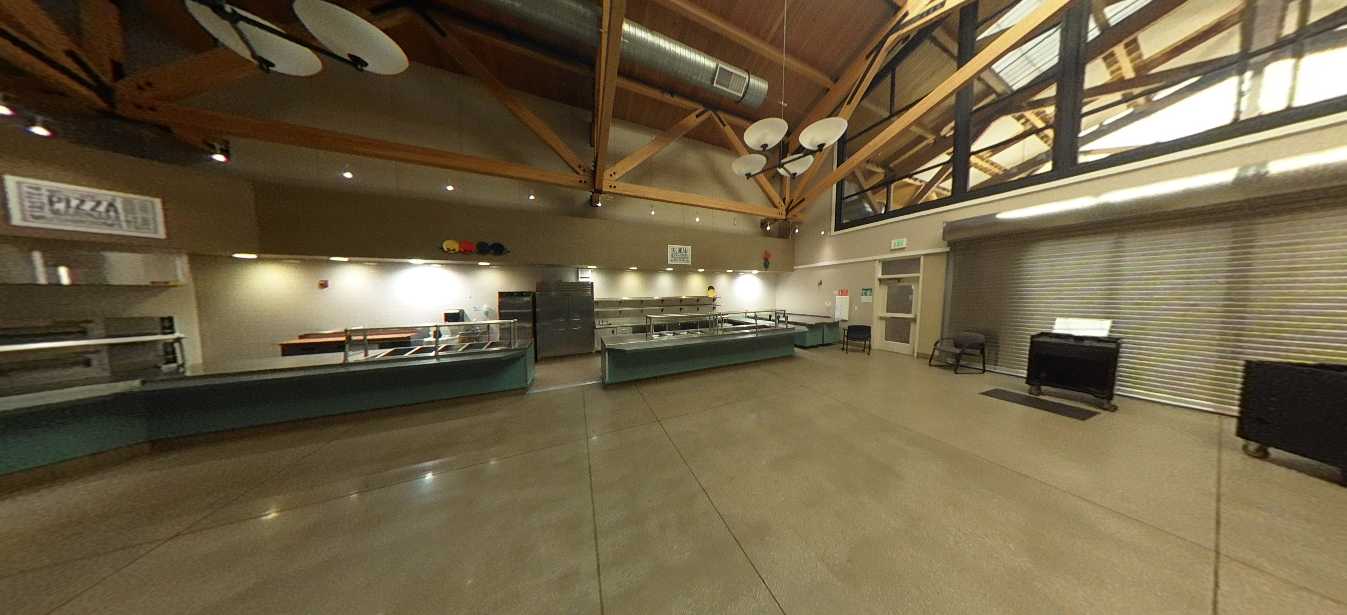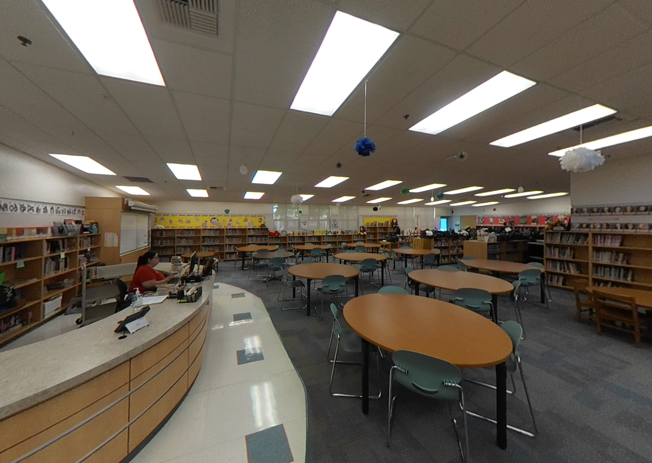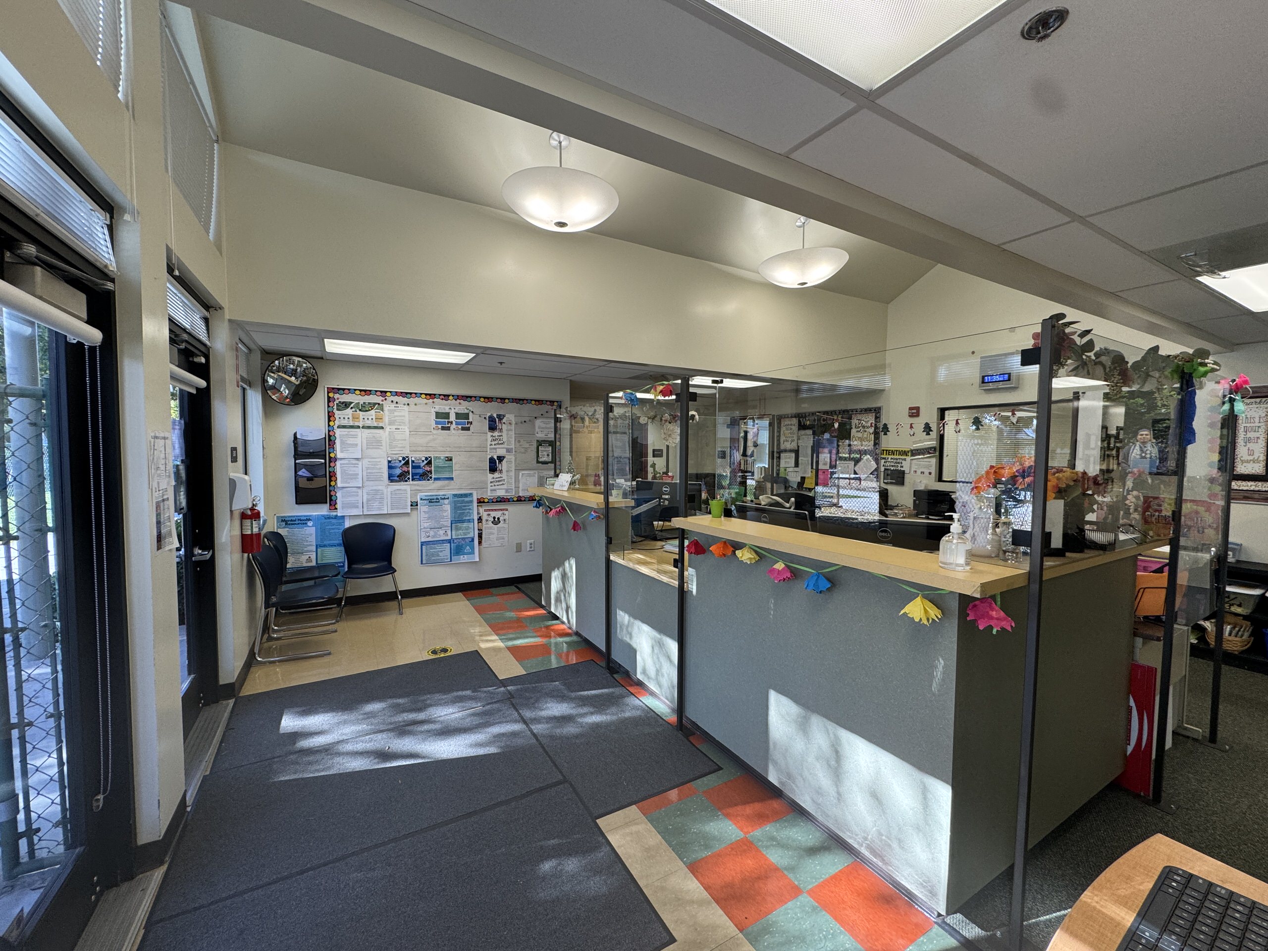 The Multi-Purpose and Library Building is located behind the Kindergarten complex, oriented toward the 9th Street drop-off area. The Multi-Purpose Room features colorful accent flooring, high ceilings with clerestory windows, perimeter lunch tables, and a stage. The kitchen opens to the Multi-Purpose Room via a large roll-up door and includes an accessible high-low drinking fountain with bottle filler. The library contains heavy round tables, large book stacks, a long computer workstation, a projector screen, and a monitor cart. A sizable reception area occupies the front of the space, with storage located at the rear. Overall, this building is in good condition.