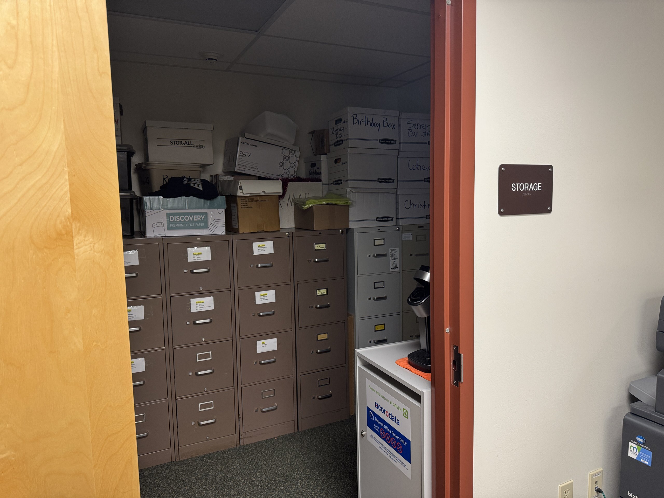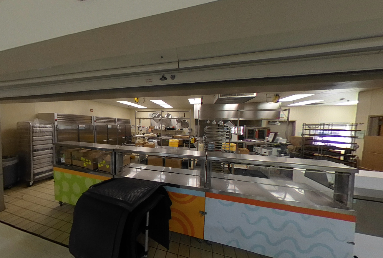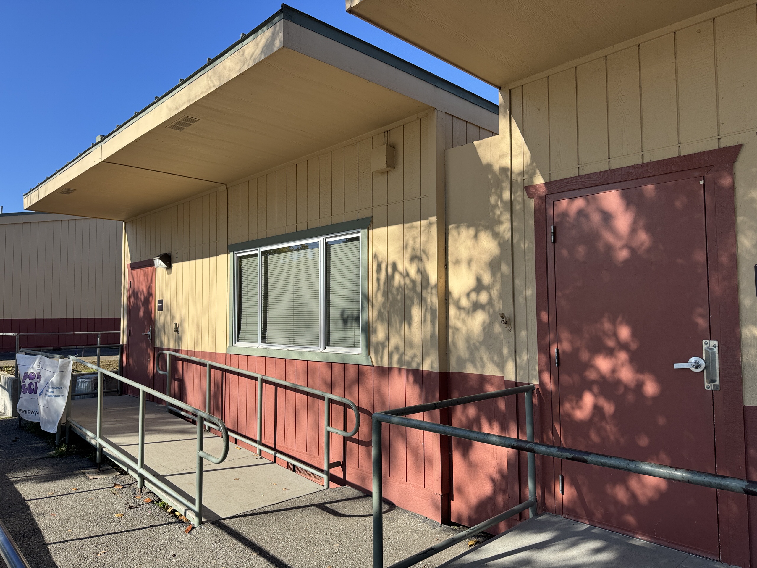 The Multi-Purpose and Library Building is located behind the Kindergarten complex, oriented toward the 9th Street drop-off area. The Multi-Purpose Room features colorful accent flooring, high ceilings with clerestory windows, perimeter lunch tables, and a stage. The kitchen opens to the Multi-Purpose Room via a large roll-up door and includes an accessible high-low drinking fountain with bottle filler. The library contains heavy round tables, large book stacks, a long computer workstation, a projector screen, and a monitor cart. A sizable reception area occupies the front of the space, with storage located at the rear. Overall, this building is in good condition.