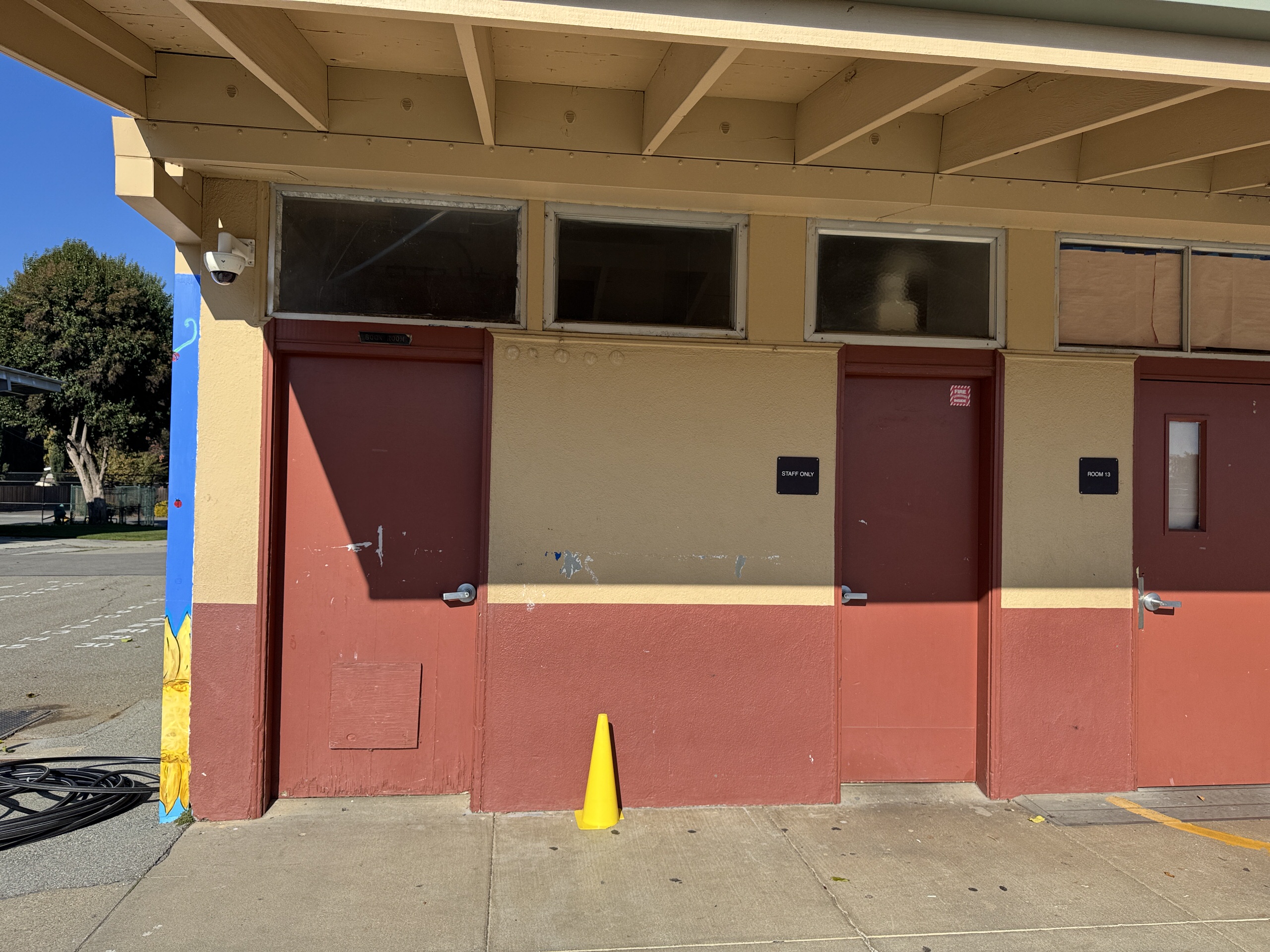 The campus includes four permanent classroom buildings (Wings A, B, O, and N), two permanent Kindergarten buildings (K and U), and nine portable classrooms. Building exteriors show deteriorated metal overhangs and gutters. Typical classrooms include operable front windows and clerestory windows with horizontal blinds. Interiors are teacher-customized and furnished with aging, heavy furniture. HVAC units located within classroom closets produce significant noise during operation. Restrooms in these buildings have high ceilings and clerestory windows, though several present accessibilities concerns. Most permanent classroom buildings are in generally adequate condition, with the exception of Building N, which is in notably poor condition.