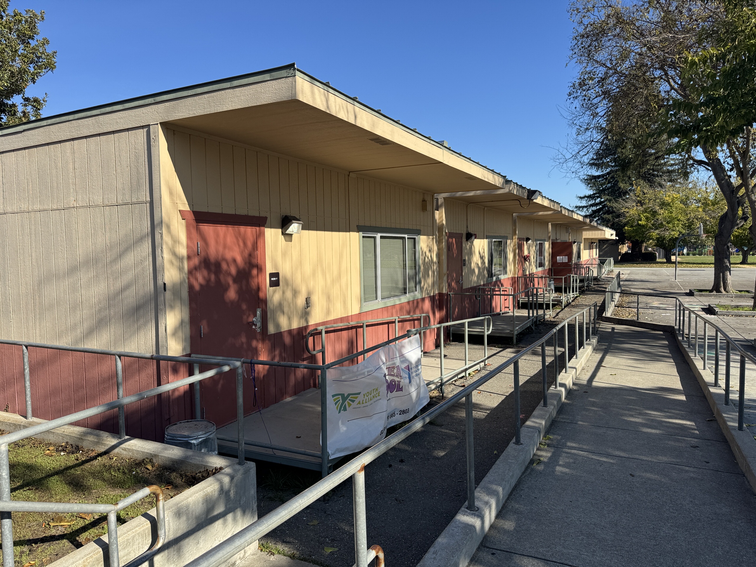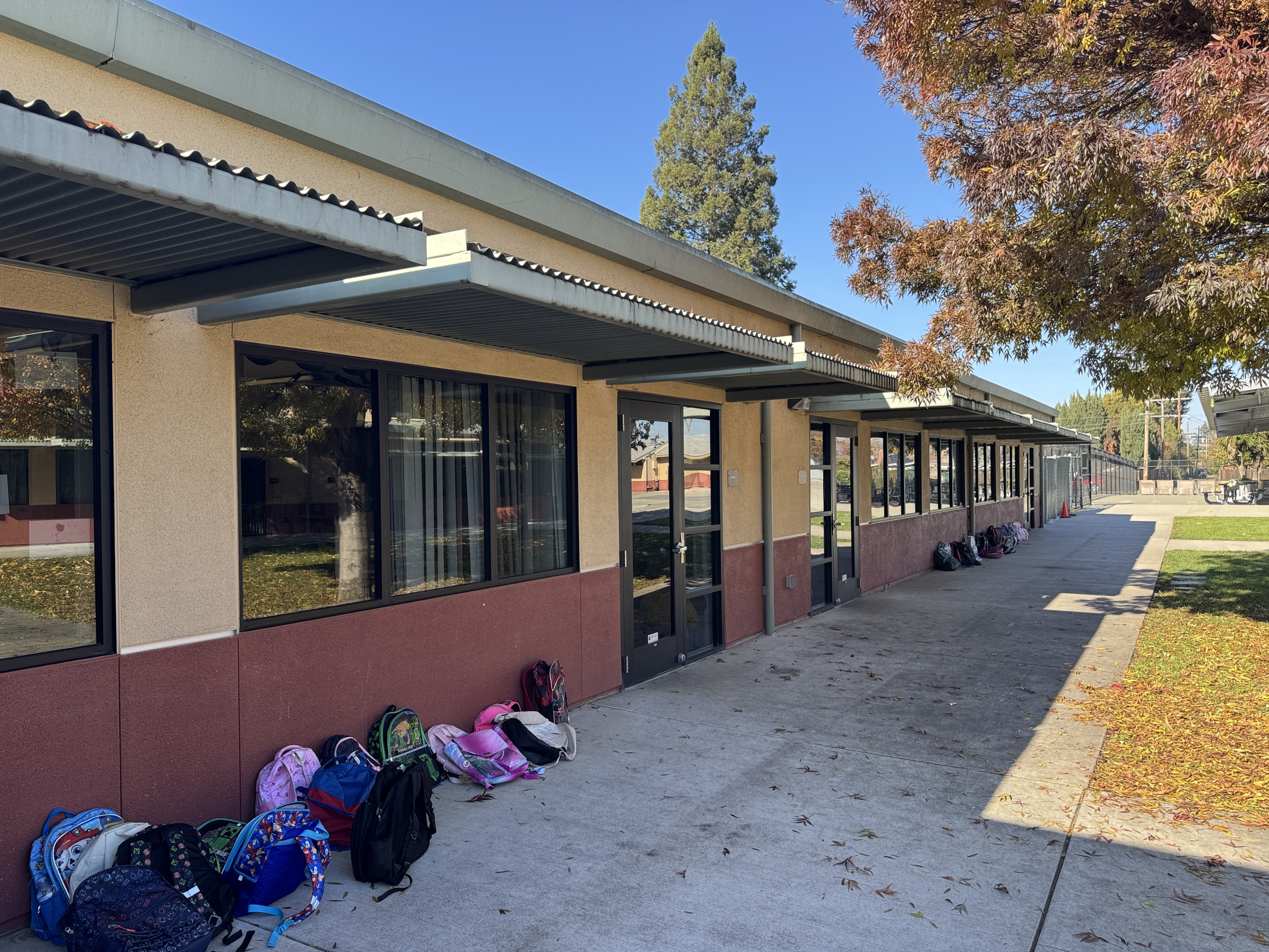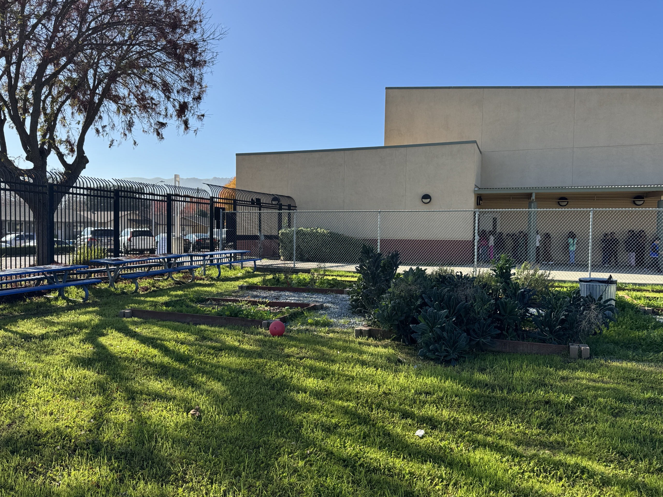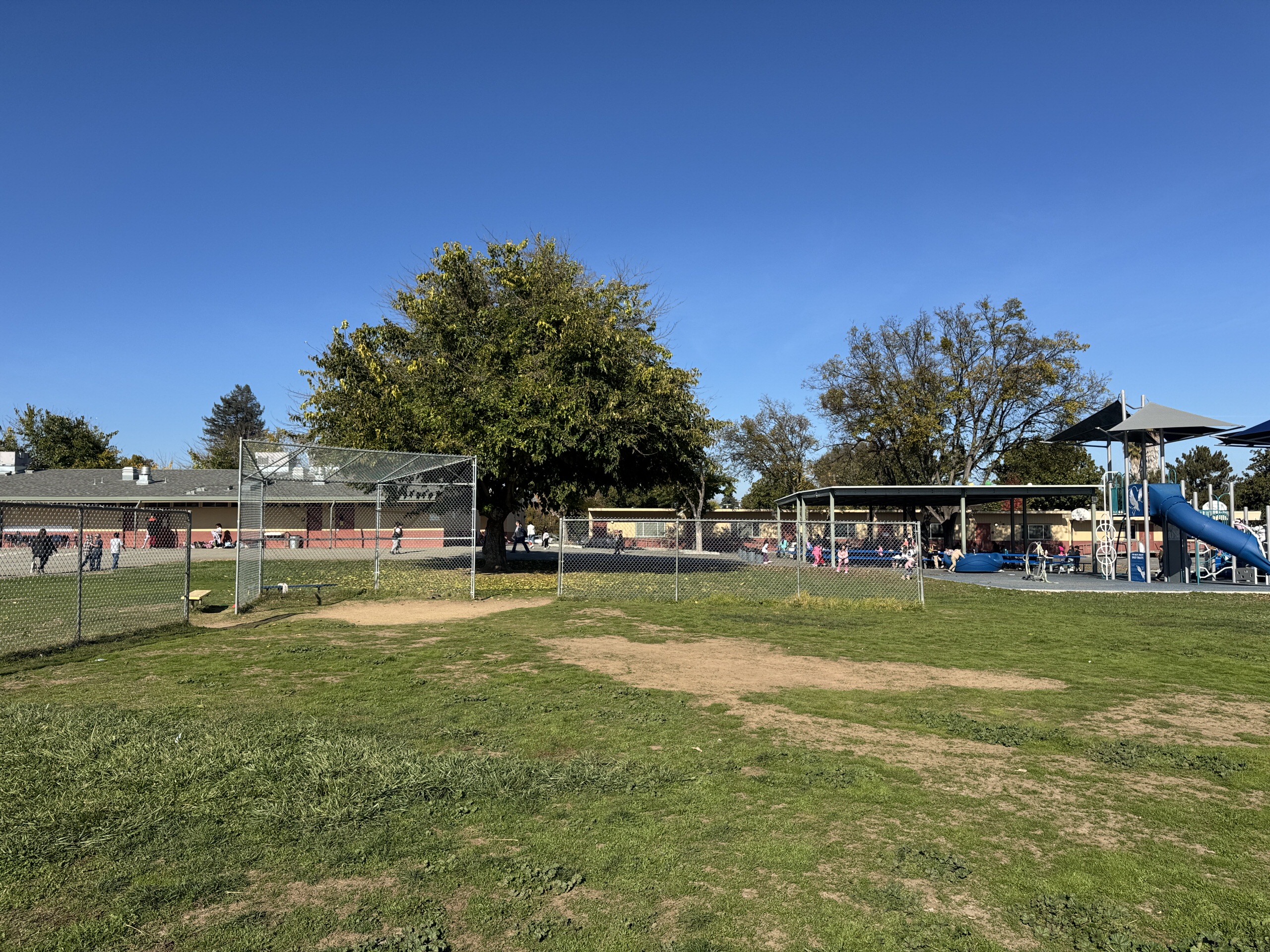 The campus includes blacktop play areas, TK/Kinder and upper-grade play structures, grass fields, solar shade structures, and mature shading trees. While the play structures are accessible, they do not provide adapted or inclusive play equipment. The covered lunch area is limited in size, and additional shade structures would significantly improve outdoor usability. The main grass field experiences substantial drainage issues, resulting in persistent muddy conditions. The site is fully enclosed by chain-link fencing. Three parking lots serve the campus, two of which also function as drop-off areas; however, there is no clearly designated visitor or parent parking, and accessible parking spaces are non-compliant. These deficiencies contribute to congestion, overcrowding, and instances of illegal parking.