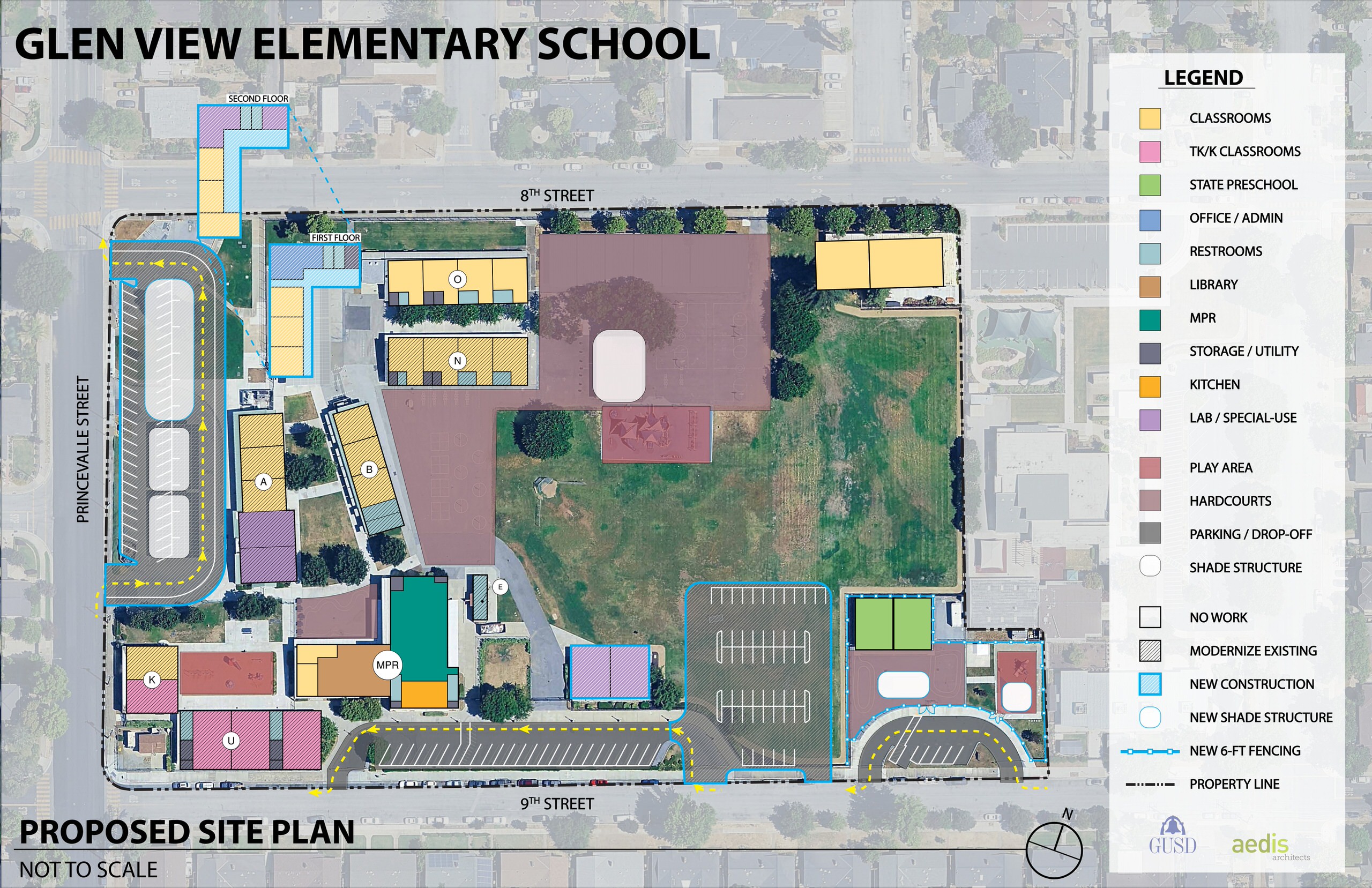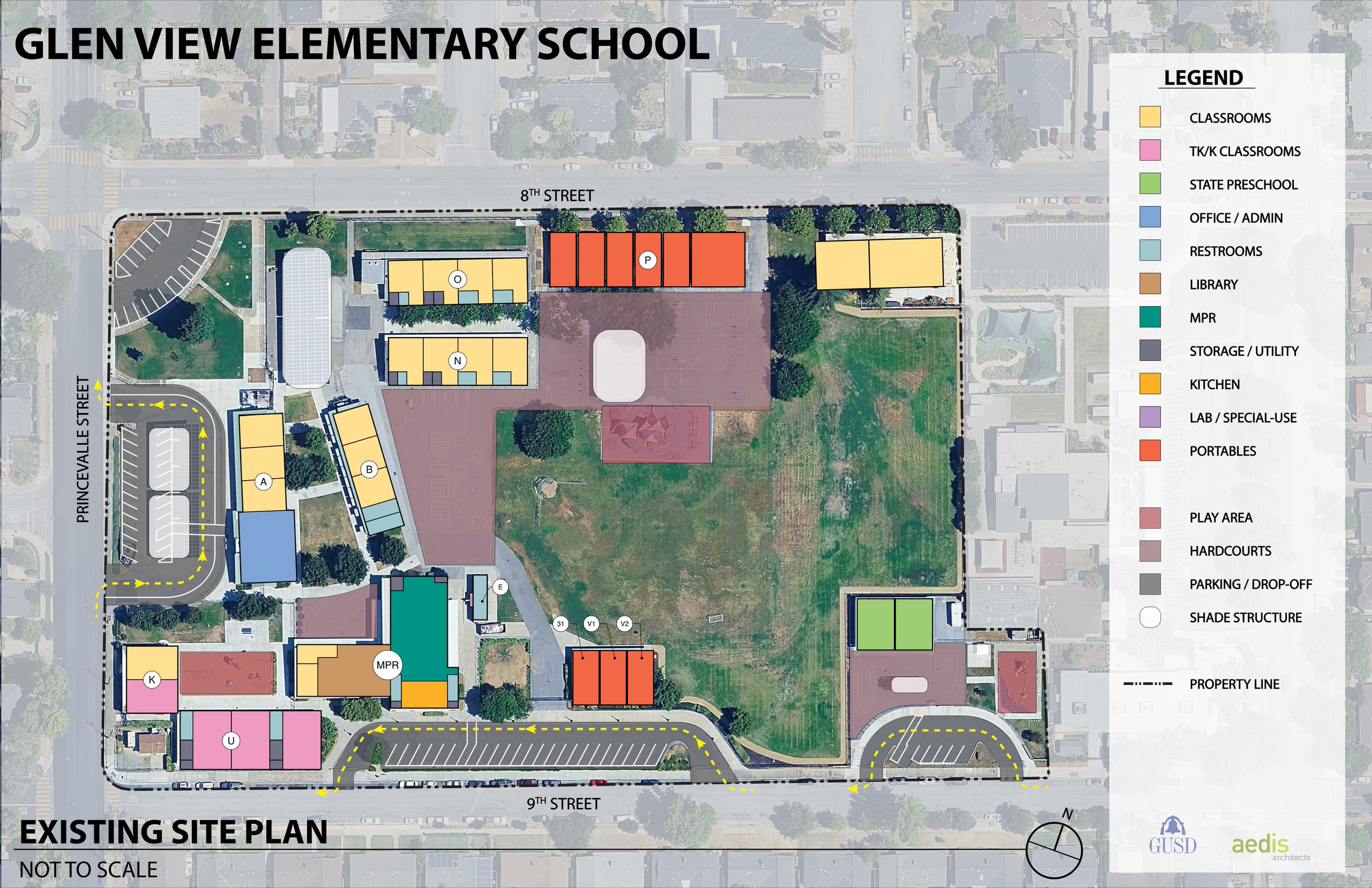 The Glen View Elementary School campus comprises a combination of permanent classroom buildings constructed in 1950 and 2004, portable classrooms installed in 1997, and select modernization efforts completed in 2014. The administration building and primary campus entry are located adjacent to a drop-off and parking area along Princevalle Street. Two additional parking lots are located at the corner of Princevalle Street and 8th Street and along 9th Street. The newer classroom buildings, connected to the administration building, form two academic wings with a central grass “plaza” between them. The older classroom buildings (Buildings O and N) follow a similar configuration and open to a landscaped area with mature shade trees. The Kindergarten buildings and Multi-Purpose Room define the corner of the campus between Princevalle and 9th Street.