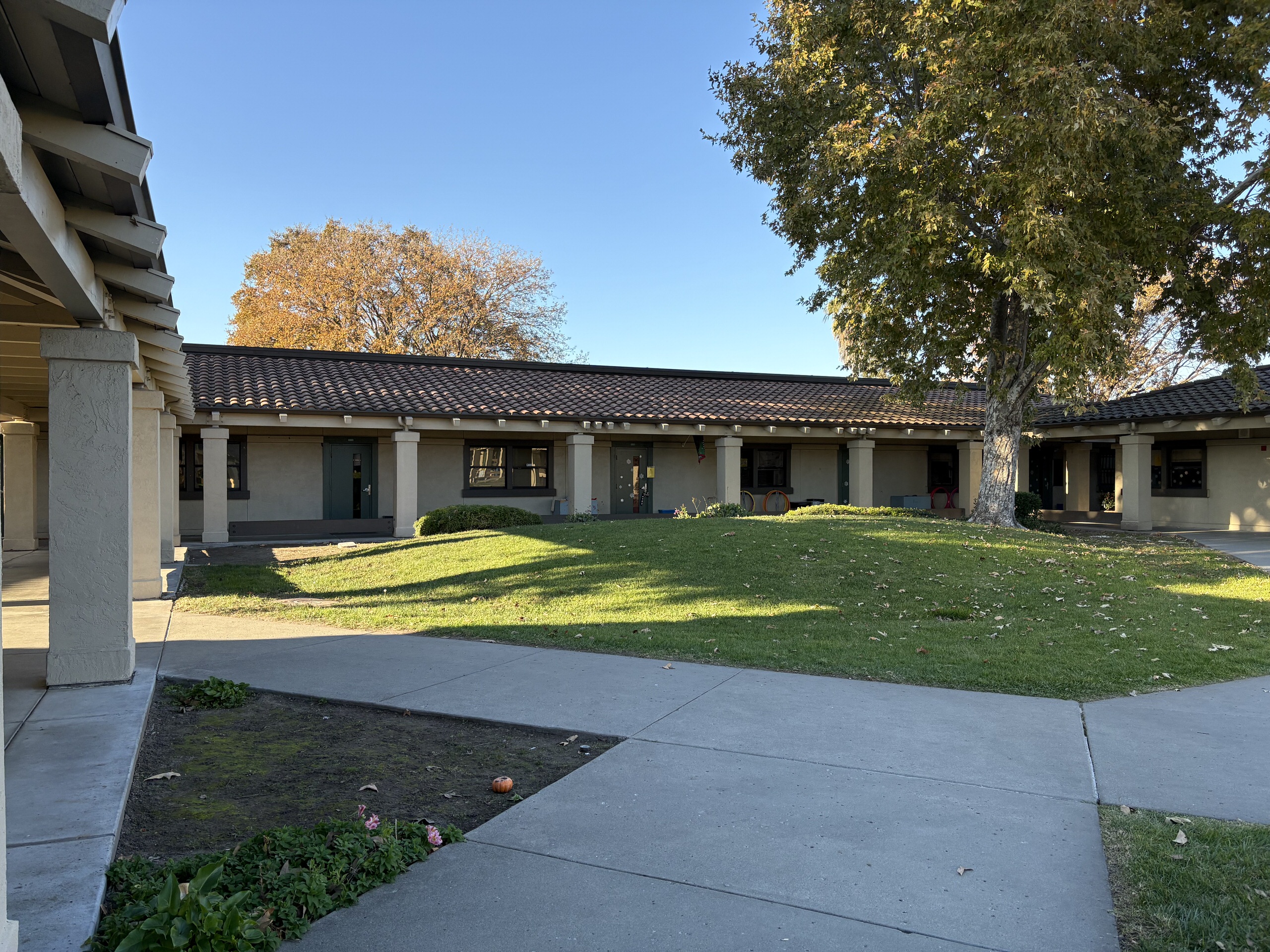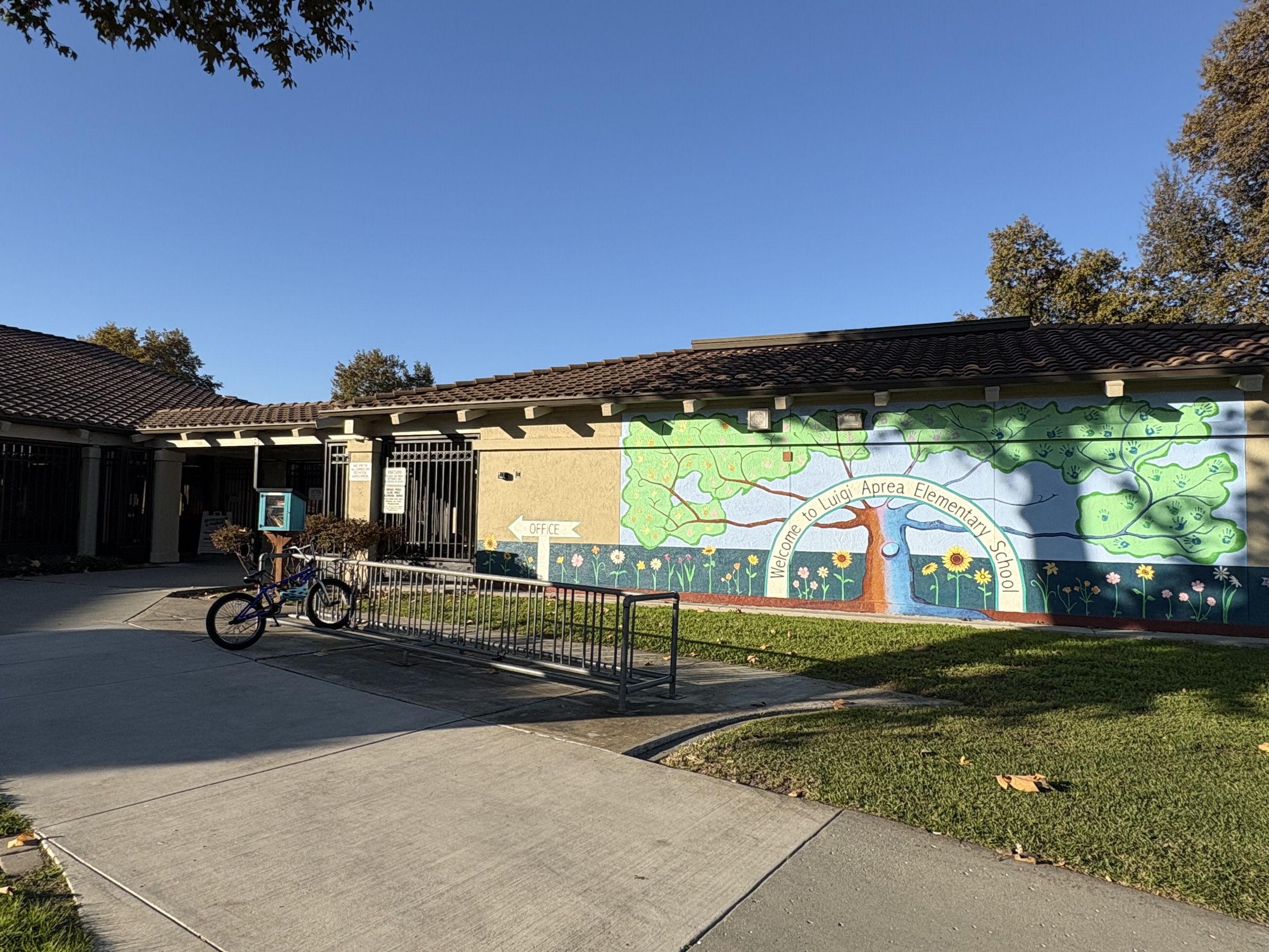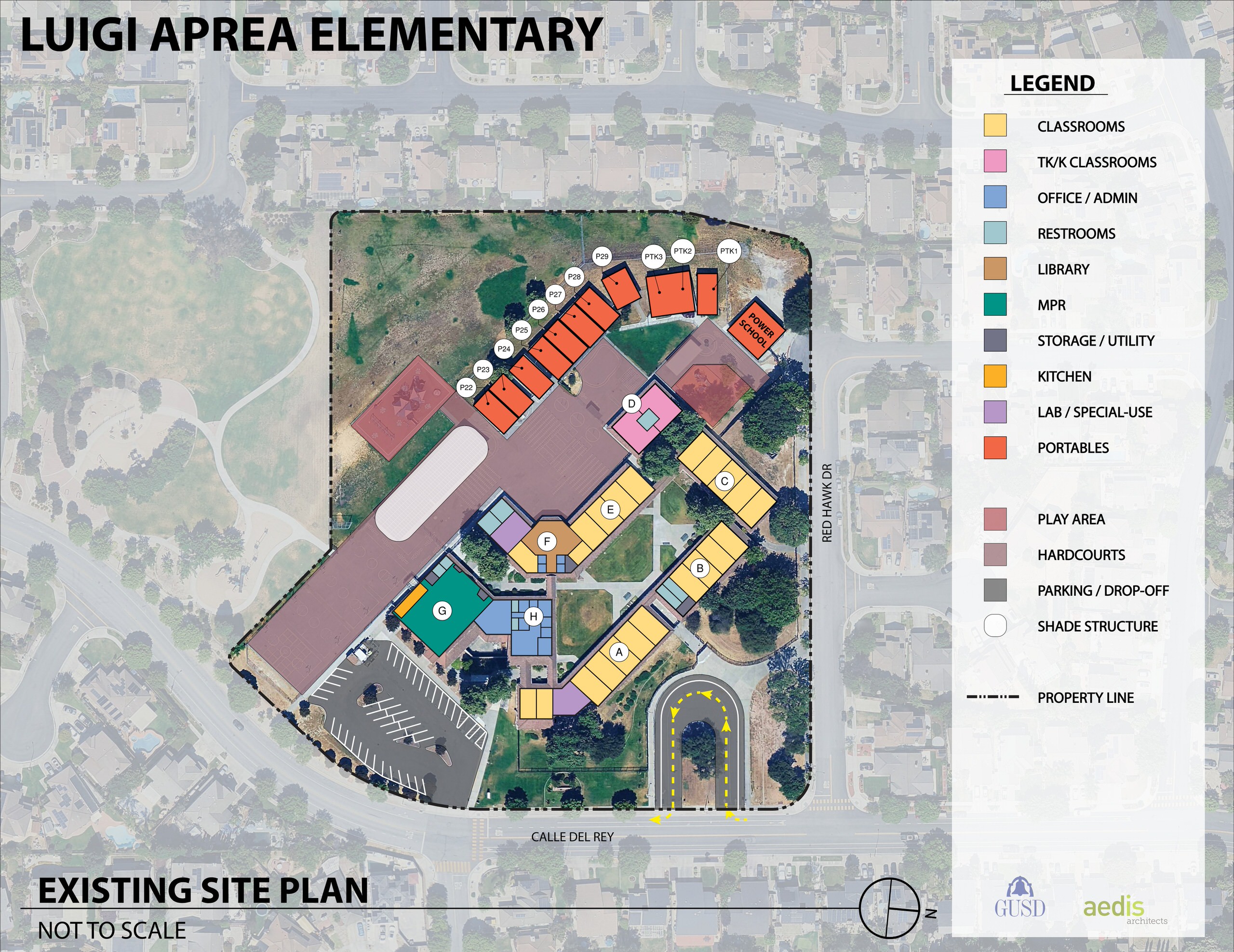 Luigi Aprea Elementary School consists of single-story stucco buildings connected by covered breezeways, with the administration building fronting the main parking lot along Calle Del Rey. Five permanent classroom buildings are arranged behind the administration building to form a central learning courtyard composed of grass areas, concrete walkways, and seating. While the campus layout is cohesive and functional, many portable buildings and site amenities exhibit signs of aging. Recent investments, including roof replacement, fencing upgrades, and playground improvements, demonstrate ongoing efforts to maintain a safe and organized school environment.