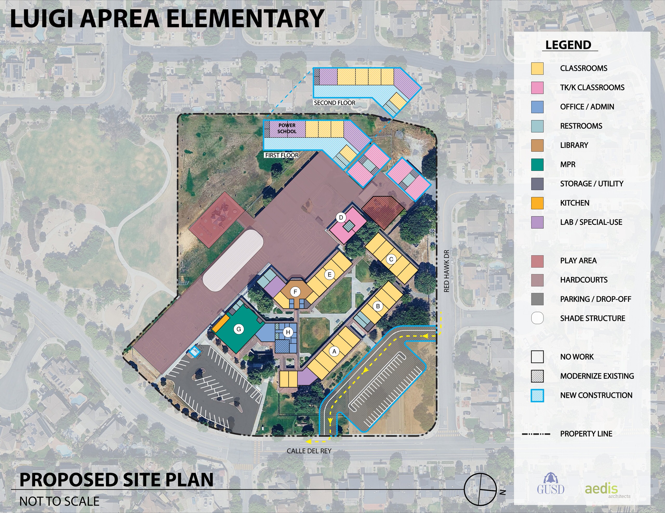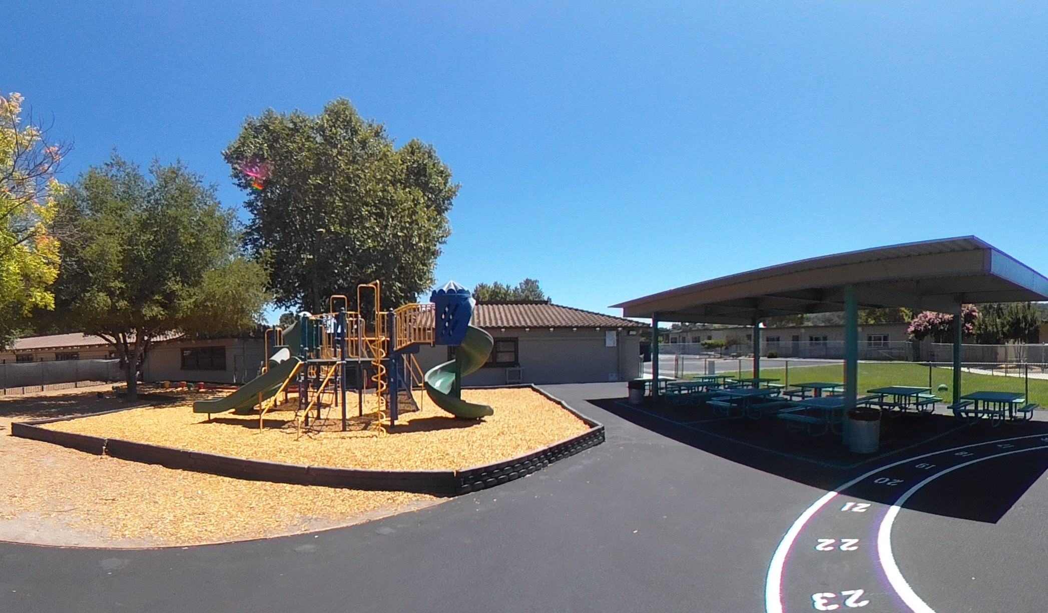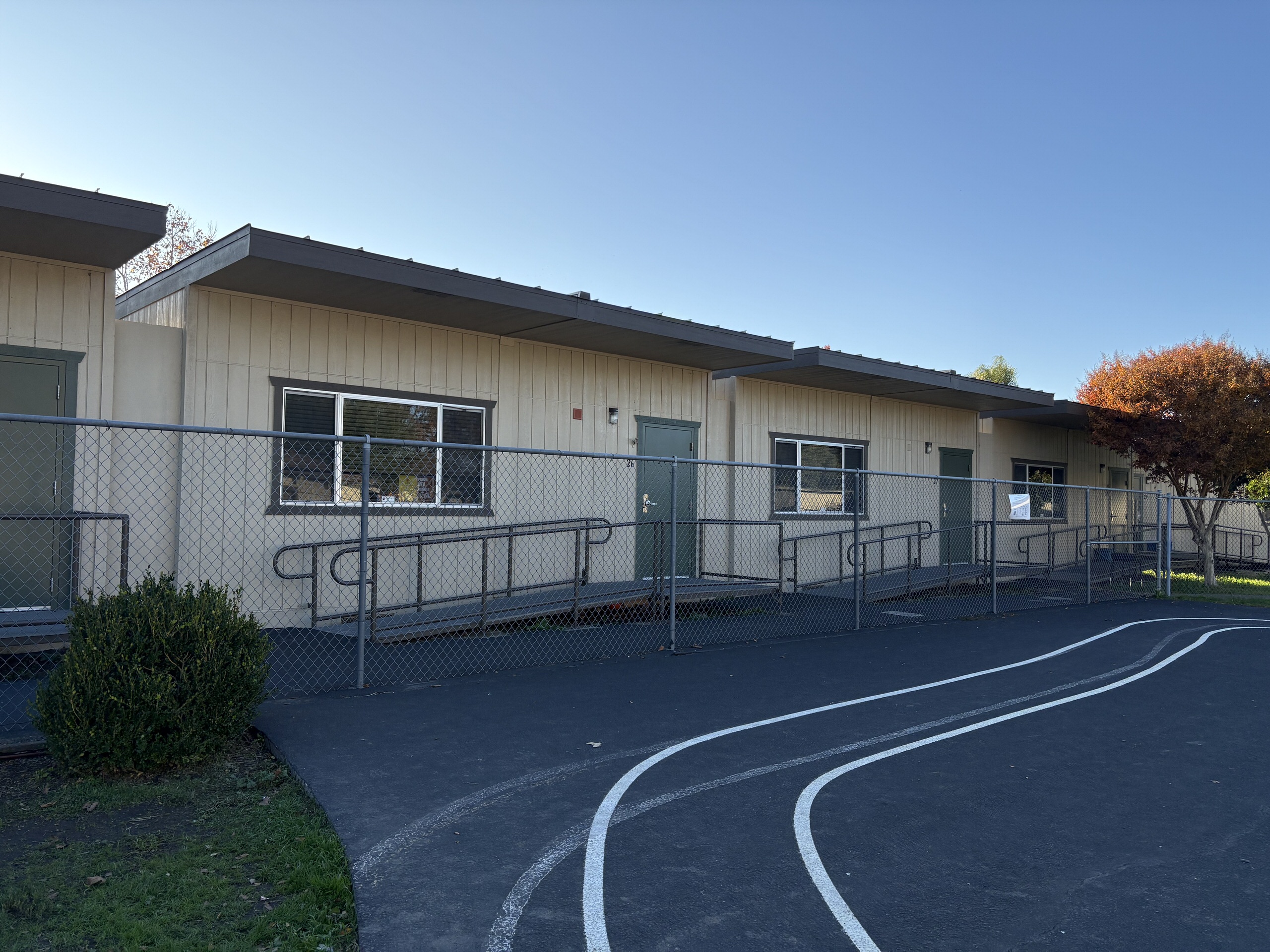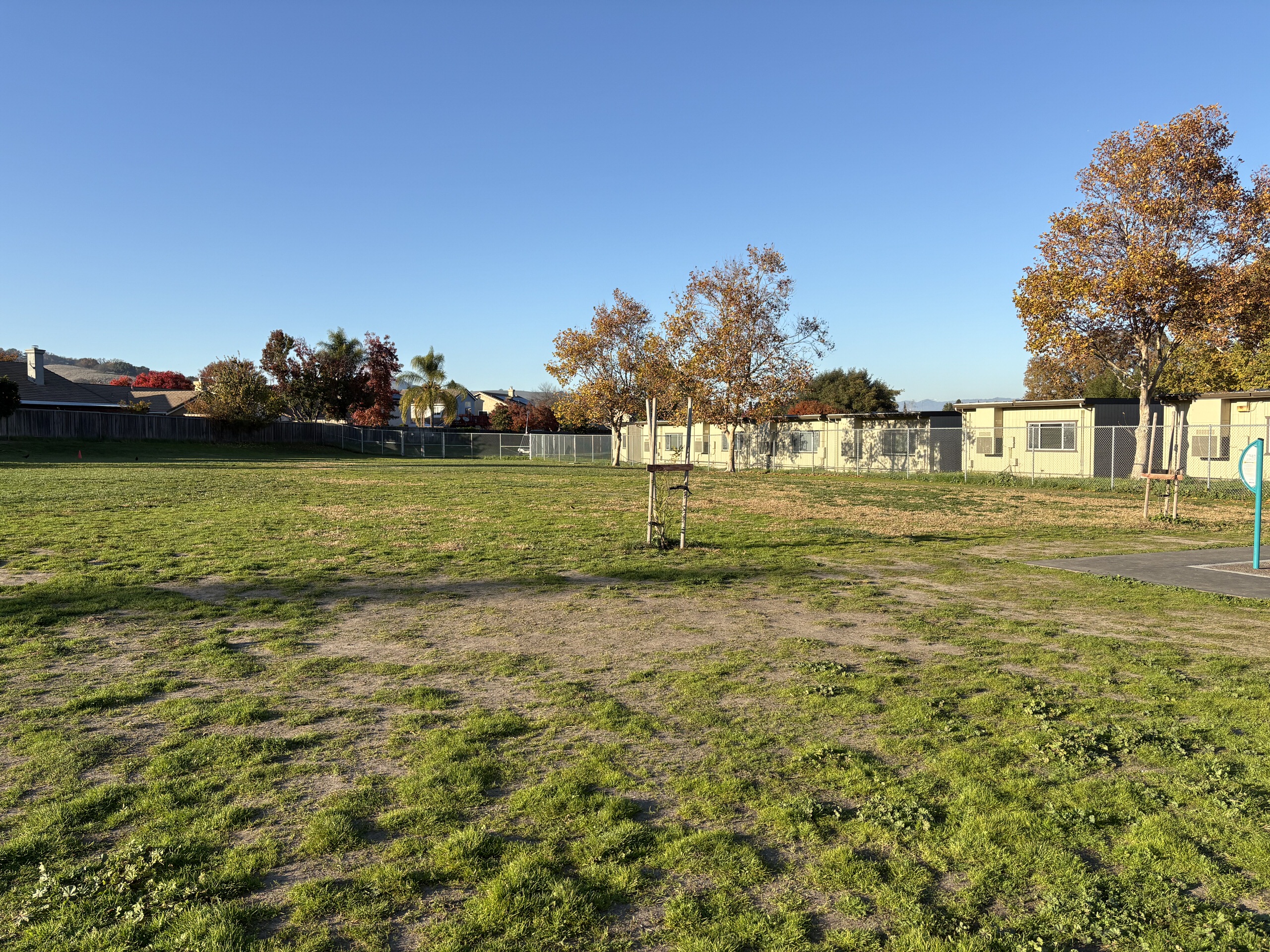 Luigi Aprea Elementary School consists of single-story stucco buildings connected by covered breezeways, with the administration building fronting the main parking lot along Calle Del Rey. Five permanent classroom buildings are arranged behind the administration building to form a central learning courtyard composed of grass areas, concrete walkways, and seating. While the campus layout is cohesive and functional, many portable buildings and site amenities exhibit signs of aging. Recent investments, including roof replacement, fencing upgrades, and playground improvements, demonstrate ongoing efforts to maintain a safe and organized school environment.
