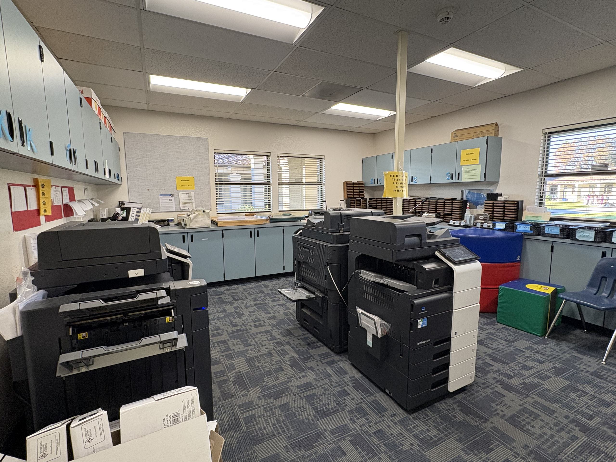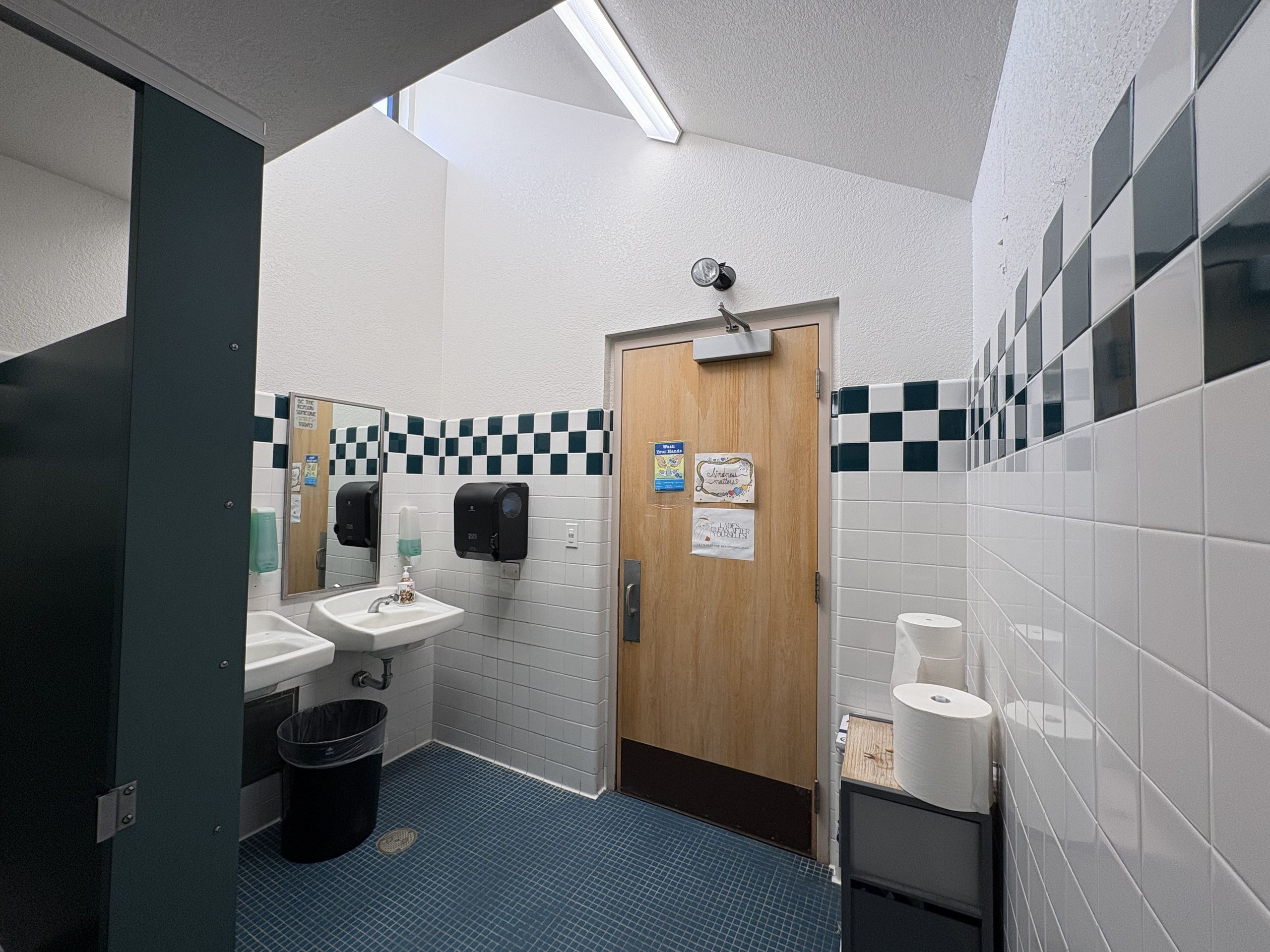 The approach to the administration building features a colorful mural and a landscaped entry patio with large shade trees. Inside, visitors enter a lobby and reception area, leading to a corridor that provides access to the principal’s office, staff restrooms, nurse’s office, storage rooms, and staff lounge/workroom. Staff restrooms exhibit multiple accessibility deficiencies. The staff lounge and workroom contain ample storage and a private outdoor patio, but the furnishings, casework, and appliances are outdated and in poor condition.