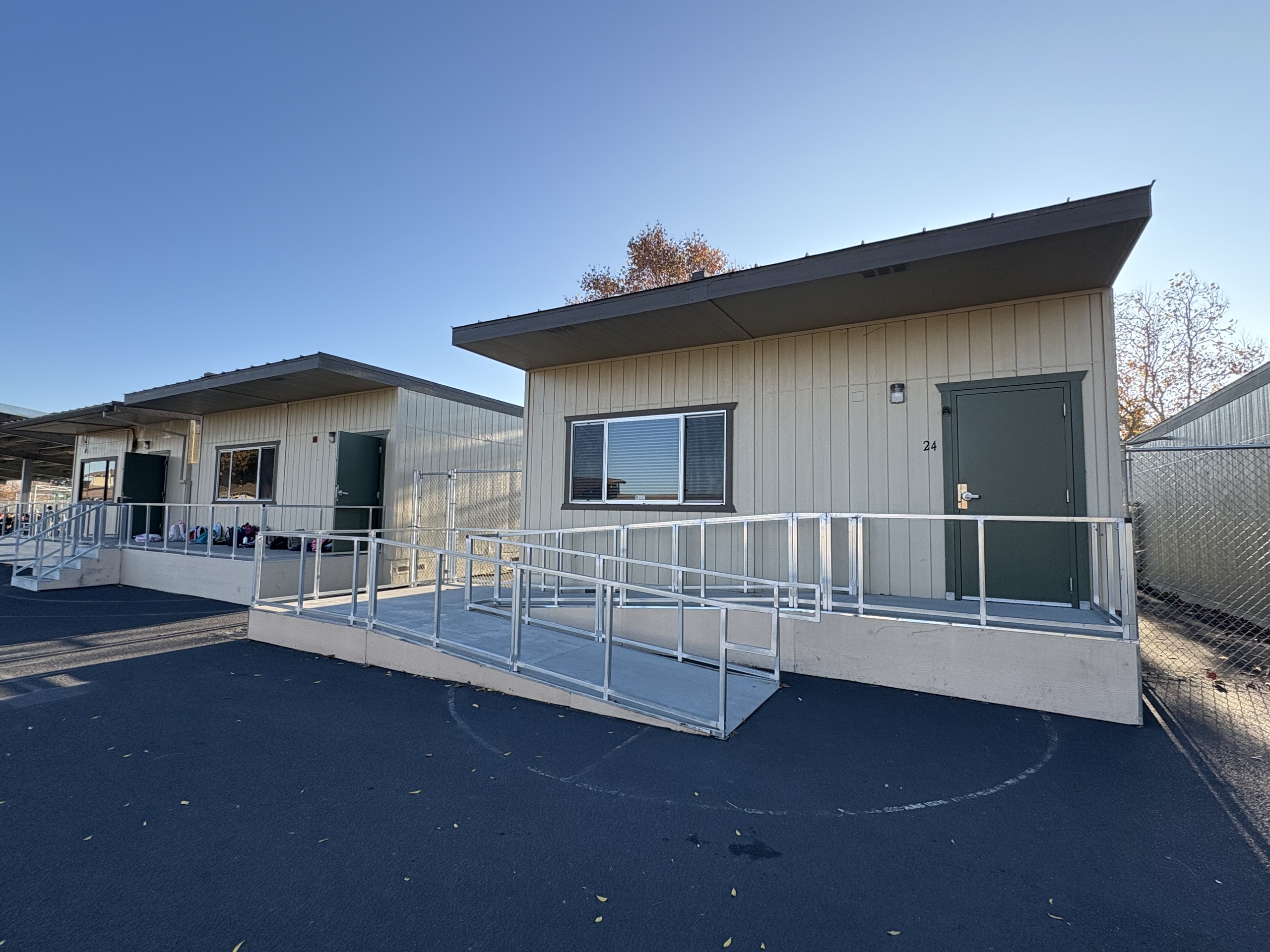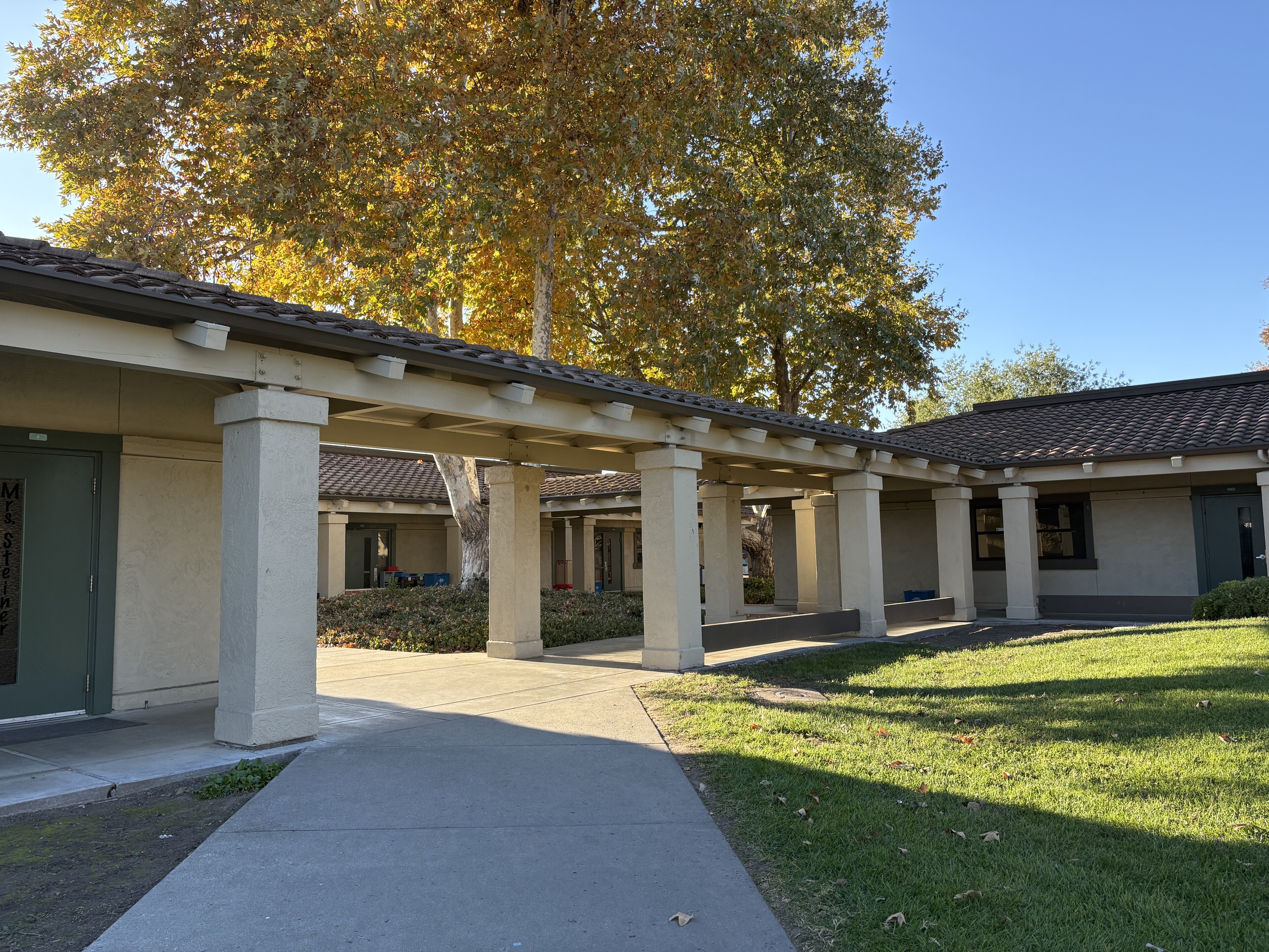 Kindergarten programs occupy one permanent classroom building and several portable classrooms, with the play yard situated between them. The permanent classroom building features a shaded exterior walkway and connects to a courtyard shared with Classroom Building C, which benefits from mature tree cover. Kindergarten classrooms do not include dedicated restrooms, so students need to use the portable building which is a supervision concern.