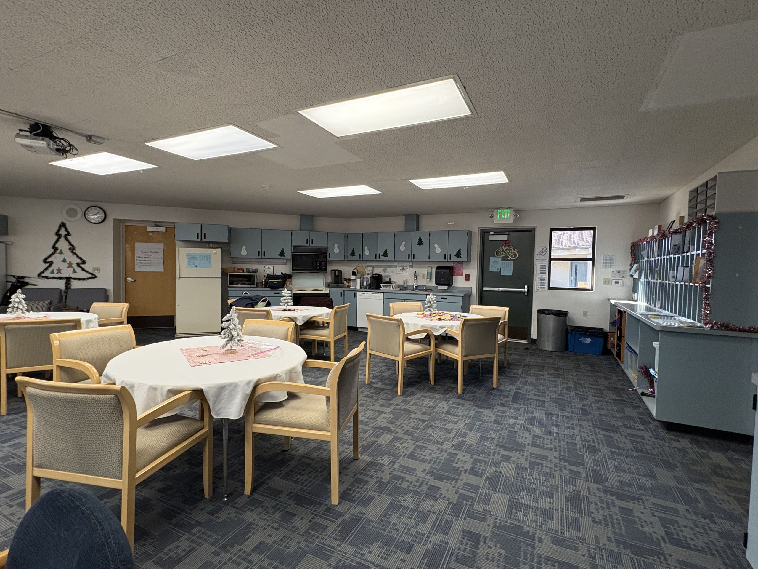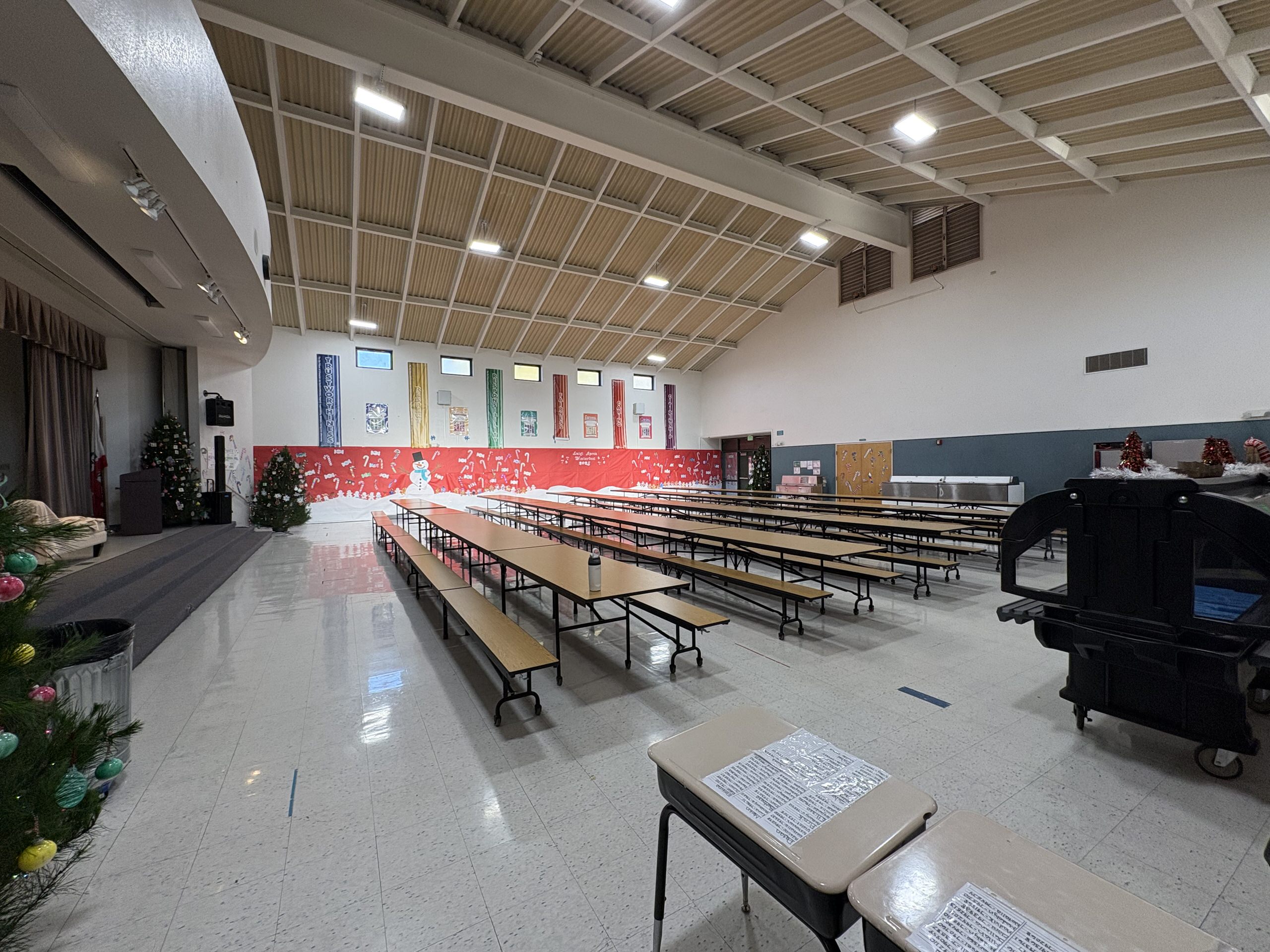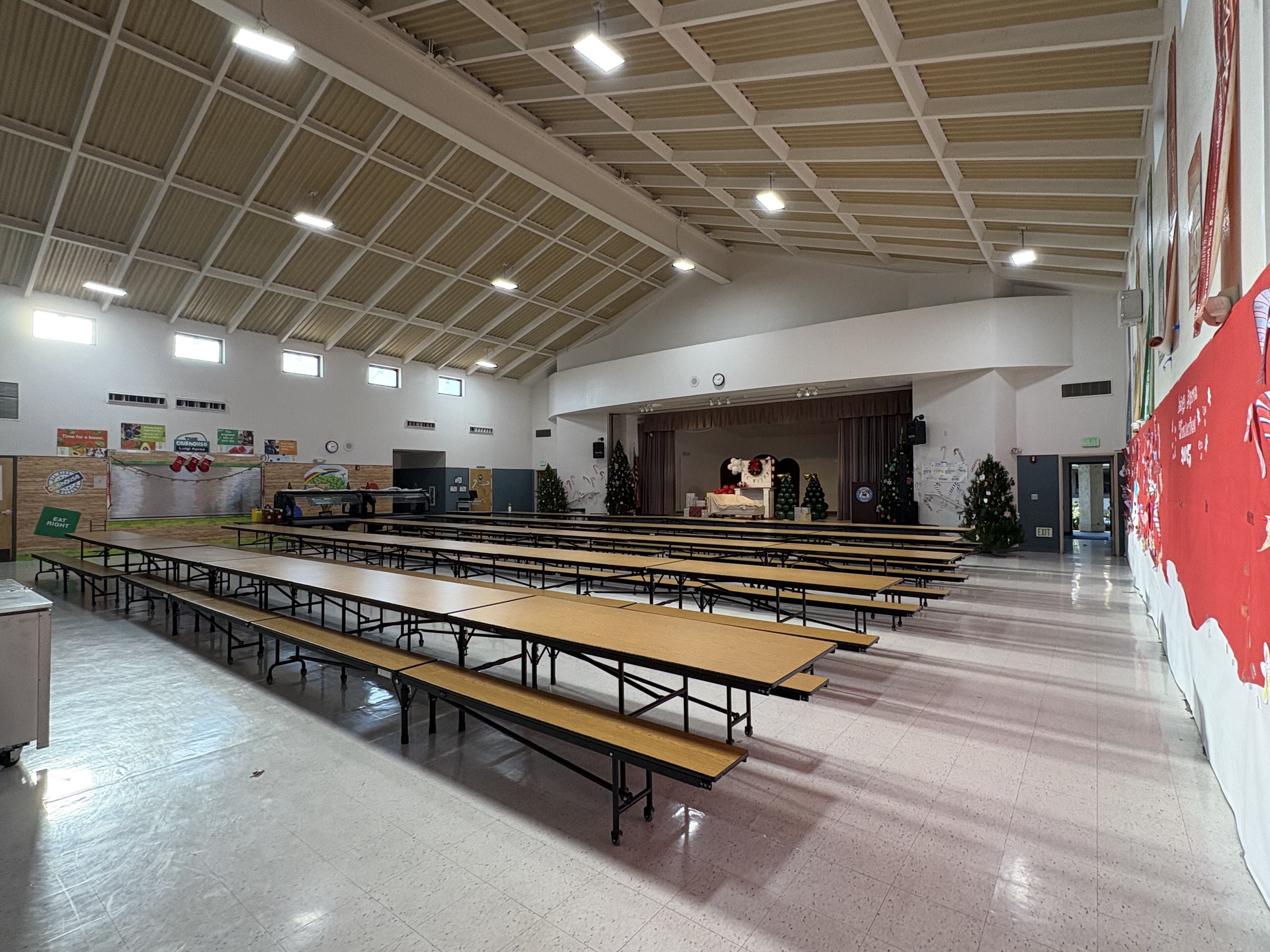 The faculty workroom overlooks the learning courtyard and connects to the multi-purpose room. The multi-purpose room includes high ceilings, clerestory windows, a kitchen, wall-stored lunch tables, and a stage with stair access. While the building remains functional and in generally good condition, furnishing is outdated. Cosmetic improvements to the administration lobby are desired.