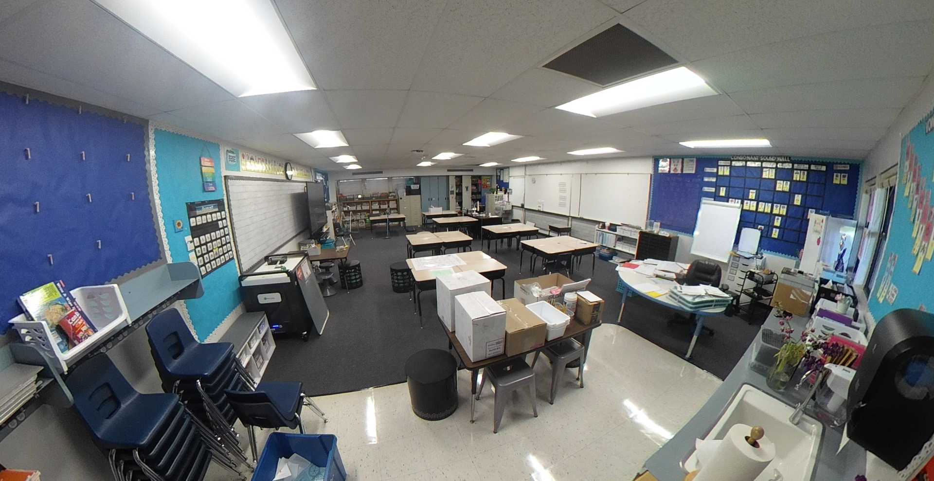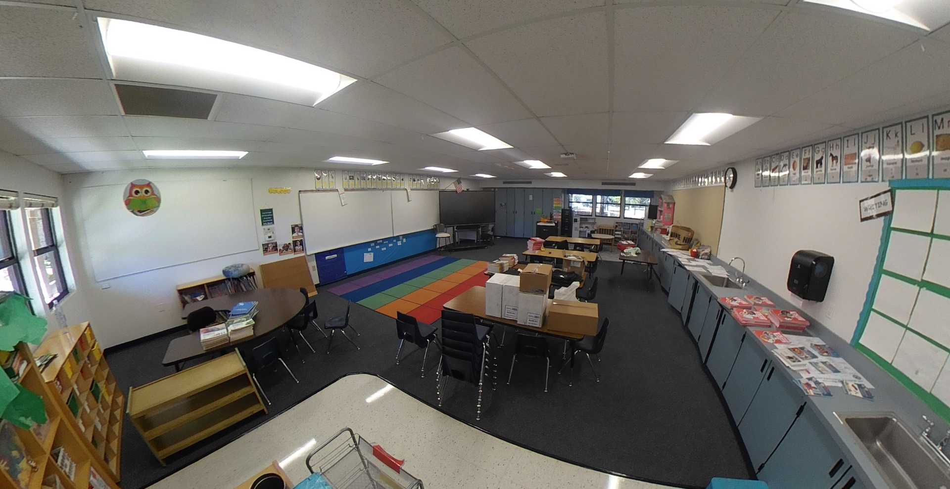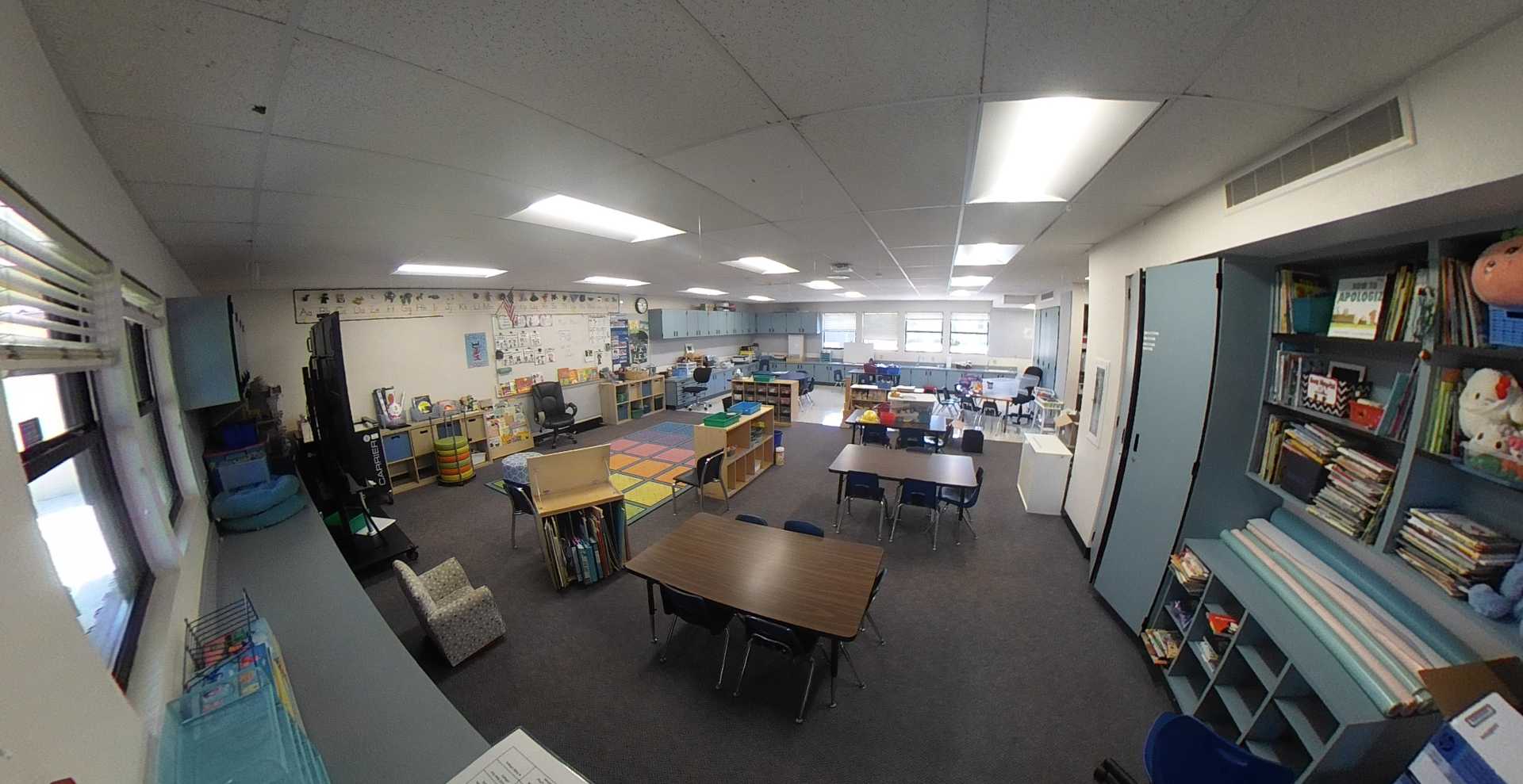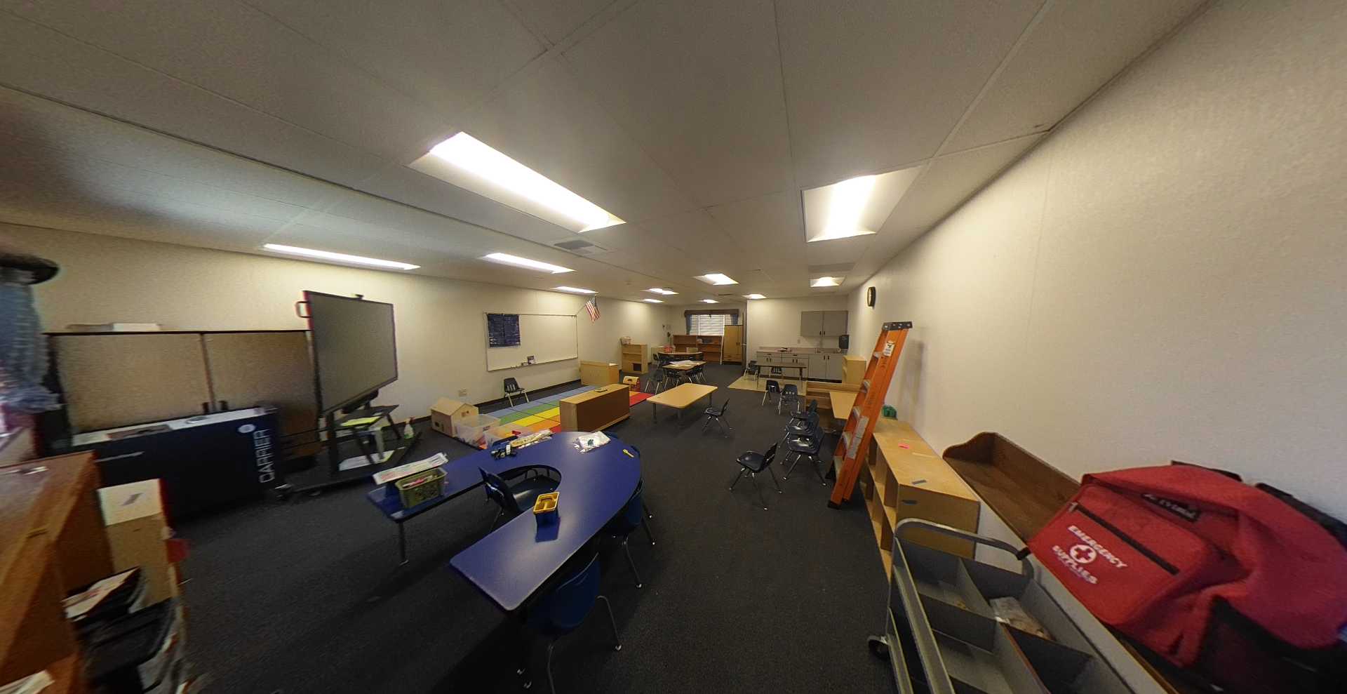 The portable classrooms situated along the blacktop perimeter are in poor condition, including damaged tackable wall surfaces, stained ceiling tiles, aging windows, and worn carpet. Several are programmed for daycare and afterschool programs, and one portable functions as an informal storage space.