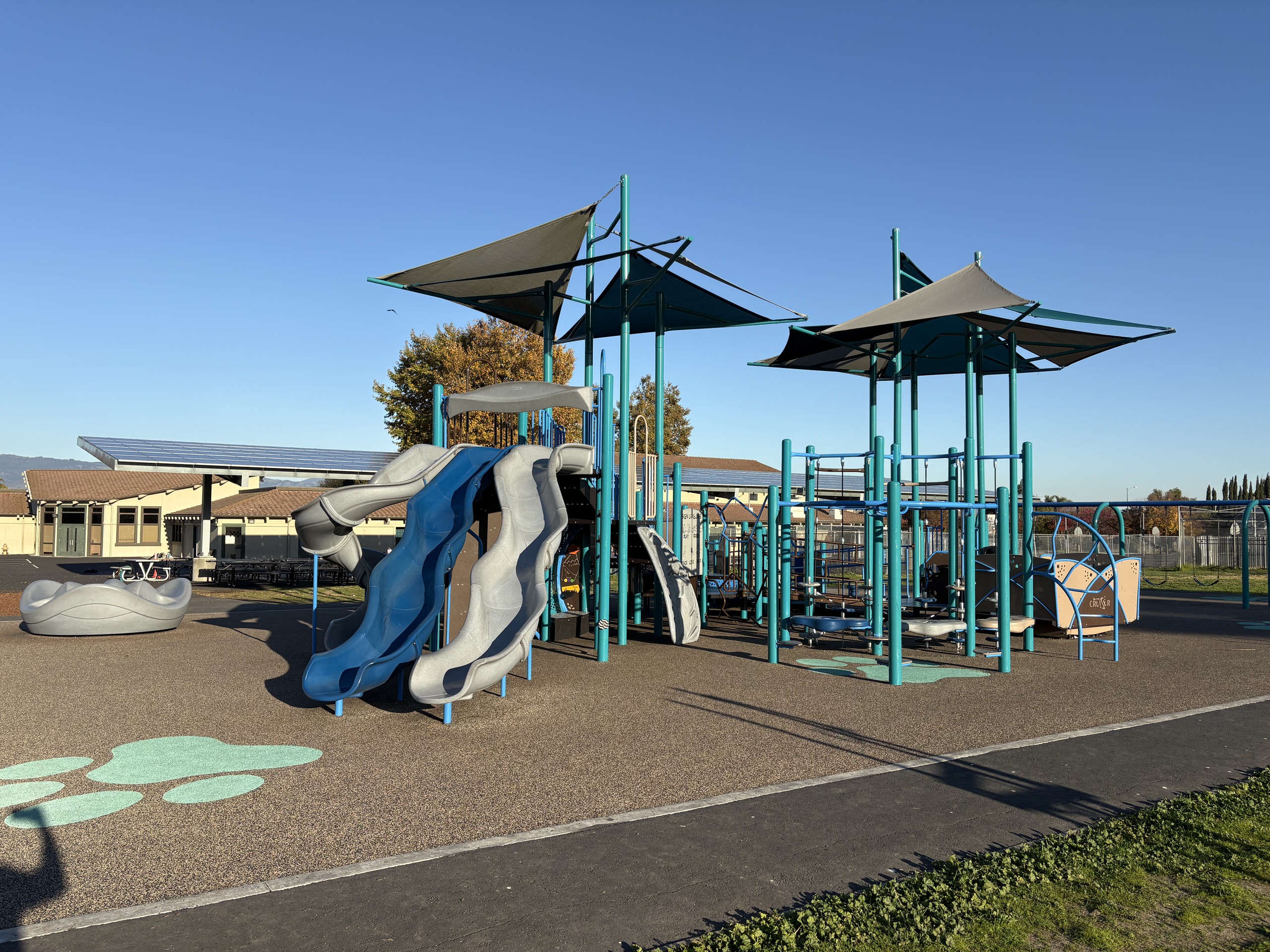 The campus includes a central courtyard framed by permanent classroom buildings, with pedestrian pathways leading to the kindergarten play yard, multi-purpose building, and hardscape play areas. Mature trees, lawn areas, and shaded seating are dispersed around the site perimeter. The play yard features a large solar shade structure, an upper-grade play structure, and a grass field. Although perimeter landscaping is well irrigated, the main field contains multiple yellowing patches. The blacktop was recently resurfaced but already shows cracking and minor depressions.